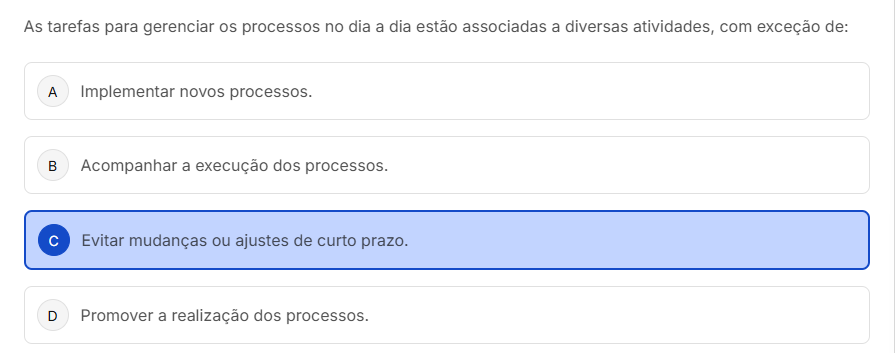 As tarefas para gerenciar os processos no dia a dia estão associadas a diversas atividades, com exceção de: A Implementar novos processos. B Acompanhar a execução dos processos. C Evitar mudanças ou ajustes de curto prazo. D Promover a realização dos processos.