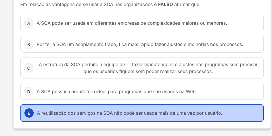 Em relação às vantagens de se usar a SOA nas organizações é FALSO afirmar que: A A SOA pode ser usada em diferentes empresas de complexidades maiores ou menores. B Por ter a SOA um acoplamento fraco, fica mais rápido fazer ajustes e melhorias nos processos. A estrutura da SOA permite à equipe de TI fazer manutenções e ajustes nos programas sem precisar C que usuários fiquem sem poder realizar seus processos. D A SOA possui a arquitetura ideal para programas que são usados na Web. E A reutilização dos serviços na SOA não pode ser usada mais de uma vez por usuário.
