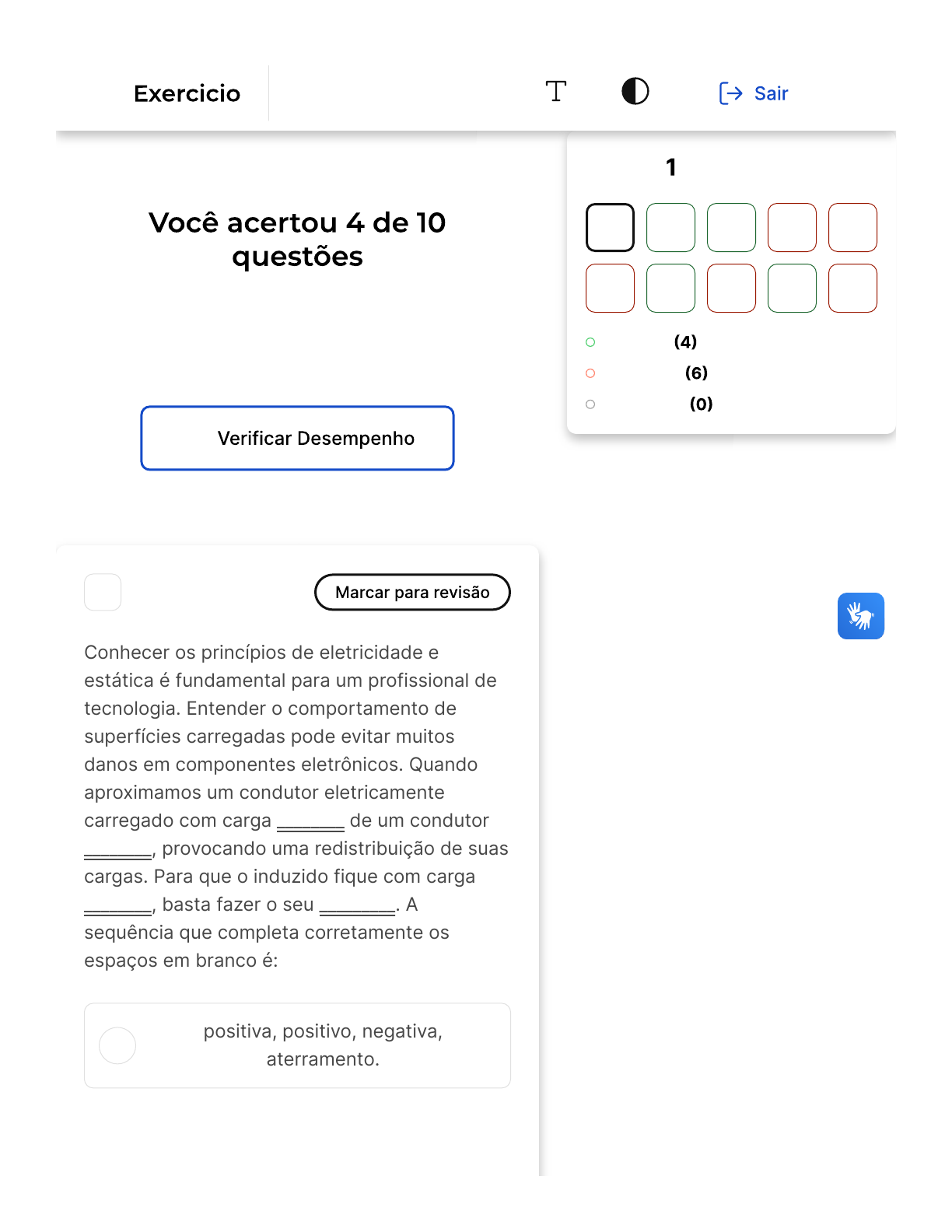 Verifique o seu desempenho e continue treinando! Você pode refazer o exercício quantas vezes quiser. A 1 Conhecer os princípios de eletricidade e estática é fundamental para um profissional de tecnologia. Entender o comportamento de superfícies carregadas pode evitar muitos danos em componentes eletrônicos. Quando aproximamos um condutor eletricamente carregado com carga ________ de um condutor ________, provocando uma redistribuição de suas cargas. Para que o induzido fique com carga ________, basta fazer o seu _________. A sequência que completa corretamente os espaços em branco é: positiva, positivo, negativa, aterramento. Questão de 10 Corretas Incorretas Em branco 1 2 3 4 5 6 7 8 9 10 Eletricidade e Magnetismo Firefox https://estacio.saladeavaliacoes.com.br/exercicio/663ea715139d33d914... 1 of 17 10/05/2024, 20:28 B C D E negativa, neutro, positivo, carregamento. positiva, neutro, negativa, aterramento. negativa, neutro, negativo, descarregamento. positiva, negativo, positivo, aterramento. Opa! A alternativa correta é a letra C. Confira o gabarito comentado! A questão aborda o conceito de indução eletrostática, um fenômeno que ocorre quando um corpo carregado é aproximado de um corpo neutro, provocando uma redistribuição de cargas neste último. No caso apresentado, quando aproximamos um condutor eletricamente carregado com carga positiva de um condutor neutro, as cargas negativas do condutor neutro são atraídas para a região mais próxima do condutor carregado, deixando a outra extremidade com carga positiva. Para que o induzido (condutor neutro) fique com carga negativa, basta fazer o seu aterramento, ou seja, conectar o condutor a terra, permitindo que as cargas positivas se escoem, deixando o condutor com carga negativa. Portanto, a sequência correta Firefox https://estacio.saladeavaliacoes.com.br/exercicio/663ea715139d33d914... 2 of 17 10/05/2024, 20:28 A B C D para preencher os espaços em branco é: positiva, neutro, negativa, aterramento. 2 Conhecer os princípios de eletricidade e estática é fundamental para um profissional de tecnologia. Entender o comportamento de superfícies carregadas pode evitar muitos danos em componentes eletrônicos. A respeito da segunda lei de Ohm, analise as afirmações: I� A resistência elétrica independe do material. II� É correto comparar resistividade elétrica e não resistência elétrica. III� A unidade de resistividade elétrica no SI é Ωm. IV� A resistência elétrica no SI é adimensional. V� Dado um material cilíndrico, quanto maior sua espessura, maior sua resistência. É correto apenas o que se afirma em: I. I, II e III. IV e V. I e II. Firefox https://estacio.saladeavaliacoes.com.br/exercicio/663ea715139d33d914... 3 of 17 10/05/2024, 20:28 E II e III. Parabéns, você selecionou a alternativa correta. Confira o gabarito comentado! As afirmativas corretas são a II e a III. A resistência elétrica, ao contrário do que é afirmado na primeira proposição, depende do material do condutor. A resistividade elétrica, que é a propriedade que um material tem de resistir ao fluxo de corrente elétrica, é uma medida mais adequada para comparações, como afirmado na segunda proposição. A unidade de resistividade elétrica no Sistema Internacional de Unidades �SI� é realmente o Ohm metro (Ωm), conforme afirmado na terceira proposição. A resistência elétrica não é adimensional, e a resistência de um material cilíndrico não aumenta com a espessura, mas sim diminui, pois a resistência é inversamente proporcional à área da seção transversal do material, conforme a equação R � ρ x L/A, onde R é a resistência, ρ é a resistividade, L é o comprimento e A é a área da seção transversal. 3 Firefox https://estacio.saladeavaliacoes.com.br/exercicio/663ea715139d33d914... 4 of 17 10/05/2024, 20:28 A B C D E Conhecer os princípios de eletricidade e estática é fundamental para um profissional de tecnologia. Entender o comportamento de superfícies carregadas pode evitar muitos danos em componentes eletrônicos. Quando dizemos que um campo magnético é sempre produzido por uma corrente elétrica ou por um campo elétrico variável, estamos enunciando: A Lei de Ohm. A lei de Ampère. O efeito Joule. A lei de Kirchhoff. A lei de Coulomb. Parabéns, você selecionou a alternativa correta. Confira o gabarito comentado! A alternativa correta é a letra B, que se refere à lei de Ampère. Esta lei estabelece que um campo magnético é sempre produzido por uma corrente elétrica ou por um campo elétrico variável. É importante diferenciar essa lei das demais opções apresentadas. A Lei de Ohm, por exemplo, Firefox https://estacio.saladeavaliacoes.com.br/exercicio/663ea715139d33d914... 5 of 17 10/05/2024, 20:28 A está relacionada à resistência elétrica. O efeito Joule, por sua vez, diz respeito à energia dispersada na forma de calor pela passagem de corrente elétrica. A lei de Kirchhoff é utilizada na resolução de circuitos elétricos por meio do uso de malhas ou nós. Por fim, a lei de Coulomb trata da força entre cargas elétricas separadas por uma dada distância. 4 Conhecer os princípios de eletricidade e magnetismo é fundamental para um profissional de tecnologia. Entender o comportamento de superfícies carregadas pode evitar muitos danos em componentes eletrônicos. A respeito de campo magnético, analise as afirmativas abaixo: I� Um campo magnético é induzido em um condutor quando o campo magnético que o circunda é alterado; II� A magnitude desse campo magnético induzido é diretamente proporcional à taxa com que varia o campo magnético externo no tempo. III� A noção de campo magnético induzido depende da direção da taxa de mudança do campo magnético no tempo. É correto apenas o que se afirma em: Apenas I. Firefox https://estacio.saladeavaliacoes.com.br/exercicio/663ea715139d33d914... 6 of 17 10/05/2024, 20:28 B C D E Apenas II. I e 
