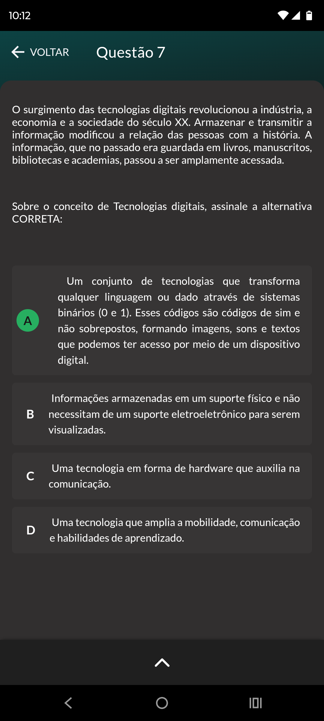 10:12 VOLTAR Questão 7 surgimento das tecnologias digitais revolucionou a indústria, a economia e a sociedade do século XX. Armazenar e transmitir a informação modificou a relação das pessoas com a história. A informação, que no passado era guardada em livros, manuscritos, bibliotecas e academias, passou a ser amplamente acessada. Sobre conceito de Tecnologias digitais, assinale a alternativa CORRETA: Um conjunto de tecnologias que transforma qualquer linguagem ou dado através de sistemas binários e 1). Esses códigos são códigos de sim e A não sobrepostos, formando imagens, sons e textos que podemos ter acesso por meio de um dispositivo digital. Informações armazenadas em um suporte físico e não necessitam de um suporte eletroeletrônico para serem visualizadas. Uma tecnologia em forma de hardware que auxilia na c comunicação. Uma tecnologia que amplia a mobilidade, comunicação D e habilidades de aprendizado.