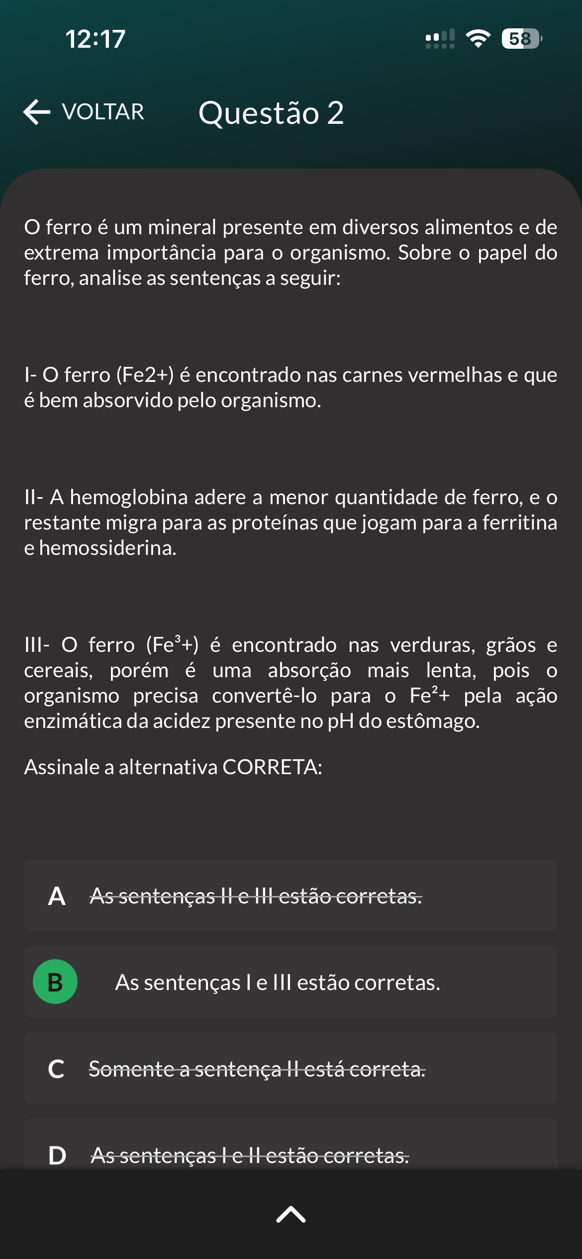 12:17 58 VOLTAR Questão 2 ferro é um mineral presente em diversos alimentos e de extrema importância para organismo. Sobre papel do ferro, analise as sentenças a seguir: I- ferro (Fe2+) é encontrado nas carnes vermelhas e que é bem absorvido pelo organismo. II- A hemoglobina adere a menor quantidade de ferro, e restante migra para as proteínas que jogam para a ferritina e hemossiderina. III- ferro (Fe³+) é encontrado nas verduras, grãos e cereais, porém é uma absorção mais lenta, pois o organismo precisa convertê-lo para Fe²+ pela ação enzimática da acidez presente no pH do estômago. Assinale a alternativa CORRETA: A As sentenças III estão corretas. As sentenças le III estão corretas. c Somente a sentença H está correta. D As sentenças le H estão corretas.
