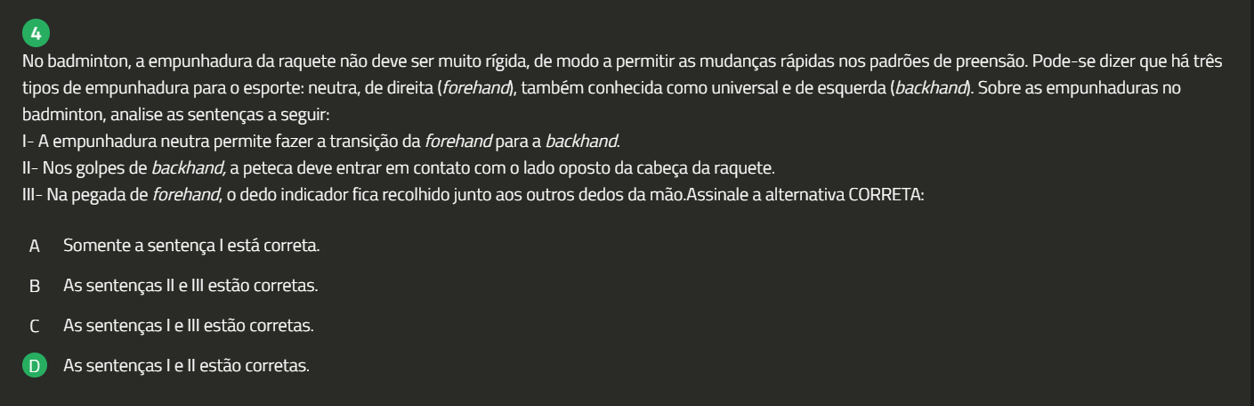 4 No badminton, a empunhadura da raquete não deve ser muito rígida, de modo a permitir as mudanças rápidas nos padrões de preensão. Pode-se dizer que há três tipos de empunhadura para 0 esporte: neutra, de direita (forehand), também conhecida como universal e de esquerda (backhand). Sobre as empunhaduras no badminton, analise as sentenças a seguir: I- A empunhadura neutra permite fazer a transição da forehand para a backhand. II- Nos golpes de backhand, a peteca deve entrar em contato com 0 lado oposto da cabeça da raquete. III- Na pegada de forehand, 0 dedo indicador fica recolhido junto aos outros dedos da mão.Assinale a alternativa CORRETA: A Somente a sentença está correta. B As sentenças e III estão corretas. C As sentenças e III estão corretas. D As sentenças le estão corretas.