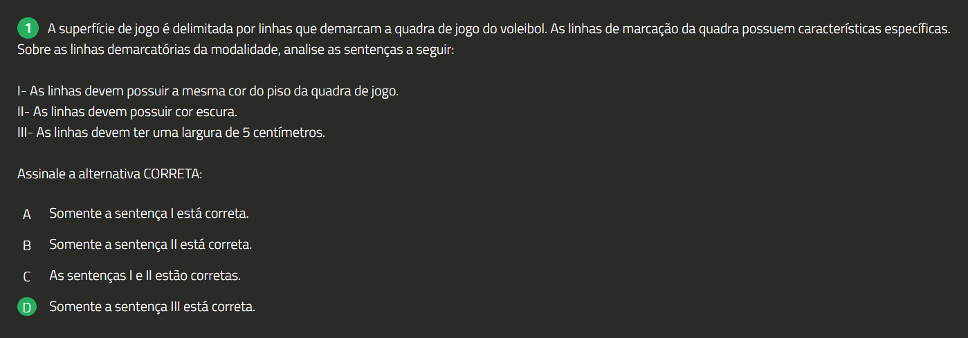 1 A superfície de jogo é delimitada por linhas que demarcam a quadra de jogo do voleibol. As linhas de marcação da quadra possuem características específicas. Sobre as linhas demarcatórias da modalidade, analise as sentenças a seguir: As linhas devem possuir a mesma cor do piso da quadra de jogo. II- As linhas devem possuir cor escura. III- As linhas devem ter uma largura de 5 centímetros. Assinale a alternativa CORRETA: A Somente a sentença está correta. Somente a sentença está correta. As sentenças e estão corretas. D Somente a sentença III está correta.