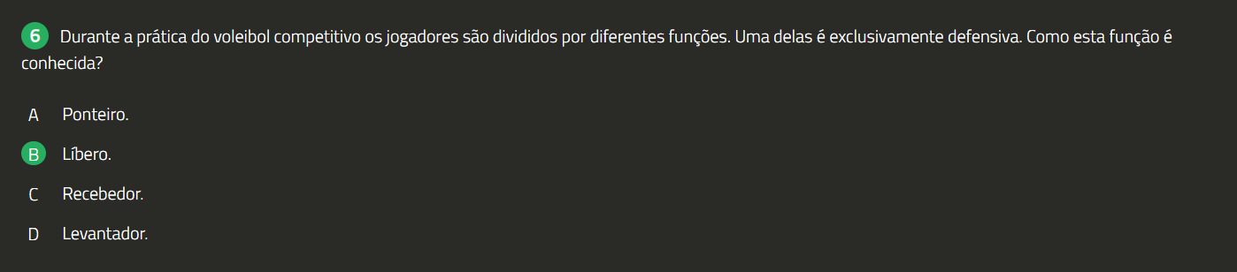 6 Durante a prática do voleibol competitivo jogadores são divididos por diferentes funções. Uma delas é exclusivamente defensiva. Como esta função é conhecida? A Ponteiro. Líbero. Recebedor. D Levantador.