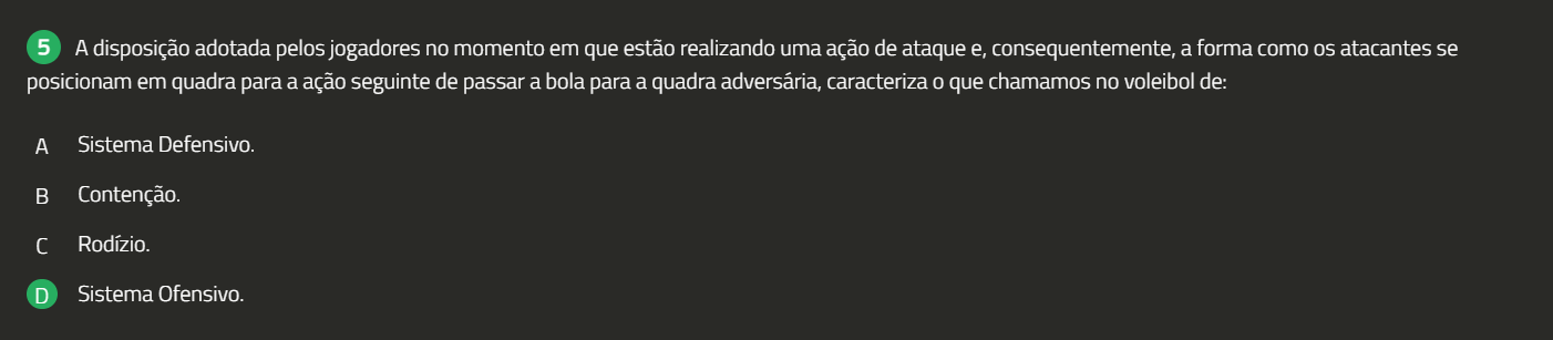 5 A disposição adotada pelos jogadores no momento em que estão realizando uma ação de ataque e, consequentemente, a forma como atacantes se posicionam em quadra para a ação seguinte de passar a bola para a quadra adversária, caracteriza 0 que chamamos no voleibol de: A Sistema Defensivo. B Contenção. Rodízio. D Sistema Ofensivo.