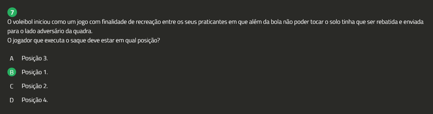 7 0 voleibol iniciou como um jogo com finalidade de recreação entre seus praticantes em que além da bola não poder tocar 0 solo tinha que ser rebatida e enviada para 0 lado adversário da quadra. 0 jogador que executa saque deve estar em qual posição? A Posição 3. Posição 1. C Posição 2. D Posição 4.