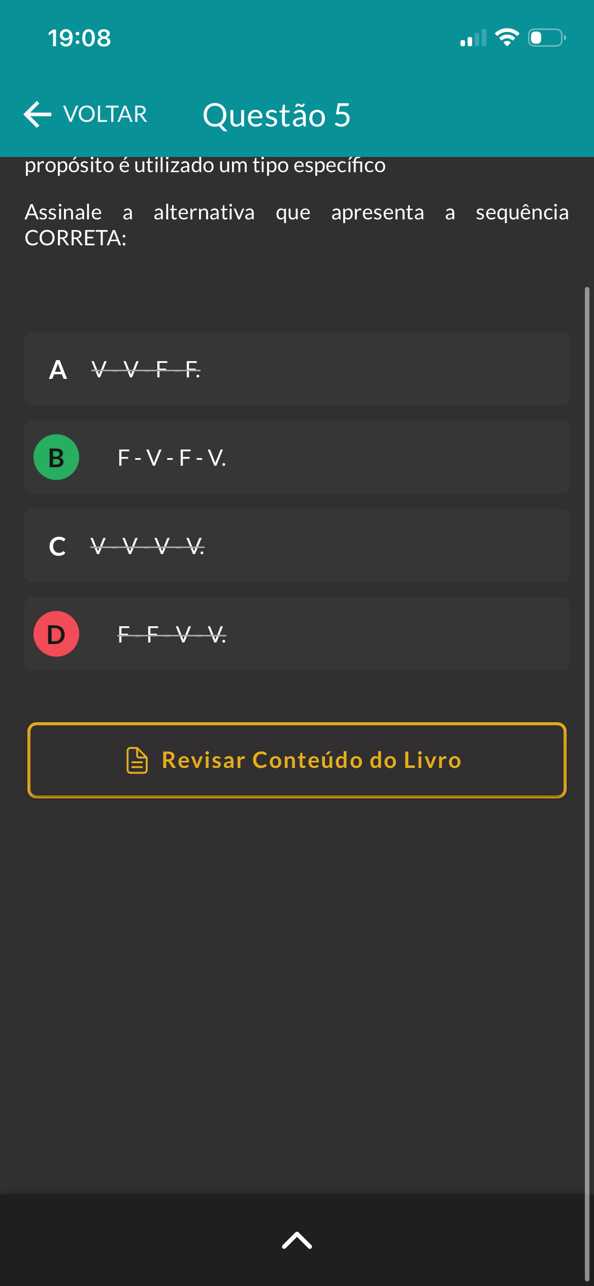 19:08 VOLTAR Questão 5 propósito é utilizado um tipo específico Assinale a alternativa que apresenta a sequência CORRETA: A B F-V-F-V. c D Revisar Conteúdo do Livro