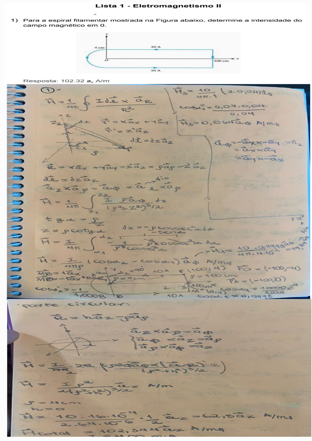 Lista 1 - Eletromagnetismo II 1) Para a espiral filamentar mostrada na Figura abaixo, determine a intensidade do campo magnético em Resposta: 102.32 A/m - H=1 0,04 22 = Co = +yay -zaz = de = 1 = = a za 1I 11 I tz LITT tgd t = 11 = dz = A/m H=I - 1 10 = I - MB= = tax Y =90 104 P (100,4) = tax 2 3 = 1,0008 B Y M 1,0008 10A parte circular: zaz I 2 = az A/m 3=4cm =62,5az 2-64-10-62) a) Um solenóide de 3 cm de comprimento é percorrido por uma corrente de 400mA. Se solenóide for utilizado para gerar uma densidade de fluxo magnético de 5 mWb/m², quantas espiras são necessárias? b) Um solenóide, de raio 4 mm e comprimento 2 cm, tem 150 espiras/m e é percorrido por uma corrente de 500 mA. Determine: (i) IHI no centro; (ii) IHI nas extremidades do solenóide. Resposta: a) 300 espiras; b) (i) H = 69.64 A/m e (II) H = 36.77 A/m Htotal 2 tgo = 3 dz = NIP2 NI 2 H az 2 a) N = N=299espiras = 37,5 centro extremidade = 37,5 =36,773) O motor elétrico, mostrado na Figura abaixo, tem campo magnetico H = 10⁶ sen A/m Calcule fluxo, por pólo, que passa através do entreferro de ar se comprimento axial do pólo é 20 cm. pólo 20 cm 50° armadura Resposta: Ф = 0.1467 W 3 SS 24) Um toroide que possui seção reta de formato retangular é definido pelas seguintes superfícies: os cilindros p = 2 e p = 3 cm, e os planos Z= 1 e Z= 2,5 cm. Pelo toroide passa uma densidade superficial de corrente de -50az A/m na superfície = 3cm. Calcule H no ponto P(p, Φ, z): (a) PA(1,5 cm, 2 cm); (b) cm, 2 cm); Pc(2,7 cm, п/2, 2 cm); (d) cm, π/2, 2 cm). Respostas: a) nulo, b) H = 71,39 A/m, c) A/m d) A/m (p=3cm) x a) = = = H = 2,1 c) H = = 2n.2,7 Iens = = H=05) A intensidade de campo magnético é dada em certa região do espaço como H = [(x +(2/z)a₂ A/m. (a) Calcule V X H. (b) Calcule J. (c) Use J para encontrar a corrente total que passa pela superfície Z = 4, 1≤ X ≤ 2, 3 ≤ y ≤ 5, na direção az. (d) Mostre que mesmo resultado é encontrado utilizando outro lado do teorema de Stokes. Resposta: a) = 2(x + 2y)/z³ + 1/z² A/m; b) J = 2(x + 2y)/z³ + 1/z² A/m c) / = 1/8 A; d) / = 1/8 A ds =I 5 1 a ax 1 ax 0 T 5 3 2 All 16 8 5 3 d) I = S + dy 16 + 16 3 I = = All6) Seja N = 1.000, 1 = 0,8 A, Po = 2 cmea = 0,8 cm para toroide mostrado na Figura abaixo. Calcule Vₘ no interior do toróide se Vₘ = 0 em p = 2,5 cm, = 0,3л. Mantenha dentro da faixa 07) (Sadiku - 7.34) Prove que potencial magnético escalar em (0,0,z) devido à uma espira circular de raio a é Vₘ = 1 + 7- calcular Hespira O: = = haz r'= * em 1R = +haz mente cancela = I az h2) -as I + = az = az Vm = I tgd 2 S 02 dz 3 N N send = = da J=0 - Vm = = 2 S- Vm= I 2 2 Vm=0: = I +K + a X K=I Vm I All 2 88) Considere A = Wb/m em certa região do espaço livre. (a) Calcule H e B. (b) Calcule J. (c) Use J para encontrar a corrente total que atravessa a superfície em 0 ≤ (d) Use valor de em para calcular para p=1ez=0. Resposta: a) = Wb/m², b) H = A/m; c) I = -500 MA, d) = -500 MA. = 3 N = a az 50p2 = 100 b) 2 = I = = 1/3 200 Фе az 40 az as Mo Itotal = 200 . = -200 1 11 2π 2π Itotal = 100 + 40 Itotal =9) Uma linha de transmissão plana consiste em dois planos condutores de largura b separados por d metros no ar, pelos quais circulam correntes iguais e opostas de / A. Se b d, encontre a força de repulsão por metro de comprimento entre dois condutores. Resposta: F = - 2b 9 2 campo por um plano (-Ho)b: = b = Ho = H= x>0 H2 -Hoax, 2 H K=I 1 b Mo 2b N/m 2b10) (Sadiku 8.11) Uma linha de transmissão trifásica consiste de três condutores que são suportados nos pontos A, e C, formando um triângulo equilátero, como mostrado na figura. Em determinado instante, tanto condutor A quando B, sao percorridos por uma corrente de 75 A, enquanto o condutor é percorrido pela corrente de retorno de 150 A. Determine a força por metro sobre o condutor nesse instante. 150 A c Resp: F = 1.949ax mN/m 2b 2b - FCB = 2m V3 150A 2 2 B = = FCB N/m 150-75-10 2 = 2 Fctotal = 3 211) Calcule H em um material onde a) = 4.2, no qual existem átomos/m³ e cada átomo tem um momento de dipolo de ay A m²; b) M = 270 A/m e = H/m c) X = 0.7 e = T d) Calcule M em um material onde existem densidades superficiais de corrente ligada de A/m e -9az A/m em p = 0.3 m e 0.4 m, Resp: (a) H = 0.22 A/m, (b) H =456 A/m, (c) H = 936 az kA/m e (d) M = 3.6/p аф A/m (0.3 0.4) 11 B + = = Xm S de = Itotal = I + Ib M = N a) 2,7 10 29 30 10 ay A/m 7,02.10 = 3,2 b) Mr = 2.10 1,59 H = 456, 43 Almn c) = 1,7 M d) =0 -0,3 = z 3,6- = az A/m I12) (Sadiku 8.20) Um cilindro condutor infinitamente longo, de raio a e de permeabilidade está colocado ao longo do eixo Z. Se o condutor é percorrido por uma corrente I, uniformemente distribuída, ao longo de az determine: a) M b) Jb para 013) Determine a energia armazenada por unidade de comprimento no campo magnético interno de um fio retilíneo infinitamente longo de raio a, pelo qual circula uma corrente I. Resposta: Wₘ L = 16π J/m 13 H a 2 Wm = e14) (Hayt 8.31) Um toróide é construído de um material magnético e possui área da seção reta de 25,5 cm² e um comprimento efetivo de 8 cm. Existe também um pequeno gap de ar de 0,25 mm de comprimento e uma área efetiva de 2,8 cm². Uma fmm de 200 Ae é aplicada ao circuito magnético. Calcule o fluxo total no toróide se material magnético: (a) tem uma permeabilidade infinita; (b) é considerada linear, com = 1.000. Resp: (a) Ф = Wb (b) 2.61x10⁻⁴ Wb 14 l=8cm R emédio F=200 Ae 5.4 Rg a) Rg = 0,71 M b) R= = 8-10 -2 = 0,025M15) (Hayt - 8.33) Um núcleo toroidal tem uma seção reta quadrada, 2.5 cm 0, calcule: (a) (b) (c) (d) Repita para Z (e) Calcule Ф total. Resp: (a) = 23.9/p A/m, (b) = (c) = 5.0x10⁻⁷ Wb (d) = 23.9/p A/m, = Wb/m²e = 5.0x10⁻⁷ Wb (e) = 15 = 10 na 0,5 3,5 p(cm) 2 -93 a) = = He = = A/m 3 = 0,3 is Ф 3 B = 3 =16) (Hayt-8.38) Um núcleo toroidal tem uma seção reta retangular definida pelas superfícies p = 2 cm, p = 3 cm, Z = 4 cm e Z = 4.5 cm. material do núcleo poss