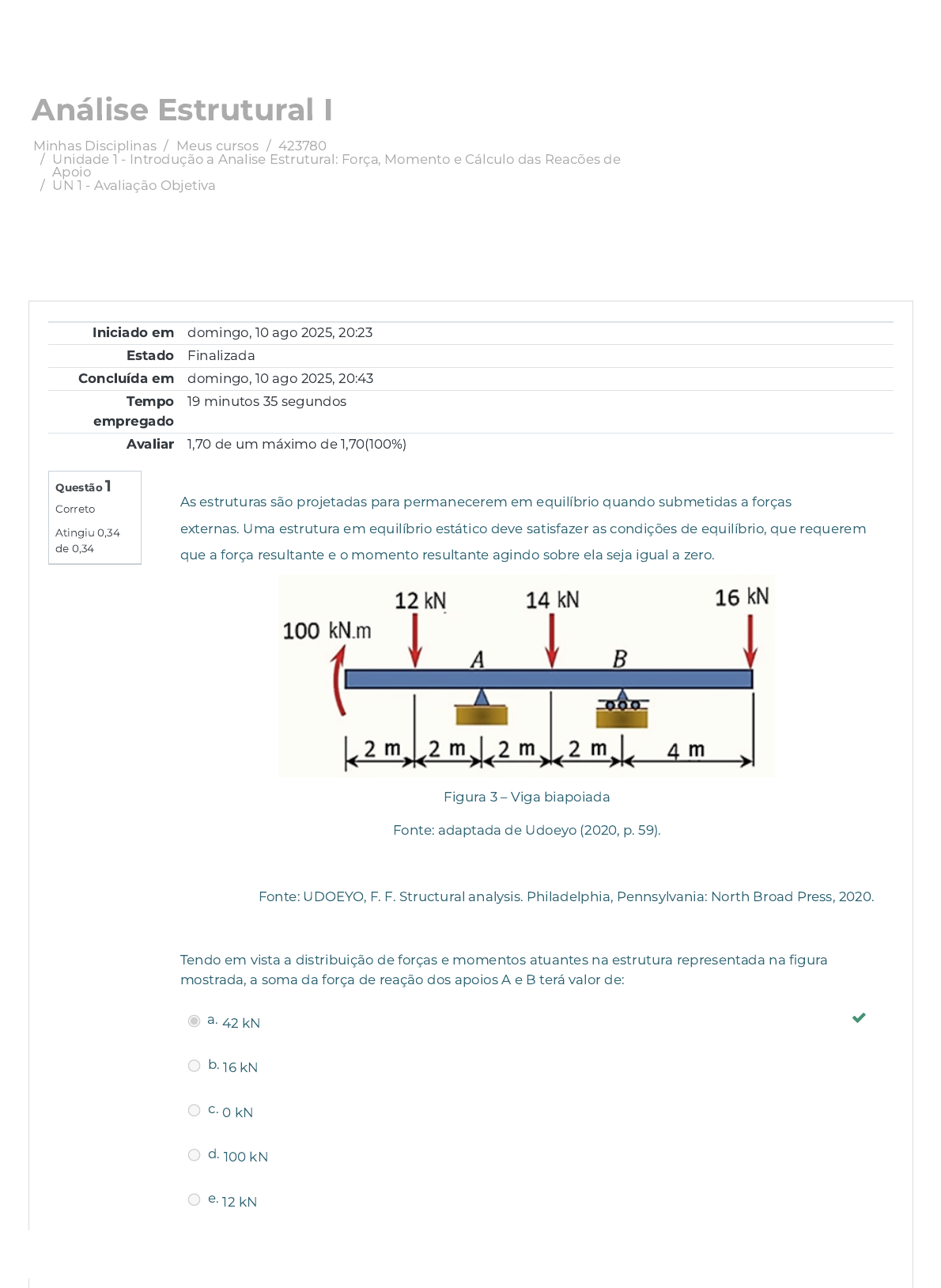 Minhas Disciplinas / Meus cursos / 423780 / Unidade 1 - Introdução a Analise Estrutural: Força, Momento e Cálculo das Reacões de Apoio / UN 1 - Avaliação Objetiva Análise Estrutural I Questão 1 Correto Atingiu 0,34 de 0,34 Iniciado em domingo, 10 ago 2025, 20:23 Estado Finalizada Concluída em domingo, 10 ago 2025, 20:43 Tempo empregado 19 minutos 35 segundos Avaliar 1,70 de um máximo de 1,70(100%) As estruturas são projetadas para permanecerem em equilíbrio quando submetidas a forças externas. Uma estrutura em equilíbrio estático deve satisfazer as condições de equilíbrio, que requerem que a força resultante e o momento resultante agindo sobre ela seja igual a zero. Figura 3 – Viga biapoiada Fonte: adaptada de Udoeyo (2020, p. 59). Fonte: UDOEYO, F. F. Structural analysis. Philadelphia, Pennsylvania: North Broad Press, 2020. Tendo em vista a distribuição de forças e momentos atuantes na estrutura representada na figura mostrada, a soma da força de reação dos apoios A e B terá valor de: a. 42 kN b. 16 kN c. 0 kN d. 100 kN e. 12 kN https://avap.multivix.edu.br/my/ https://avap.multivix.edu.br/course/view.php?id=36289 https://avap.multivix.edu.br/course/view.php?id=36289§ion=2 https://avap.multivix.edu.br/mod/quiz/view.php?id=1960705 Questão 2 Correto Atingiu 0,34 de 0,34 Na figura a seguir há um bloco de concreto com peso igual a 100 N, sustentado por dois cabos de aço iguais, fixados na laje. Para que o bloco permaneça em equilíbrio estático, é necessário que o somatório das forças atuantes sobre ele seja zero. Figura 6 – Bloco de concreto com formato quadrado pendurado por dois cabos de aço Fonte: elaborada pelo autor (2022). Para manter o bloco de concreto em equilíbrio, o valor da força T que atua tracionando cada cabo de aço será de aproximadamente: a. 50,0 N b. 140,6 N c. 60,5 N d. 70,7 N e. 100,0 N Questão 3 Correto Atingiu 0,34 de 0,34 Uma viga deve satisfazer as condições de equilíbrio que requerem que a força e o momento resultante agindo sobre ela seja igual a zero. Atuando sobre a viga em equilíbrio, observa-se uma carga distribuída e uma concentrada. Desconsidere o peso da viga. Figura 5 – Viga engastada Fonte: Adaptada de Udoeyo (2020, p. 59). Fonte: UDOEYO, F. F. Structural analysis. Philadelphia, Pennsylvania: North Broad Press, 2020. É correto afirmar que a força de reação horizontal Ax, exercida pelo apoio A terá valor igual a: a. 4,14 kN b. 8,22 kN c. 16,18 kN d. 2,34 kN e. 23,13 kN Questão 4 Correto Atingiu 0,34 de 0,34 Uma força F, com valor de 10kN atua por meio do ponto B sobre a barra. O braço de alavanca é igual a 2m, ou seja, distância da linha de ação da força até o ponto de apoio. Figura 2 – Haste metálica submetida a uma força F e a um momento M. Fonte: Elaborada pelo autor (2022). O momento em relação ao apoio causado pela força F será de: a. 20 kN.m b. 20 N.m c. 20000 kN.m d. 5 kN.m e. 0,2kN.m Questão 5 Correto Atingiu 0,34 de 0,34 Observe a figura a seguir. Há uma caixa de pedras com peso igual a 500 N sustentada por dois cabos iguais, fixados nas superfícies indicadas. Para que a caixa permaneça em equilíbrio estático, é necessário que o somatório das forças atuantes sobre ela seja zero. Figura 7 – Bloco de concreto com formato quadrado pendurado por dois cabos de aço Fonte: elaborada pelo autor (2022). O valor da força T que atua tracionando o cabo “B” será de aproximadamente: a. 500,5 N b. 500,0 N c. 1414,0 N d. 250,0 N e. 707,1 N ◄ Conteúdo Online Seguir para... Conteúdo Online ► https://avap.multivix.edu.br/mod/scorm/view.php?id=1960704&forceview=1 https://avap.multivix.edu.br/mod/scorm/view.php?id=1960706&forceview=1