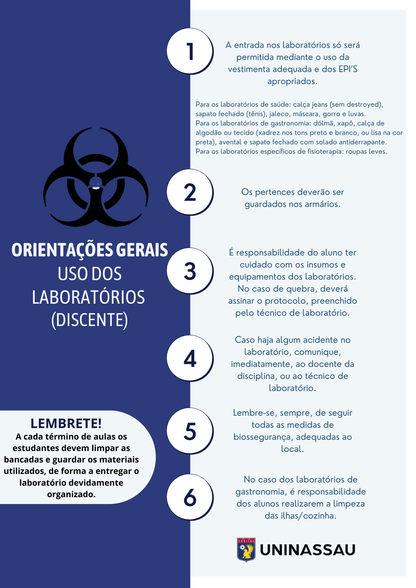 1 A entrada nos laboratórios só será permitida mediante USO da vestimenta adequada e dos EPI'S apropriados. Para os laboratórios de saúde: calça jeans (sem destroyed), sapato fechado (tênis), jaleco, máscara, gorro e luvas. Para os laboratórios de gastronomia: dólmã, xapô, calça de algodão tecido (xadrez nos tons preto e branco, lisa na cor preta), avental e sapato fechado com solado antiderrapante. Para os laboratórios específicos de fisioterapia: roupas leves. 2 Os pertences deverão ser guardados nos armários. ORIENTAÇÕES GERAIS É responsabilidade do aluno ter USO DOS 3 cuidado com os insumos e equipamentos dos laboratórios. LABORATÓRIOS No caso de quebra, deverá assinar protocolo, preenchido (DISCENTE) pelo técnico de laboratório. Caso haja algum acidente no 4 laboratório, comunique, imediatamente, ao docente da disciplina, ao técnico de laboratório. Lembre-se, sempre, de seguir LEMBRETE! 5 todas as medidas de A cada término de aulas os biossegurança, adequadas ao estudantes devem limpar as local. bancadas e guardar os materiais utilizados, de forma a entregar laboratório devidamente No caso dos laboratórios de organizado. 6 gastronomia, é responsabilidade dos alunos realizarem a limpeza das ilhas/cozinha. VERITAS UNINASSAU
