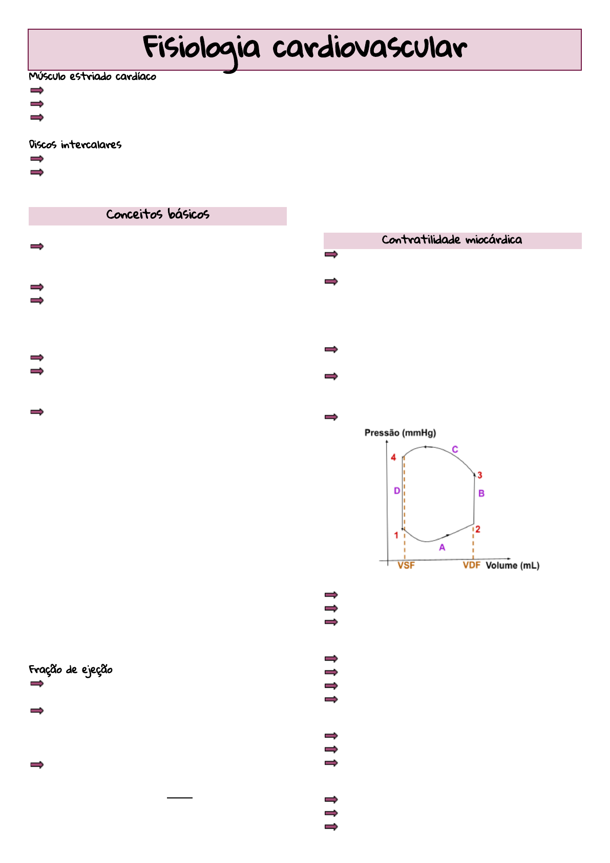 Fisiologia cardiovascular Músculo estriado cardíaco Atrial Ventricular Fibras excitatórias e condutoras Discos intercalares Separam células musculares (conectadas em série) Junções comunicantes permeáveis (junções abertas) Conceitos básicos Pré-carga Força favorável a ejeção (faz com que a fibra se distenda mais, de modo que ocorra uma contração mais forte) O aumento da pré-carga favorece a ejeção Quanto maior a pré-carga, mais fácil o ventrículo pode trabalhar Pós-carga Pressão fisiológica nas artérias Pressão contra a qual o coração tem que bombear (força que tem que ser vencida pela contração ventricular para que o sangue seja ejetado na artéria) Força de ejeção deve ser MAIOR que a pós-carga (o contrário é incompatível com a vida) Hipertensão: aumento da pós-carga, de modo que o coração tenha que fazer uma força maior de contração, causando hipertrofia do músculo cardíaco VDF - Volume diastólico final: é o volume de sangue dentro do ventrículo no final da diástole (o quanto chega de sangue nos ventrículos quando este termina o relaxamento) VSF - Volume sistólico final: é o volume residual após a ejeção do sangue na sístole ventricular Pressão diastólica final: pressão que o volume total de sangue que preenche os ventrículos na parede desta câmara ao final da diástole Fração de ejeção Utilizado para que o cardiologista análise a saúde do coração Fração de ejeção: é a relação entre o quanto o ventrículo recebeu de sangue proveniente do átrio (VDF) e o quanto de sangue ele efetivamente mandou para a circulação (VSF) E com isso, pode-se fazer a seguinte relação matemática: 𝐹𝐸 = 𝑉𝑆𝐹 𝑉𝐷𝐹 Volume ejetado (VE): é a mesma coisa que volume sistólico (VS) e débito sistólico (DS). Volume de sangue que foi ejetado a cada sístole O volume ejetado pode ser interpretado também como a diferença entre o quanto de sangue o ventrículo recebeu (VDF), com o quanto restou na câmara após a sístole (VSF) Débito sistólico = volume diastólico final - volume sistólico final DS = VDF - VSF Contratilidade miocárdica Contratilidade é uma medida de performance do coração em uma dada pré-carga e pós-carga Também pode ser dito que a contratilidade é a mudança na força isométrica de pico (na pressão isovolumétrica), em um dado comprimento inicial da fibra (ou volume diastólico final). Associa-se à velocidade de contração do miocárdio É uma função das interações entre os filamentos de actina e miosina Resulta no aumento da VSF “independente” do VDF, matematicamente (se eu manter o VDF e diminuir a força de contração (DS), o VSF aumenta) Aumento da contratilidade (atividade simpática) Reta A: isopressórica Relaxamento “isopressórico” Diástole Reta mais baixa no gráfico Reta B: isovolumétrica Contração isovolumétrica Início da sístole Aumento da pressão Não há alteração do volume Reta C: ejeção Sístole Diminuição do volume Variação da pressão Reta D: relaxamento isovolumétrico Diástole Diminuição da pressão Não há variação do volume Lívia Francisco T28 Ponto 1: abertura das valvas atrioventriculares Ponto 2: fechamento das valvas atrioventriculares 1º Bulha cardíaca (+ intensa) Ponto 3: abertura da valva aórtica Pré-carga vence a pós-carga Ponto 4: fechamento da valva aórtica 2º Bulha cardíaca (- intensa) Observações Bulhas normofonéticas: som normal das bulhas Sopro: som do refluxo de sangue A 3º bulha não está relacionada com o fechamento das valvas, mas sim com a pressão do sangue e ocorre no início do enchimento ventricular Débito sistólico DS: volume de sangue que o ventrículo pode ejetar em batimento único (POR SÍSTOLE) FE: eficiência dessa ejeção Débito cardíaco DC: sangue total ejetado pelo ventrículo, na unidade de tempo (SÍSTOLE POR UNIDADE DE TEMPO) Estimulação autonomia x Débito cardíaco Simpático: aumento do DC (+ da força de contração + da frequência cardíaca) > aumento do DS e da fc Parassimpático: diminuição do DC (- frequência cardíaca) – Age apenas na frequência cardíaca DS = VDF - VSF DC = DS x Fc (frequência cardíaca) Aumento de pré-carga Com o aumento da pré-carga, ocorre o aumento do volume diastólico final (VDF), com aumento da força de contração e aumento do volume ejetado (VE) Com o aumento do VSF, tem-se o aumento do DS. Este aumento de débito sistólico implica em um maior volume de sangue ejetado pelo sangue a cada ciclo e isso só foi ocasionado devido ao aumento da pré-carga DS = VDF - VSF O VDF aumenta e o VSF se manteve, de forma que o DS aumente também A pressão NÃO se altera, mostrando a eficiência cardíaca, ou seja, o coração não está exercendo força a mais para ejetar mais sangue (maior potência cardíaca) Aumento de pré-carga é fisiológico Aumento da pós-carga Com o aumento da pós-carga, o VSF aumenta e o VDF se mantém Aumentar o VSF sobra mais sangue ao final da sangue, de forma que o volume ejetado diminuía O coração tem que fazer mais força, sendo menos eficiente (aumento da pressão) Aumento de pós-carga é patológico Comum em indivíduos com hipertensão arterial sistêmica (a parece do músculo hipertrofia, diminuindo o volume da câmara cardíaca, ejetando cada vez menos sangue) Lei de Frank-Starling “Lei do coração” A lei do coração é, pois, a mesma do músculo esquelético, a saber, a energia mecânica liberada na passagem do estado relaxado para o de contração depende da área das superfícies quimicamente ativas, isto é, do comprimento das fibras musculares Quanto maior o volume de sangue recebido pelo ventrículo durante a diástole, maior será o volume sanguíneo ejetado para as artérias durante a sístole – Volume de sangue, ejetado pelo ventrículo, depende do volume presente no ventrículo ao final da diástole (depende do retorno venoso) Quanto maior o volume de sangue no ventrícu
