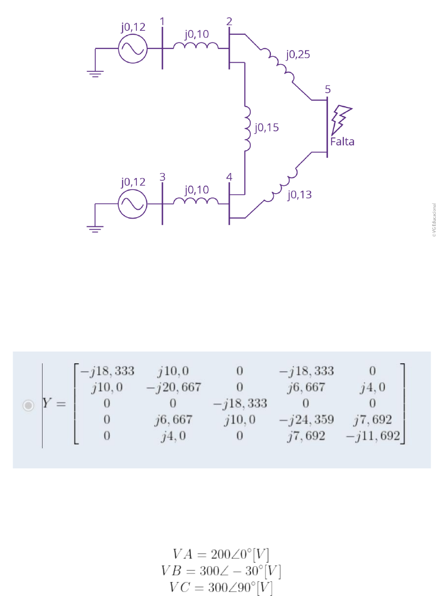 Considera-se o método de matriz de admitâncias uma forma simples de se analisar a falta no circuito de um sistema elétrico de potência. Isto porque, uma vez obtendo-se os valores de admitância, regras simples são seguidas para se criar a matriz. Analise o circuito abaixo, no qual houve uma falta na barra 5, representando as Impedâncias. Figura 5 - Diagrama unifilar Fonte: Elaborada pelo autor. #PraCegoVer: tratam-se de duas fontes geradoras, cada uma com impedância j0,12. Cada uma está conectada a uma barra. Uma fonte está conectada à barra 1, e, após esta barra, uma impedância de j0,10 entre as barras 1 e 2. A outra fonte está conectada à barra 3. Após, uma impedância de j0,10 conectada entre as barras 3 e 4. As barras 2 e 4 estão interconectadas por uma impedância j0,15. A barra 2 está conectada com uma barra 5 por uma outra impedância j0,25, e a barra 4 também está conectada com a barra 5 com outra impedância j,013. Na barra 5 houve uma falta. Assinale a alternativa que apresenta a matriz de admitância Y corretamente. R: O cálculo das componentes simétricas é utilizado em sistemas trifásicos para análise dos circuitos, especialmente referente ao sistema elétrico de potência. Assim sendo, considere o sistema elétrico trifásico, que possui as tensões abaixo, nas suas fases. Assinale a alternativa que indica corretamente as componentes simétricas. R: Uma diferença entre um transformador ideal e um transformador real se refere às perdas que ocorrem nos transformadores reais, mas são ignoradas nos transformadores ideais, em busca de uma simplificação dos cálculos, de um melhor entendimento das relações entre primário e secundário e de uma melhor didática no ensino sobre máquinas elétricas. Considerando as informações apresentadas, avalie as asserções a seguir e a relação proposta entre elas. I. A magnetização do núcleo do transformador é responsável pela criação do fluxo magnético. O circuito equivalente do transformador real deve considerar um nó que indica uma decomposição da corrente no primário, que é responsável pela magnetização do núcleo. PORQUE: II. A corrente no primário, em um transformador real, não é tratada da mesma forma que nos transformadores reais. Nos transformadores reais, a corrente no primário é decomposta em duas componentes: uma componente relacionada a uma perda no núcleo devido à impedância resistiva, e uma corrente de magnetização representada por uma reatância indutiva no núcleo. A respeito dessas asserções, assinale a opção correta. R: Diversos efeitos elétricos indesejados podem ocorrer em um condutor, o que exige que se considere no projeto valores como a impedância da linha que interliga a carga e a geração. Assim sendo, tome um gerador de 220 V que alimenta uma carga com potência de 160 kVA e fp = 0,86. A linha de transmissão tem como parâmetros de projeto R = 0,00430 Ω/km e uma indutância L = 9,59 x 10-8 H/km. Se a linha percorre uma distância de 63 km, qual é a corrente sobre a carga se ela tiver impedância de 20 Ω? R: Em um sistema elétrico trifásico, as fases são formadas por números complexos que podem ser escritos utilizando a forma polar , na qual A é o módulo e é o ângulo. No sistema elétrico de potência simétrico com 4 condutores, um detalhe muito importante é o valor do quarto condutor, um condutor Neutro. Figura 6 - Fechamento em estrela com Neutro conectado Fonte: Elaborada pelo autor. #PraCegoVer: a figura apresenta um diagrama de fechamento em estrela que representa as tensões Van, Vbn, Vcn e Vn. Considere o sistema elétrico de potência em estrela com os valores abaixo. Assinale a alternativa correta acerca da tensão no Neutro Vn. R: Leia o trecho a seguir: “Potência ativa (P): produz trabalho. A unidade é Watt (W). Potência aparente (S): potência total fornecida pela fonte (formada pelas parcelas de potência ativa e reativa). A unidade é Volt-Ampére (VA)”. CARVALHO JUNIOR, R. Instalações elétricas e o projeto de arquitetura. 8. ed. São Paulo: 2017. p. 52. Com base no apresentado, analise as asserções a seguir e a relação proposta entre elas. I. É interessante o controle dos valores de potência reativa por meio de elementos capacitivos ou indutivos. PORQUE: II. A potência aparente é formada pela soma das potências ativa e reativa, sendo então a potência fornecida pela fonte. A respeito dessas asserções, assinale a alternativa correta. R: Calcular a capacitância em linhas trifásicas simétricas pode gerar um entendimento errôneo sobre o tratamento matemático das tensões entre fases. Tome uma linha de transmissão formada por três condutores a, b e c, simetricamente distantes e instalados em forma de um triângulo equilátero, sendo cada vértice do triângulo representado por um dos condutores. Dessa forma, considerando o efeito das cargas dos três condutores das três fases, obtém- se a seguinte formulação: In (V) Em que qc é a carga do condutor c; D é a distância entre os condutores a e b; e k é a permissividade do meio. Sobre a formulação matemática apresentada, assinale a alternativa correta. R: Capacitância é o parâmetro que se origina em função da tensão entre os condutores. Essa tensão faz surgir uma diferença de potencial entre os condutores de uma linha que começam a funcionar como se fossem um capacitor. Esse parâmetro varia em função da distância e do tamanho das linhas de transmissão. Sendo assim, podemos afirmar que: R: O cálculo das componentes simétricas é utilizado em sistemas trifásicos para análise dos circuitos, especialmente referente ao sistema elétrico de potência. Assim sendo, considere o sistema elétrico trifásico, que possui as tensões abaixo, nas suas fases. Assinale a alternativa que indica corretamente as componentes simétricas. R: Projetar uma linha de transmissão de energia elétrica envolve determinar valores de grandezas elétric