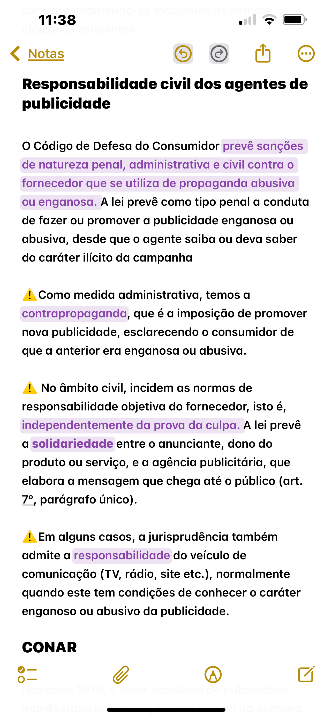 11:38 Notas Responsabilidade civil dos agentes de publicidade Código de Defesa do Consumidor prevê sanções de natureza penal, administrativa e civil contra fornecedor que se utiliza de propaganda abusiva ou enganosa. A lei prevê como tipo penal a conduta de fazer ou promover a publicidade enganosa ou abusiva, desde que agente saiba ou deva saber do caráter ilícito da campanha Como medida administrativa, temos a contrapropaganda, que é a imposição de promover nova publicidade, esclarecendo consumidor de que a anterior era enganosa ou abusiva. ! No âmbito civil, incidem as normas de responsabilidade objetiva do fornecedor, isto é, independentemente da prova da culpa. A lei prevê a solidariedade entre anunciante, dono do produto ou serviço, e a agência publicitária, que elabora a mensagem que chega até público (art. 7°, parágrafo único). ! Em alguns casos, a jurisprudência também admite a responsabilidade do veículo de comunicação (TV, rádio, site etc.), normalmente quando este tem condições de conhecer caráter enganoso ou abusivo da publicidade. CONAR A