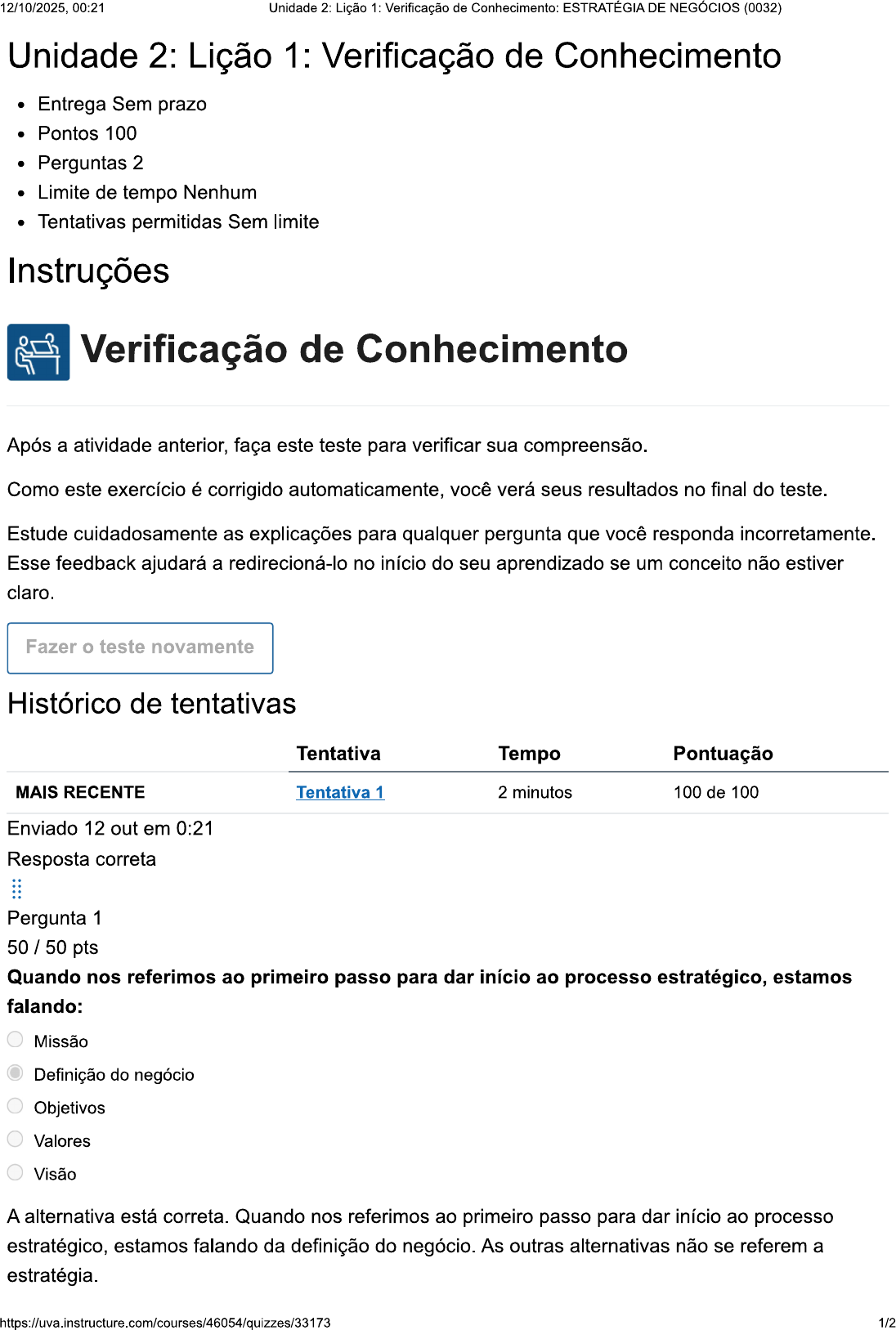 12/10/2025, 00:21 Unidade 2: Lição 1: Verificação de Conhecimento: ESTRATÉGIA DE NEGÓCIOS (0032) Unidade 2: Lição 1: Verificação de Conhecimento Entrega Sem prazo Pontos 100 Perguntas 2 Limite de tempo Nenhum Tentativas permitidas Sem limite Instruções Verificação de Conhecimento Após a atividade anterior, faça este teste para verificar sua compreensão. Como este exercício é corrigido automaticamente, você verá seus resultados no final do teste. Estude cuidadosamente as explicações para qualquer pergunta que você responda incorretamente. Esse feedback ajudará a redirecioná-lo no início do seu aprendizado se um conceito não estiver claro. Fazer teste novamente Histórico de tentativas Tentativa Tempo Pontuação MAIS RECENTE Tentativa 1 2 minutos 100 de 100 Enviado 12 out em 0:21 Resposta correta Pergunta 1 50 / 50 pts Quando nos referimos ao primeiro passo para dar início ao processo estratégico, estamos falando: Missão Definição do negócio Objetivos Valores Visão A alternativa está correta. Quando nos referimos ao primeiro passo para dar início ao processo estratégico, estamos falando da definição do negócio. As outras alternativas não se referem a estratégia. https://uva.instructure.com/courses/46054/quizzes/33173 1/212/10/2025, 00:21 Unidade 2: Lição 1: Verificação de Conhecimento: ESTRATÉGIA DE NEGÓCIOS (0032) Resposta correta Pergunta 2 50 / 50 pts primeiro passo para dar início ao processo estratégico é entender negócio da organização, sendo que a definição do seu negócio está relacionada à área em que ela atua e compete. Diante disso, definir negócio é importante para ter foco no trabalho de toda a organização. Parece fácil, mas não é! Por exemplo, considere uma empresa que trabalha na área de serviços gerais de limpeza: ela não terá como foco a manutenção, mas, sim, a limpeza, junto com propósito, a missão, a visão e os valores, os quais formam alicerce para um bom planejamento. Assim, podemos afirmar que, no geral, a informação, no contexto estratégico: É a base para o desenvolvimento de um planejamento estratégico. É uma forma de conseguir desenvolver uma estratégia rígida. É o fundamento da análise de receitas e lucros sem flexibilização. É uma forma de mudar a missão, a visão e os valores do negócio. É a base para analisar se a rigidez do mercado deu certo ou não. A informação é a base, pois ela nos permite identificar os ambientes interno e externo da organização. A partir do momento em que a organização tem conhecimento total do seu ambiente, ela tem condições para desenvolver uma estratégia mais eficaz, uma vez que entende onde está e para onde precisa ir a partir daquele ponto em diante. 2/2