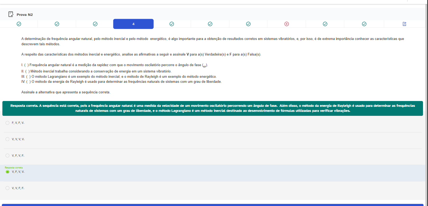 Prova N2 4 A determinação de frequência angular natural, pelo método inercial e pelo método energético, é algo importante para a obtenção de resultados corretos em sistemas vibratórios, e, por isso, é de extrema importância conhecer as características que descrevem tais métodos. A respeito das características dos métodos inercial e energético, analise as afirmativas a seguir e assinale V para a(s) Verdadeira(s) e F para a(s) Falsa(s). I. Frequência angular natural é a medição da rapidez com que 0 movimento oscilatório percorre 0 ângulo de fase II. Método inercial trabalha considerando a conservação de energia em um sistema III. O método Lagrangiano é um exemplo do método inercial, e 0 método de Rayleigh é um exemplo do método energético. IV. O método da energia de Rayleigh é usado para determinar as frequências naturais de sistemas com um grau de liberdade. Assinale a alternativa que apresenta a sequência correta. Resposta correta. A sequência está correta, pois a frequência angular natural é uma medida da velocidade de um movimento oscilatório percorrendo um ângulo de fase. Além disso, método da energia de Rayleigh é usado para determinar as frequências naturais de sistemas com um grau de liberdade, e método Lagrangiano é um método inercial destinado ao desenvolvimento de fórmulas utilizadas para verificar vibrações. Resposta correta V,V,F,F.