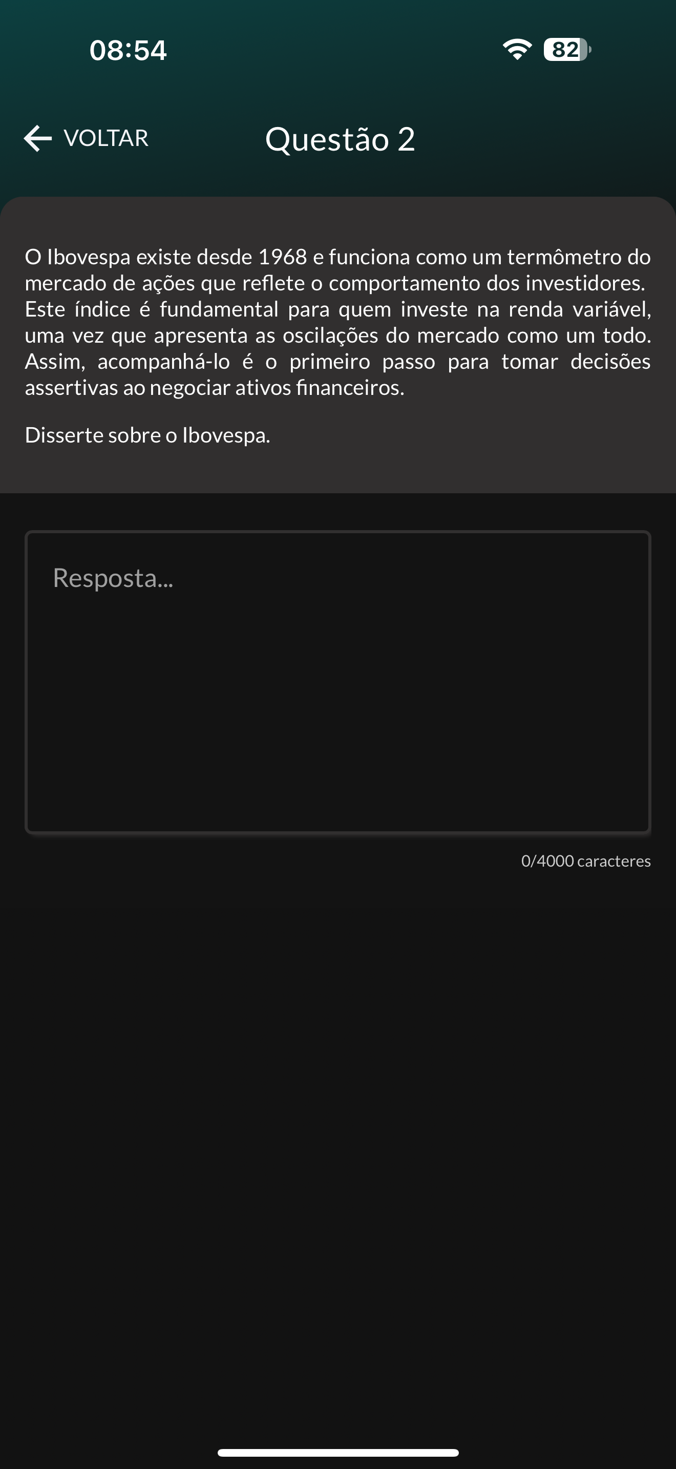 08:54 82 VOLTAR Questão 2 Ibovespa existe desde 1968 e funciona como um termômetro do mercado de ações que reflete comportamento dos investidores. Este índice é fundamental para quem investe na renda variável, uma vez que apresenta as oscilações do mercado como um todo. Assim, acompanhá-lo é primeiro passo para tomar decisões assertivas ao negociar ativos financeiros. Disserte sobre Ibovespa. Resposta... 0/4000 caracteres