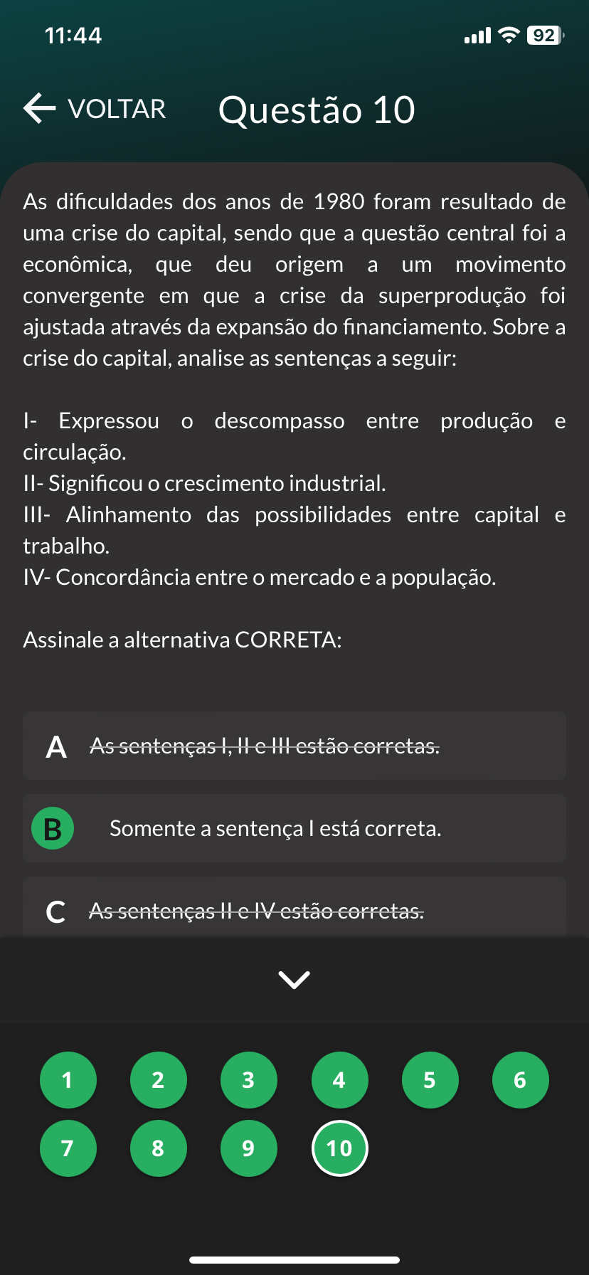 11:44 92 VOLTAR Questão 10 As dificuldades dos anos de 1980 foram resultado de uma crise do capital, sendo que a questão central foi a econômica, que deu origem a um movimento convergente em que a crise da superprodução foi ajustada através da expansão do financiamento. Sobre a crise do capital, analise as sentenças a seguir: I- Expressou o descompasso entre produção e circulação. II- Significou o crescimento industrial. III- Alinhamento das possibilidades entre capital e trabalho. IV- Concordância entre o mercado e a população. Assinale a alternativa CORRETA: A As sentenças I, H e III estão corretas. B Somente a sentença está correta. c As sentenças H e IV estão corretas. 1 2 3 4 5 6 7 8 9 10