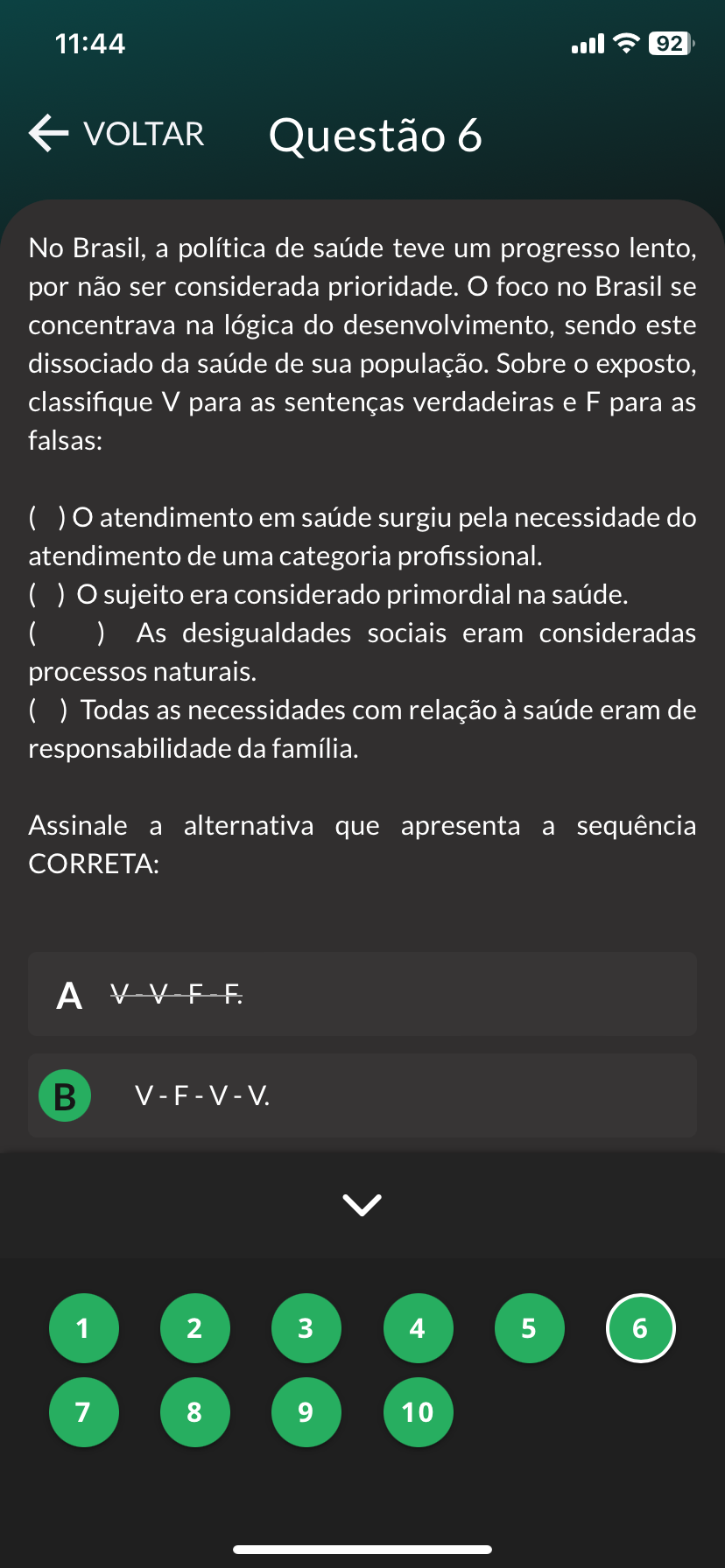 11:44 92 VOLTAR Questão 6 No Brasil, a política de saúde teve um progresso lento, por não ser considerada prioridade. O foco no Brasil se concentrava na lógica do desenvolvimento, sendo este dissociado da saúde de sua população. Sobre o exposto, classifique V para as sentenças verdadeiras e F para as falsas: atendimento em saúde surgiu pela necessidade do atendimento de uma categoria profissional. sujeito era considerado primordial na saúde. ( ) As desigualdades sociais eram consideradas processos naturais. Todas as necessidades com relação à saúde eram de responsabilidade da família. Assinale a alternativa que apresenta a sequência CORRETA: A B V-F-V-V. 1 2 3 4 5 6 7 8 9 10