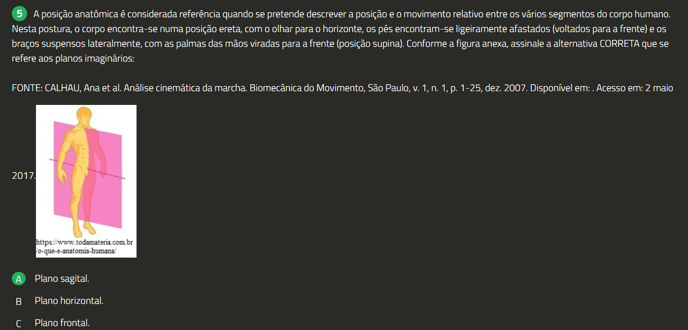 5 A posição anatômica é considerada referência quando se pretende descrever a posição e 0 movimento relativo entre vários segmentos do corpo humano. Nesta postura, 0 corpo encontra-se numa posição ereta, com olhar para 0 horizonte, pés encontram-se ligeiramente afastados (voltados para a frente) e braços suspensos lateralmente, com as palmas das mãos viradas para a frente (posição supina). Conforme a figura anexa, assinale a alternativa CORRETA que se refere aos planos imaginários: FONTE: CALHAU, Ana et al. Análise cinemática da marcha. Biomecânica do Movimento, São Paulo, V. 1, n. 1, p. 1-25, dez. 2007. Disponível em: Acesso em: 2 maio 2017. o-que-e-anatomia-humana/ A Plano sagital. B Plano horizontal. Plano frontal.