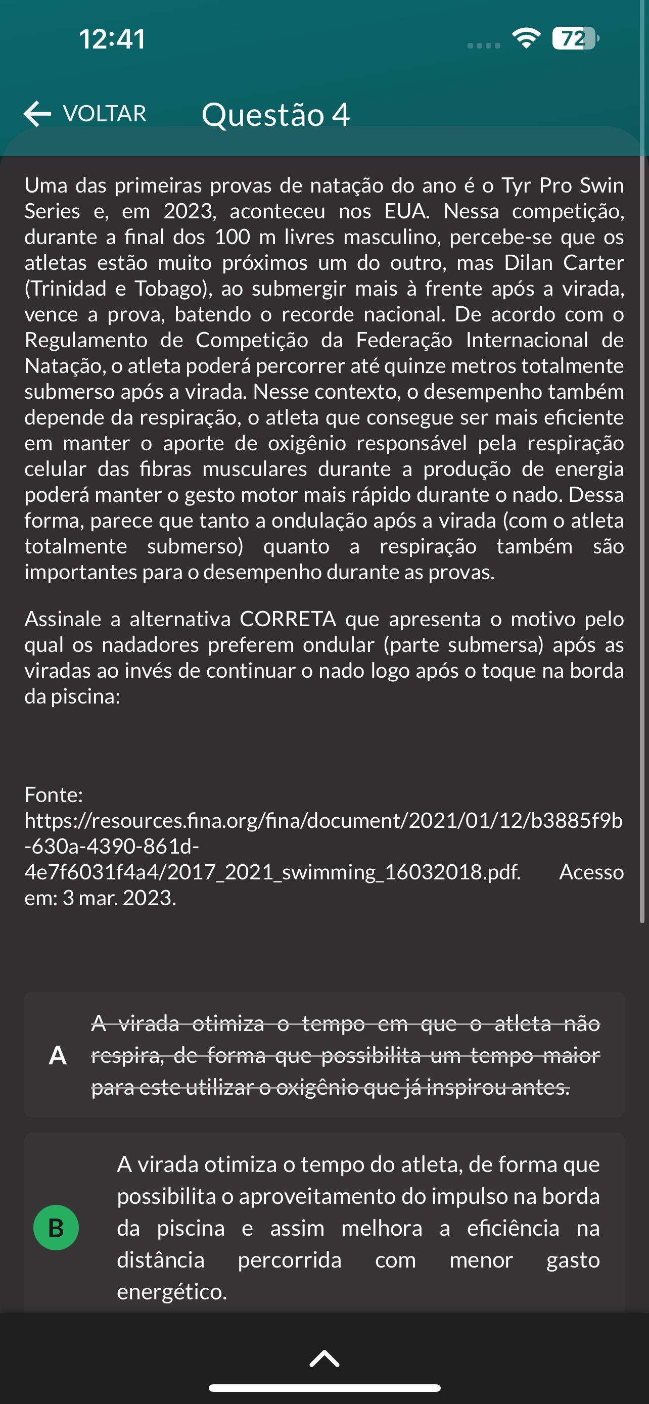 12:41 72 VOLTAR Questão 4 Uma das primeiras provas de natação do ano é Tyr Pro Swin Series e, em 2023, aconteceu nos EUA. Nessa competição, durante a final dos 100 m livres masculino, percebe-se que os atletas estão muito próximos um do outro, mas Dilan Carter (Trinidad e Tobago), ao submergir mais à frente após a virada, vence a prova, batendo recorde nacional. De acordo com Regulamento de Competição da Federação Internacional de Natação, atleta poderá percorrer até quinze metros totalmente submerso após a virada. Nesse contexto, desempenho também depende da respiração, atleta que consegue ser mais eficiente em manter aporte de oxigênio responsável pela respiração celular das fibras musculares durante a produção de energia poderá manter gesto motor mais rápido durante nado. Dessa forma, parece que tanto a ondulação após a virada (com atleta totalmente submerso) quanto a respiração também são importantes para desempenho durante as provas. Assinale a alternativa CORRETA que apresenta motivo pelo qual os nadadores preferem ondular (parte submersa) após as viradas ao invés de continuar nado logo após toque na borda da piscina: Fonte: -630a-4390-861d- 4e7f6031f4a4/2017_2021_swimming_16032018.pdf. Acesso em: 3 mar. 2023. A virada otimiza tempo em que atleta não A respira, de forma que possibilita um tempo maior para este utilizar oxigênio que já inspirou antes. A virada otimiza tempo do atleta, de forma que possibilita o aproveitamento do impulso na borda B da piscina e assim melhora a eficiência na distância percorrida com menor gasto energético.