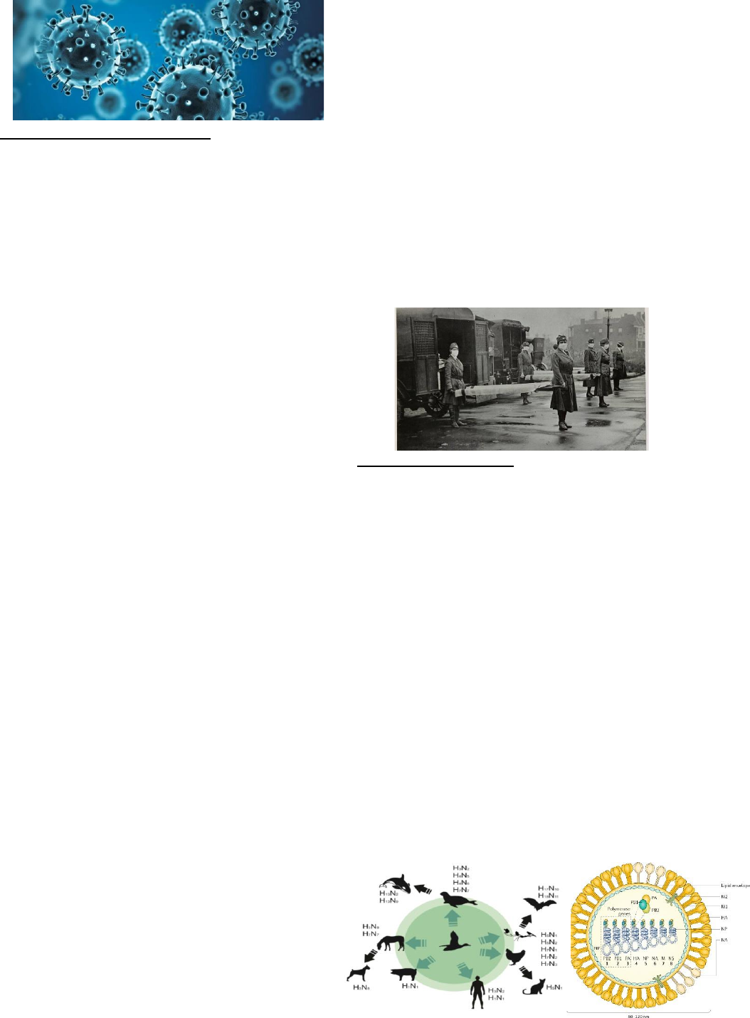 Influenza Aviária Introdução O que é a Influenza Aviária? A gripe aviária é uma doença de aves domésticas e silvestres, causada pelo vírus de influenza A (IAV) altamente patogênico. Tambem pode ser denominada como Praga Aviária. Os vírus influenza tipo A são classificados em subtipos com base nas glicoproteínas de superfície hemaglutinina (HA) e neuraminidase (NA). Existem 18 subtipos de hemaglutinina (H1-H18) e 11 subtipos de neuraminidase (N1- N11). ➢ Em aves, os subtipos de vírus Influenza A variam de H1 a H16 e N1 a N9. Esses vírus são categorizados de acordo com sua capacidade de causar doença e morte em aves domésticas: ✓ Baixa patogenicidade: Geralmente causam sintomas leves ou subclínicos, como o subtipo H3N2. ✓ Alta patogenicidade: Causam doenças graves e alta mortalidade, especialmente os subtipos H5 e H7. ➢ A influenza aviária é uma doença viral altamente contagiosa, com alta mortalidade e rápida disseminação. ➢ As aves silvestres, especialmente as aquáticas, desempenham um papel crucial na disseminação do vírus, atuando como reservatórios naturais. ➢ A doença afeta não apenas aves, mas também outros animais e humanos. ➢ O subtipo H5N1 é o mais comum em aves e é considerado uma ameaça global devido à sua alta patogenicidade. ➢ Qualquer caso suspeito ou diagnóstico laboratorial deve ser notificado imediatamente. Histórico ➢ A influenza aviária foi descrita pela primeira vez na Itália em 1878, sendo inicialmente chamada de "Praga Aviária" ou "Peste Aviária". ➢ Em 1901, descobriu-se que a doença era causada por um vírus, e em 1955, o agente foi identificado como pertencente ao gênero Influenza. ➢ Em 1974, descobriu-se que o vírus estava presente em aves silvestres, o que revelou o papel dessas aves no ciclo natural da gripe aviária. O século XX testemunhou três grandes pandemias de influenza: ✓ Gripe Espanhola (H1N1): Em 1918, causou milhões de mortes em todo o mundo. ✓ Gripe Asiática (H2N2): Em 1957, afetou principalmente a Ásia. ✓ Gripe de Hong Kong (H3N2): Em 1968, causou uma pandemia global. Gripe Espanhola em 1918. Etiologia ➢ Os vírus influenza pertencem à família orthomyxoviridae e o gênero Influenzavirus A. ➢ Eles possuem RNA de cadeia simples e são pouco resistentes no ambiente, sendo inativados por calor (temperaturas acima de 20°C), dessecação, luz ultravioleta e desinfetantes químicos comuns. ➢ Os vírus do tipo A são os principais responsáveis por doenças em aves. Existem aproximadamente 18 subtipos de hemaglutinina (H1-H18) e 11 subtipos de neuraminidase (N1-N11). ➢ A classificação dos vírus é baseada na combinação desses antígenos de superfície. Por exemplo, um vírus com hemaglutinina 5 e neuraminidase 1 é classificado como H5N1. Epidemiologia ➢ O vírus da influenza aviária é comum em aves aquáticas silvestres, especialmente as migratórias, que atuam como reservatórios naturais. Novas variantes do vírus surgem devido a mutações durante a replicação, o que promove a renovação constante de hospedeiros suscetíveis e o surgimento de epidemias. ➢ A prática de fornecer aves silvestres vivas em mercados aumenta a oportunidade de mutação viral e a propagação do vírus para rebanhos comerciais. Isso representa um risco para a segurança alimentar global, além de causar prejuízos econômicos devido à queda no turismo, gastos com saúde pública e investimentos em monitoramento. ➢ A epidemiologia da influenza aviária está claramente influenciada pela distribuição das aves domésticas e silvestres. Grandes surtos ocorrem principalmente na Ásia, mas desde 2022, a região das Américas vem enfrentando uma epidemia de influenza aviária de alta patogenicidade associada ao subtipo A (H5N1) em animais. Patogenia ➢ O subtipo H5N1 é o mais comum em aves e o antígeno HA (hemaglutinina) desempenha um papel crucial nas infecções. ➢ O vírus é eliminado pelas secreções nasais, oculares e pelas fezes. A disseminação dentro de um lote pode ocorrer por contato direto, aerossóis, equipamentos, cama, água, alimento e aves mortas. ➢ A infecção ocorre principalmente por inalação e ingestão, com um período de incubação de 2 a 4 dias. ➢ O vírus se replica nas células epiteliais do trato respiratório superior e intestinal, podendo se espalhar por todo o organismo e causar a forma sistêmica da doença. ➢ Os sinais clínicos variam de acordo com a espécie afetada, idade, virulência do vírus, ambiente e presença de infecções associadas. Transmissão A transmissão entre diferentes espécies de aves ocorre principalmente por contato direto ou indireto com aves aquáticas migratórias. As formas de transmissão incluem: ✓ Contato direto: Fezes, ração, secreções respiratórias, água, ovos quebrados ou carcaças de animais mortos. ✓ Contato indireto: Equipamentos, veículos, roupas contaminadas e trânsito de pessoas em áreas com a doença. ➢ A transmissão vertical (da matriz para o ovo) também é possível, com o vírus podendo estar presente na casca do ovo ou no sêmen de galos. A transmissão da ave para humanos ocorre principalmente durante o abate, despenagem e manuseio de carcaças de aves infectadas e preparação de aves para consumo também são fatores de risco. Sinais Clínicos Os sinais clínicos variam de acordo com a patogenicidade do vírus: ✓ Infecções subclínicas: Queda na produção de ovos, enfermidade respiratória leve ou moderada e mortalidade variável. ✓ Vírus de média patogenicidade: Mortalidade de 5%, podendo aumentar para 50% com infecções bacterianas associadas. ✓ Vírus de alta patogenicidade: Enfermidade severa com alta mortalidade devido à falha de múltiplos órgãos, especialmente sistema nervoso, cardiovascular e/ou endócrino. ✓ Os sinais clínicos mais comuns incluem ronqueira, tosse, espirros, descarga ocular e nasal, traqueíte e pneumonia. Diagnóstico