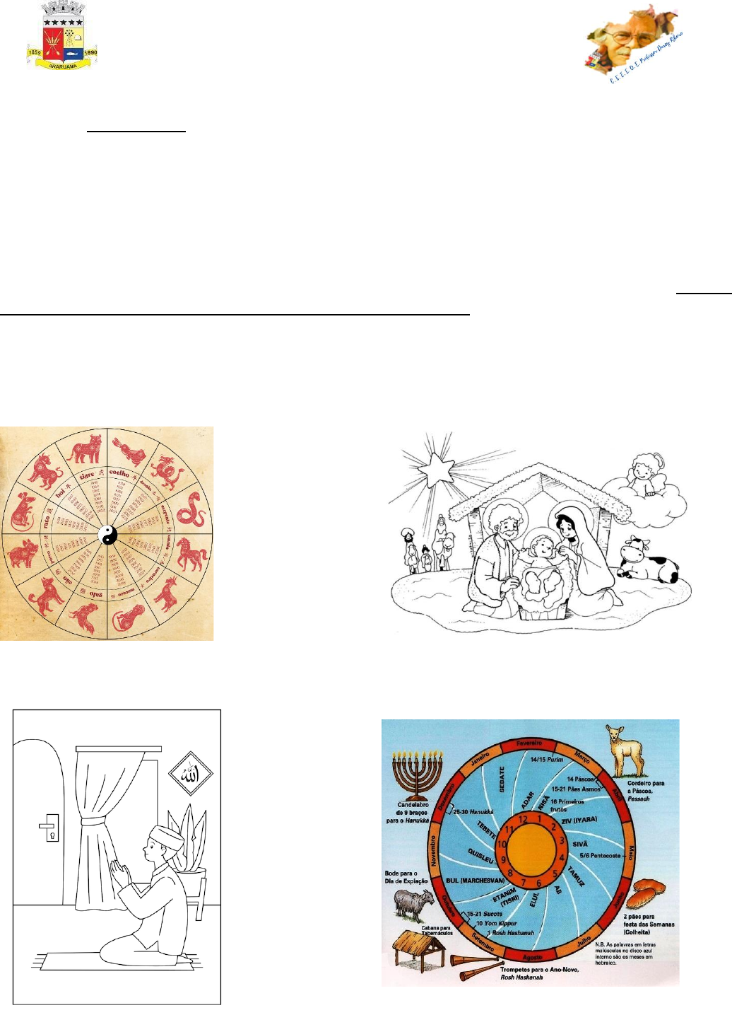 Estado do Rio de Janeiro Prefeitura Municipal de Araruama Secretaria Municipal de Educação Complexo Educacional e Esportivo de Excelência e Qualidade de Ensino Professor Darcy Ribeiro Professora Juliene Cruz. Turma:________ Aluno(a): ______________________________ Avaliação Formal do 6º ano – 1º Trimestre 1) As imagens abaixo e suas legendas representam culturas e formas de contar o tempo. Indique no espaço entre parênteses a qual calendário elas pertencem: (A) Calendário Cristão, ou Gregoriano (B) Calendário Chinês (C) Calendário Islâmico (D) Calendário judaico ( ) ( ) (os anos tem os nomes dos animais do horóscopo) (sua contagem é a partir do nascimento de um personagem religioso) ( ) ( ) (é praticado pelo povo judeu) (inicia-se com a pregação do profeta Maomé) 2) Marque um X na opção correta. História é a ciência que: (a) estuda os acidentes históricos e geográficos do planeta Terra. (b) se fundamenta unicamente em documentos escritos. (c) estuda os acontecimentos do passado dos homens e mulheres. 3) O que são fontes Históricas? ( A) vestígios do passado (B) local onde jorra água (C) um tipo de letra 4) O século é uma unidade de tempo muito utilizada pelos historiadores. Escreva a que século pertencem os seguintes anos: . a) 2023 – século ________ b) 1500- século _________ 5) Leia o texto abaixo depois responda à pergunta: Os idosos Para a história, os idosos significam uma oportunidade única para recuperar informações sobre o passado. Mais do que isso, é a chance de registrar seu modo de vida, sua história. Ao trabalhar com ENTREVISTAS de pessoas idosas, o historiador estará utilizando uma fonte: (a) Oral (b) Textual (c) Visual (d) Material