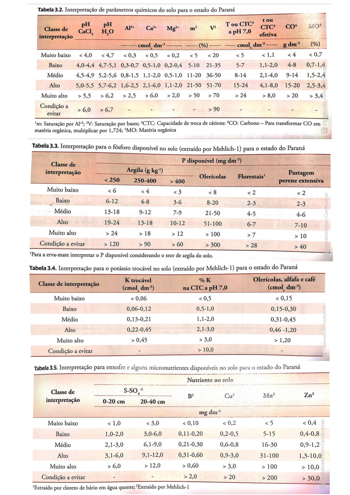 Tabela 3.2. Interpretação de parâmetros químicos do solo para o estado do Paraná t ou pH pH T ou Classe de m¹ H2O a pH 7,0 interpretação efetiva cmol dm⁻³ (%) cmol dm⁻³ g dm⁻³ (%) Muito baixo 5,5 > 6,2 > 2,5 > 6,0 > 2,0 > 50 > 70 > 24 > 8,0 > 20 > 3,4 Condição a > 6,0 > 6,7 > 90 evitar ¹m: Saturação por ²V: Saturação por bases; ³CTC: Capacidade de troca de cátions: Carbono Para transformar CO em matéria orgânica, multiplicar por 1,724; ⁵MO: Matéria orgânica Tabela 3.3. Interpretação para o fósforo disponível no solo (extraído por Mehlich-1) para o estado do Paraná Classe de P disponível (mg interpretação Argila (g Olerícolas Florestais¹ Pastagem 400 perene extensiva Muito baixo 24 > 18 > 12 > 100 >7 > 10 Digitalizada.com CamScanner Condição a evitar > 120 > 90 > 60 > 300 > 28 > 40 a erva-mate interpretar o P disponível considerando o teor de argila do solo. Tabela 3.4. Interpretação para o potássio trocável no solo (extraído por Mehlich-1) para o estado do Paraná trocável Olerícolas, alfafa e café Classe de interpretação (cmol dm⁻³) na a pH 7,0 (cmol dm⁻³) Muito baixo 0,45 > 3,0 > 1,20 Digitalizada com CamScanner Condição a evitar > 10,0 Tabela 3.5. Interpretação para enxofre e alguns micronutrientes disponíveis no solo para estado do Paraná Nutriente no solo Classe de B¹ Cu² Mn² interpretação 0-20 cm 20-40 cm mg Muito baixo 1,0 6,0 > 12,0 > 0,60 > 3,0 > 100 > 10,0 Condição a evitar > 2,0 > 20 > 200 > 30,0 por cloreto de bário em água quente; ²Extraído por Mehlich-1