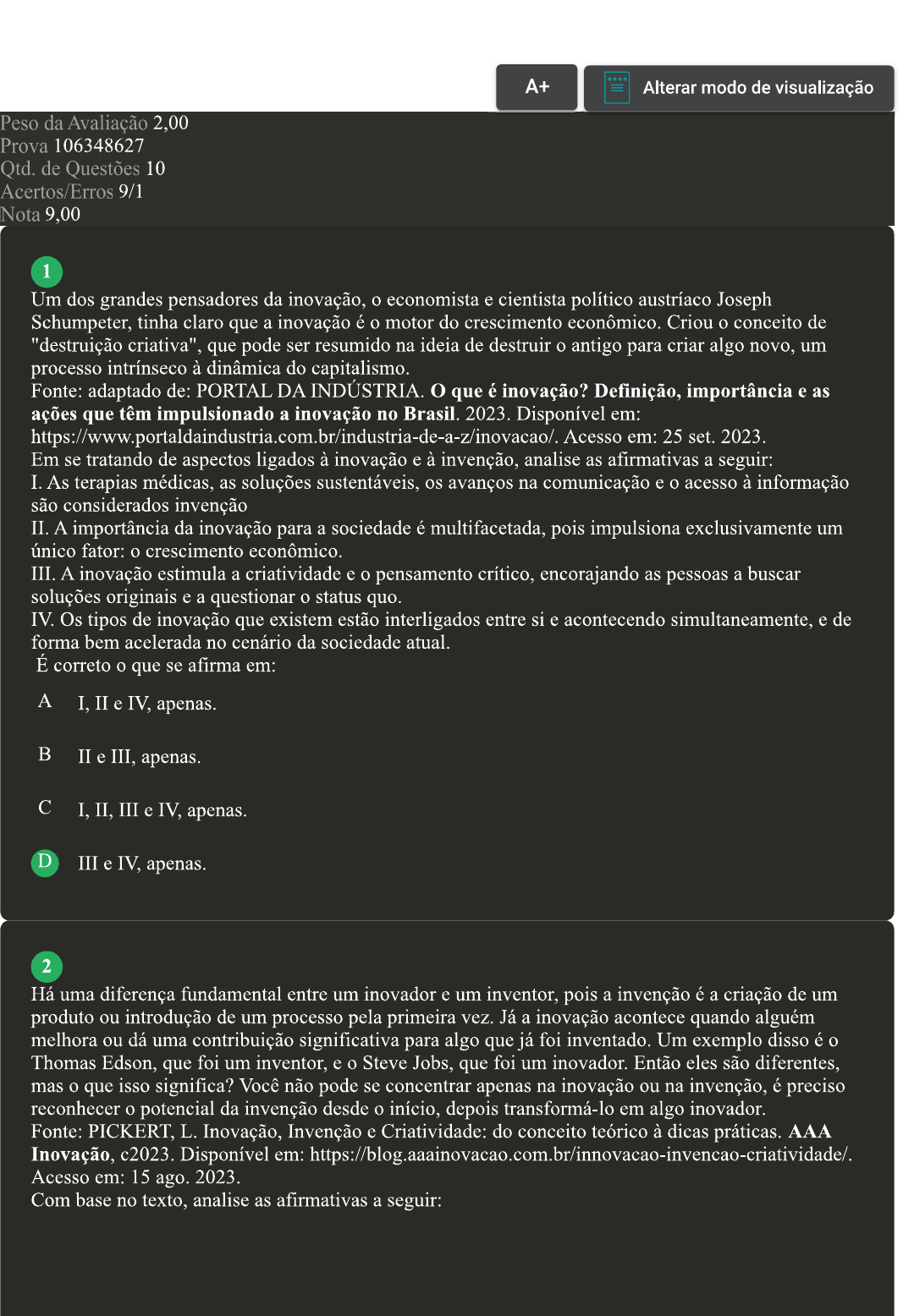 A+ Alterar modo de visualização Peso da Avaliação 2,00 Prova 106348627 Qtd. de Questões 10 Acertos/Erros 9/1 Nota 9,00 1 Um dos grandes pensadores da inovação, o economista e cientista político austríaco Joseph Schumpeter, tinha claro que a inovação é o motor do crescimento econômico. Criou o conceito de "destruição criativa", que pode ser resumido na ideia de destruir o antigo para criar algo novo, um processo intrínseco à dinâmica do capitalismo. Fonte: adaptado de: PORTAL DA INDÚSTRIA. que é inovação? Definição, importância e as ações que têm impulsionado a inovação no Brasil. 2023. Disponível em: em: 25 set. 2023. Em se tratando de aspectos ligados à inovação e à invenção, analise as afirmativas a seguir: I. As terapias médicas, as soluções sustentáveis, os avanços na comunicação e o acesso à informação são considerados invenção II. A importância da inovação para a sociedade é multifacetada, pois impulsiona exclusivamente um único fator: o crescimento econômico. III. A inovação estimula a criatividade e o pensamento crítico, encorajando as pessoas a buscar soluções originais e a questionar o status quo. IV. Os tipos de inovação que existem estão interligados entre si e acontecendo simultaneamente, e de forma bem acelerada no cenário da sociedade atual. É correto o que se afirma em: A I, II e IV, apenas. II e III, apenas. I, II, III e IV, apenas. D III e IV, apenas. 2 Há uma diferença fundamental entre um inovador e um inventor, pois a invenção é a criação de um produto ou introdução de um processo pela primeira vez. Já a inovação acontece quando alguém melhora ou dá uma contribuição significativa para algo que já foi inventado. Um exemplo disso é o Thomas Edson, que foi um inventor, e o Steve Jobs, que foi um inovador. Então eles são diferentes, mas o que isso significa? Você não pode se concentrar apenas na inovação ou na invenção, é preciso reconhecer o potencial da invenção desde o início, depois transformá-lo em algo inovador. Fonte: PICKERT, L. Inovação, Invenção e Criatividade: do conceito teórico à dicas práticas. AAA Inovação, c2023. Disponível em: https://blog.aaainovacao.com.br/innovacao-invencao-criatividade/ Acesso em: 15 ago. 2023. Com base no texto, analise as afirmativas a seguir:I. Inovar é algo que traz transformações para a sociedade, ao contrário da invenção que pode não trazer grandes transformações. II. Algo que foi criado é o único aspecto para ser imediatamente considerado uma inovação. III. Inovação e invenção podem ser tratadas como sinônimos, representando a mesma finalidade. IV. Inventar, obrigatoriamente tem relação com a forma como se utiliza algo já existente, e teve sua utilização modificada. É correto o que se afirma em: A III e IV, apenas. B I, apenas. I, II e III, apenas. D II e IV, apenas. 3 Existem diversos tipos de inovação que podem ser aplicados no dia a dia do negócio para potencializar os resultados, cada um com seu objetivo: inovação radical, incremental e disruptiva são alguns deles. Toda empresa deseja inovar, se destacar no mercado e oferecer o melhor para o seu público, colaboradores e parceiros. No entanto, para além dos sonhos e ambições de cada marca, saber como promover essas transformações desejadas e outros aspectos devem ser considerados, como: o que realmente é inovador, quais os tipos de inovação e como implementar isso em um negócio? Inovação é tudo o que propõe uma alternativa ao que é feito de determinada maneira, que traz benefícios econômicos, comportamentais, resoluções de problemas ou proporciona praticidades para o dia a dia das pessoas. Pode estar relacionada a um produto, serviço, processo, mercado, meios de produção, tecnologia ou o que mais trouxer uma transformação que se torne constante e indispensável. Fonte: TIPOS de inovação: quais são e como aplicá-los na sua empresa? Sydle, 2022. Disponível em: em: 20 ago. 2023. Com base no texto e sobre os tipos de inovação, analise as afirmações considerando V para verdadeiro e F para falso: ( ) A inovação de produtos considera a função, mas também a facilidade de uso do produto. ( ) A inovação de cadeia de suprimentos inclui etapas como venda, compra, fabricação e transporte. ( ) A inovação organizacional busca alterar o índice de avaliações, fornecer incentivos para ideias de funcionários. A inovação de processos tem relação com inovação de métodos de promoção de venda existentes nas empresas. Assinale a afirmativa que contempla corretamente a sequência: A V,V,F,V. B V,V,V,F. F,V,V,F. D V,F,F,V. Revisar Conteúdo do Livro4 Se por um lado fica claro que as sociedades contemporâneas vêm sendo moldadas de acordo com as regras da sociedade global aqui compreendida como processos, estruturas de diversas ordens, que funcionam por vezes de modo desigual e contraditório por outro, importa tentar decifrar o papel do homem que se forma e ocupa o seu espaço enquanto cidadão, num mundo sacudido por tantas transformações. Haverá alguma possibilidade de uma inserção crítica deste homem, ou os fenômenos de tendência mundializante, que agora são percebidos com muita intensidade, sufocarão as possibilidades locais de manifestação da identidade social e mesmo de resistência cultural? Fonte: adaptado de: RODRIGUES, Ana Maria da Silva; OLIVEIRA, Cristina M. Viana C.; FREITAS, M. Algumas reflexões sobre globalização, mundialização e cultura. Perspectivas em Ciência da Informação, V. 6, n. 1, p. 97-105, 2001. Sobre os processos de globalização e inovação ao longo da história da humanidade, inovação pode ser conceituada como: A organização do objeto recriado. B ideia, método ou objeto que é criado. mudança de conceitos de um objeto novo. D reprodução e organização de algo criado. 5 que é inovação? Inovação é a ação ou o ato de inovar, ou seja, modificando