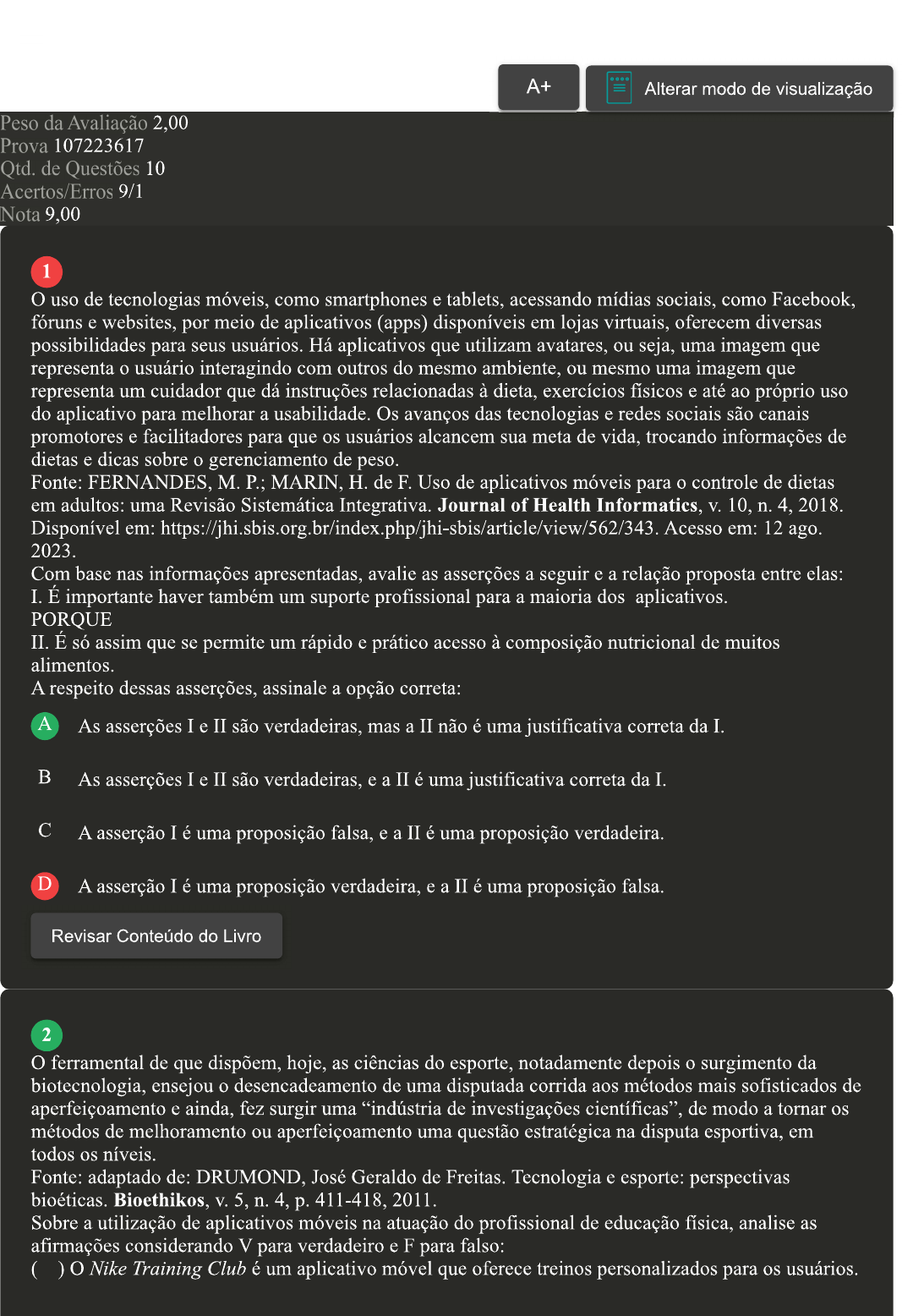 A+ Alterar modo de visualização Peso da Avaliação 2,00 Prova 107223617 Qtd. de Questões 10 Acertos/Erros 9/1 Nota 9,00 1 uso de tecnologias móveis, como smartphones e tablets, acessando mídias sociais, como Facebook, fóruns e websites, por meio de aplicativos (apps) disponíveis em lojas virtuais, oferecem diversas possibilidades para seus usuários. Há aplicativos que utilizam avatares, ou seja, uma imagem que representa o usuário interagindo com outros do mesmo ambiente, ou mesmo uma imagem que representa um cuidador que dá instruções relacionadas à dieta, exercícios físicos e até ao próprio uso do aplicativo para melhorar a usabilidade. Os avanços das tecnologias e redes sociais são canais promotores e facilitadores para que os usuários alcancem sua meta de vida, trocando informações de dietas e dicas sobre o gerenciamento de peso. Fonte: FERNANDES, M. P.; MARIN, de F. Uso de aplicativos móveis para o controle de dietas em adultos: uma Revisão Sistemática Integrativa. Journal of Health Informatics, V. 10, n. 4, 2018. Disponível em: Acesso em: 12 ago. 2023. Com base nas informações apresentadas, avalie as asserções a seguir e a relação proposta entre elas: I. É importante haver também um suporte profissional para a maioria dos aplicativos. PORQUE II. É só assim que se permite um rápido e prático acesso à composição nutricional de muitos alimentos. A respeito dessas asserções, assinale a opção correta: A As asserções I e II são verdadeiras, mas a II não é uma justificativa correta da I. As asserções I e II são verdadeiras, e a II é uma justificativa correta da I. A asserção I é uma proposição falsa, e a II é uma proposição verdadeira. D A asserção I é uma proposição verdadeira, e a II é uma proposição falsa. Revisar Conteúdo do Livro 2 ferramental de que dispõem, hoje, as ciências do esporte, notadamente depois o surgimento da biotecnologia, ensejou o desencadeamento de uma disputada corrida aos métodos mais sofisticados de aperfeiçoamento e ainda, fez surgir uma "indústria de investigações científicas", de modo a tornar os métodos de melhoramento ou aperfeiçoamento uma questão estratégica na disputa esportiva, em todos os níveis. Fonte: adaptado de: DRUMOND, José Geraldo de Freitas. Tecnologia e esporte: perspectivas bioéticas. Bioethikos, V. 5, n. 4, p. 411-418, 2011. Sobre a utilização de aplicativos móveis na atuação do profissional de educação física, analise as afirmações considerando V para verdadeiro e F para falso: ( ) Nike Training Club é um aplicativo móvel que oferece treinos personalizados para os usuários.( ) Strava é um aplicativo móvel que permite ao usuário registrar as suas atividades físicas, como corrida, ciclismo e natação. ( ) Evo é um App que oferece planos de treinamento personalizados que levam em consideração as necessidades e objetivos do usuário. ( ) MyFitnessPal é um App que permite ao usuário compartilhar suas atividades e treinos com outros usuários e participar de desafios e competições. Assinale a alternativa que apresenta a sequência CORRETA: A F,V,V,F. B V,V,F,F. V,F,F,V. D V,V,V,F. 3 As TIC apresentam forte relevância na atual sociedade, denominada sociedade da informação por alguns autores. A nova configuração de sociedade verificada na atualidade está relacionada a transformações de ordem tecnológica, bem como a profundas modificações sociais, econômicas e culturais ocorridas conjuntamente ao longo das últimas décadas. Todavia, muitas vezes estes aspectos são desprezados e a evolução da sociedade é tratada sob a ótica de despropositado evolucionismo. Em outros casos, predomina a visão de determinismo tecnológico, em que somente a tecnologia é enfatizada nos avanços da sociedade. Fonte: adaptado de: ROZA, Rodrigo Hipólito. papel das tecnologias da informação e comunicação na atual sociedade. Ciência da Informação, V. 49, n. 1, 2020. Sobre as tecnologias da informação e comunicação e sua composição, e considerando os seis requisitos básicos que compõem um ioT, assinale a alternativa correta: A Sensor, Identificação, Bluetooth, Frequências, Serviços e Semântica. Sensor, Wireless, Bluetooth, Frequências, Serviços e Comunicação. Identificação, Sensor, Comunicação, Computação, Serviços e Semântica. D Identificação, Sensor, Comunicação, Computação, Bluetooth e Frequências. 4 Especialmente nas duas últimas décadas, o esporte paralímpico tem passado por grandes processos de mudanças com relação ao seu enfoque e à tecnologia empregada. Mais do que terapia, a prática esportiva por atletas com deficiência foca o alto rendimento e esta realidade tem sido alvo de atenção de pesquisadores nas mais diversas áreas: Ciências do Esporte, Ciências Biológicas e Saúde, Ciências Sociais e Aplicadas, Psicologia e Educação. Fonte: adaptado de: CARDOSO, Vinícius Denardin et al. A tecnologia no esporte paralímpico. Pensar a Prática, V. 21, n. 3, 2018. Sobre o uso da tecnologia em diferentes contextos da prática de exercício físico, analise as afirmativas a seguir: I. Os dados de GPS são usados para rastrear objetos e pessoas em tempo real, através de cartões ou tags. II. As ferramentas de check-in são: GPS, dispositivos de rastreamento de atividade, identificação por radiofrequência, e códigos QR.III. Os dispositivos que usam códigos QR podem ser usados para determinar a velocidade e a altitude em que a atividade física foi realizada. IV. Os serviços de assinaturas de academias, como o Gympass, Totalpass e Classpass, utilizam as plataformas de integração para controle de frequência e permanência dos usuários. Assinale a alternativa que apresenta a sequência CORRETA: A I, II e III, apenas. B II e IV, apenas. I e III, apenas. D II, III e IV, apenas. 5 As tecnologias de informação e comunicação vêm crescendo de forma acelerada no mundo atual e ficando cada 