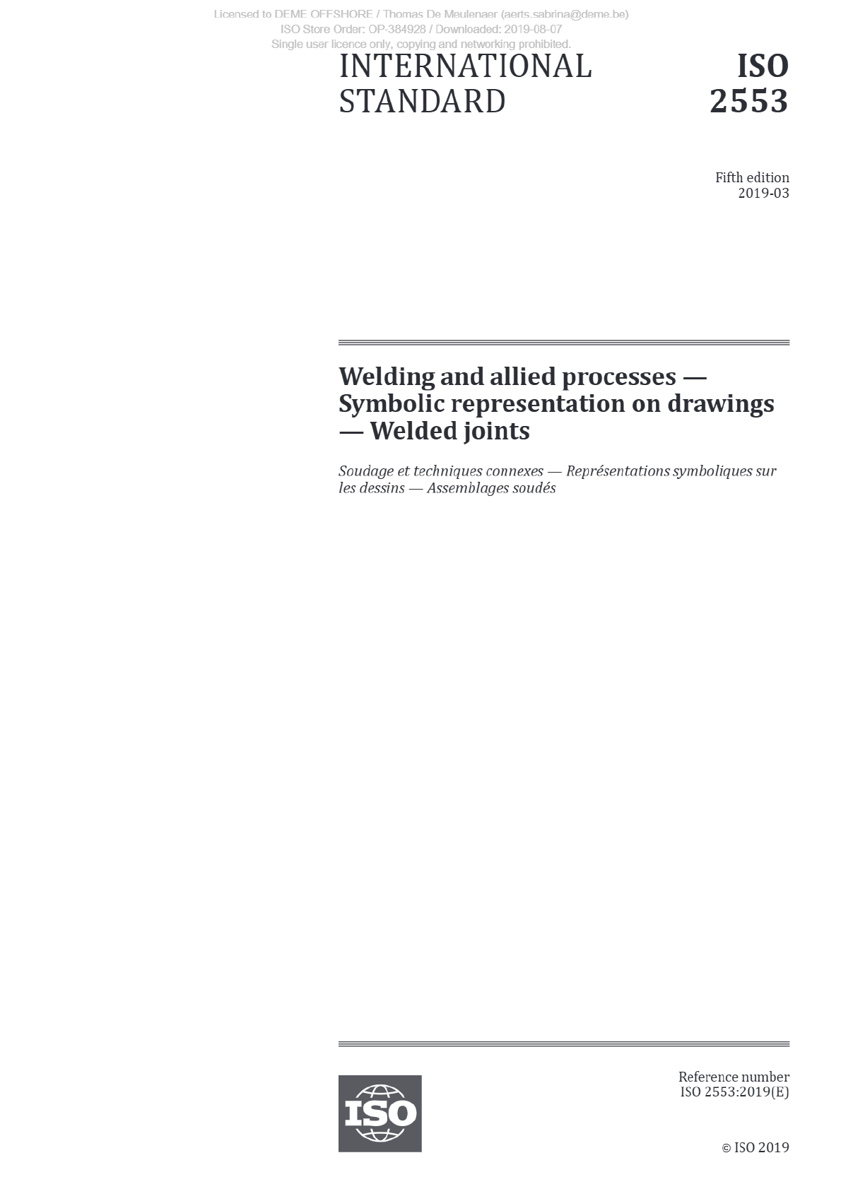 Licensed to DEME OFFSHORE / Thomas De Meulenaer (aerts.sabrina@deme.be) ISO Store Order: OP-384928 / Downloaded: 2019-08-07 Single user licence only, copying and networking prohibited. INTERNATIONAL ISO STANDARD 2553 Fifth edition 2019-03 Welding and allied processes - Symbolic representation on drawings - Welded joints Soudage et techniques connexes - Représentations symboliques sur les dessins - Assemblages soudés Reference number ISO 2553:2019(E) ISO © ISO 2019Licensed to DEME OFFSHORE / Thomas De Meulenaer (aerts.sabrina@deme.be) ISO Store Order: OP-384928 / Downloaded: 2019-08-07 Single user licence only, copying and networking prohibited. ISO 2553:2019(E) ! COPYRIGHT PROTECTED DOCUMENT © ISO 2019 All rights reserved. Unless otherwise specified, or required in the context of its implementation, no part of this publication may be reproduced or utilized otherwise in any form or by any means, electronic or mechanical, including photocopying, or posting on the internet or an intranet, without prior written permission. Permission can be requested from either ISO at the address below or ISO's member body in the country of the requester. ISO copyright office CP 401 Ch. de Blandonnet 8 CH-1214 Vernier, Geneva Phone: +41 22 749 01 11 Fax: +41 22 749 09 47 Email: copyright@iso.org Website: www.iso.org Published in Switzerland ii © ISO 2019 - All rights reservedLicensed to DEME OFFSHORE / Thomas De Meulenaer (aerts.sabrina@deme.be) ISO Store Order: OP-384928 / Downloaded: 2019-08-07 Single user licence only, copying and networking prohibited. ISO 2553:2019(E) Contents Page Foreword Introduction vi 1 Scope 1 2 Normative references 1 3 Terms and definitions 1 4 Welding symbol 5 4.1 General 5 4.2 Basic welding symbol 5 4.3 Welding symbol systems 6 4.4 Elementary symbols 6 4.4.1 General 6 4.4.2 Combinations of elementary symbols 9 4.4.3 Double-sided butt welds 9 4.5 Supplementary symbols 10 4.5.1 General 10 4.5.2 Weld-all-around symbol 13 4.5.3 Welds of the same type made from point to point 14 4.5.4 Field welds 15 4.5.5 Root reinforcement Butt welds made from one side 15 4.5.6 Welds on flanged butt and flanged corner joints 15 4.6 Arrow line 17 4.6.1 General 17 4.6.2 Multiple arrow lines 17 4.6.3 Broken arrow line 17 4.7 Reference line and weld location 18 4.7.1 Reference line 18 4.7.2 Weld location 18 4.7.3 Multiple reference lines 19 4.8 Tail 20 5 Dimensioning of welds 21 5.1 General 21 5.2 Cross-sectional dimensions 21 5.3 Length dimensions 21 5.3.1 General 21 5.3.2 Intermittent 21 5.4 Butt welds 22 5.4.1 Penetration depth 22 5.4.2 Double-sided welds 22 5.4.3 Flanged butt welds 22 5.4.4 Flare bevel and flare-V butt welds 22 5.5 Fillet welds 22 5.5.1 Weld size 22 5.5.2 Deep penetration fillet welds 22 5.6 Plug welds in circular holes 23 5.7 Plug welds in elongated holes (slots) 23 5.8 Spot welds 23 5.9 Seam welds 23 5.10 Edge welds 23 5.11 Stud welds 23 5.12 Overlay welds 23 5.13 Stake welds 24 6 Dimensioning of joint preparations 37 © ISO 2019 - All rights reserved iiiLicensed to DEME OFFSHORE / Thomas De Meulenaer ISO Store Order: OP-384928 / Downloaded: 2019-08-07 Single user licence only, copying and networking prohibited. ISO 2553:2019(E) 6.1 General 37 6.2 Root gap 37 6.3 Included angle 37 6.4 Root radius and depth of root faces - U and J butt joints 38 6.5 Depth of joint preparation 38 6.6 Countersink angle for plug welds 39 7 Alternative butt weld symbol with required weld quality 39 7.1 General 39 7.2 Example 40 Annex A (informative) Examples of the use of welding symbols 41 Annex B (informative) Tolerances and transition points for weld types 51 Annex C (informative) Alternative methods for designating intermittent butt and fillet welds 52 Bibliography 55 iv © ISO 2019 - All rights reservedLicensed to DEME OFFSHORE / Thomas De Meulenaer (aerts.sabrina@deme.be) ISO Store Order: OP-384928 / Downloaded: 2019-08-07 Single user licence only, copying and networking prohibited. ISO 2553:2019(E) Foreword ISO (the International Organization for Standardization) is a worldwide federation of national standards bodies (ISO member bodies). The work of preparing International Standards is normally carried out through ISO technical committees. Each member body interested in a subject for which a technical committee has been established has the right to be represented on that committee. International organizations, governmental and non-governmental, in liaison with ISO, also take part in the work. ISO collaborates closely with the International Electrotechnical Commission (IEC) on all matters of electrotechnical standardization. The procedures used to develop this document and those intended for its further maintenance are described in the ISO/IEC Directives, Part 1. In particular, the different approval criteria needed for the different types of ISO documents should be noted. This document was drafted in accordance with the editorial rules of the ISO/IEC Directives, Part 2 (see www.iso.org/directives). Attention is drawn to the possibility that some of the elements of this document may be the subject of patent rights. ISO shall not be held responsible for identifying any or all such patent rights. Details of any patent rights identified during the development of the document will be in the Introduction and/or on the ISO list of patent declarations received (see www.iso.org/patents). Any trade name used in this document is information given for the convenience of users and does not constitute an endorsement. For an explanation of the voluntary nature of standards, the meaning of ISO specific terms and expressions related to conformity assessment, as well as information about ISO's adherence to the World Trade Organization (WTO) principles in the Technical Barriers to Trade (TBT) see www.iso .org/iso/foreword.html. This document was prepared by Technical Committee ISO/TC 44, Welding and allied processes, Subcommittee SC 7, Representation and terms. Any feedback, question or request for official