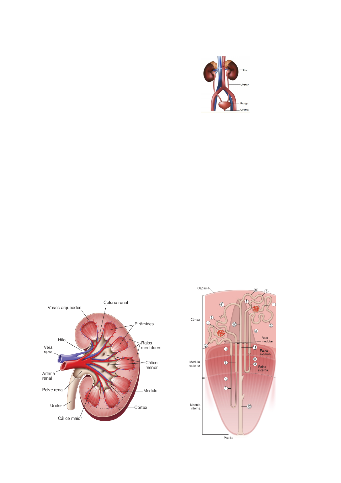 ESTUDO DIRIGIDO DE HISTOLOGIA UC5 Sistema Urinário 1. Descreva a estrutura histológica dos rins, identificando suas principais regiões (córtex e medula renal) e suas respectivas funções. R: O rim é dividido em duas regiões principais: o córtex e a medula. → O CÓRTEX RENAL é a camada externa (castanho-avermelhada), composta por corpúsculos renais e túbulos proximais e distais. Ele é responsável pela filtração inicial do sangue, reabsorção e secreção. 90% do sangue encontra-se no córtex. O córtex caracteriza-se pela existência de corpúsculos renais e seus túbulos associados. → A MEDULA , mais interna (coloração muito clara), contém as alças de Henle e os ductos coletores. Sua função é concentrar a urina e conduzi-la até a pelve renal. 5% do sangue encontra-se na medula. 2. Explique a organização do néfron, identificando cada uma das suas partes e o papel histológico que elas desempenham na formação da urina. R: O néfron é a unidade estrutural e funcional do rim e inclui: ● Corpúsculo Renal (glomérulo e cápsula de Bowman) – realiza a filtração do plasma sanguíneo ● Túbulo Contorcido Distal (reabsorve nutrientes e íons) ● Alça de Henle (concentra a urina e regula o gradiente osmótico) ● Túbulo Contorcido Distal (ajusta a composição da urina) ● Ducto Coletor (responsável pela concentração final da urina até a pelve renal) → Os néfrons são responsáveis pela produção da urina e correspondem a porção secretora de outras glândulas. O corpúsculo renal representa o início do néfron. É formado pelo glomérulo, um tufo de capilares composto de 10 a 20 alças capilares, circundado por um capuz epitelial de dupla camada, a cápsula renal ou de Bowman. ● A cápsula de Bowman é a porção inicial do néfron, na qual o sangue que flui por meio dos capilares glomerulares sofre filtração, produzindo o ultrafiltrado glomerular. ● Os capilares glomerulares são supridos (receber irrigação/nutrição) por uma arteríola aferente e drenados por uma arteríola eferente. Por sua vez, a arteríola aferente se ramifica, formando uma nova rede de capilares que irão suprir os túbulos renais. ● O local de entrada e saída das arteríolas aferente e eferente na camada parietal da cápsula de Bowman é denominado polo vascular. Em posição oposta ao polo vascular está o polo urinário do corpúsculo renal, local em que se inicia o túbulo contorcido proximal . ● O túbulo contorcido distal frequentemente conecta-se com o ducto coletor cortical por meio de um túbulo conector, formando o túbulo urinífero, o néfron mais o ducto coletor. O ducto coletor cortical continua dentro da medula como ducto coletor medular e desemboca na papila da pirâmide renal. COMO OCORRE A PRODUÇÃO DE URINA? -O sangue chega na capsula de bowman pela arteriola aferente. - o sangue vai ser filtrado pelos capilares glomerulares (endotélio fenestrado, membrana basal glomerular, podócitos → pedicelos) Endotelio fenestrado filtra de acordo com o tamanho da molecula (proteinas, ions) Membrana basal glomerular filtra de acordo com o tamanho e carga negativa Podocitos entre eles existem fendas de filtração que seleciona de acordo com o tamanho e cargas elétricas dos podócitos o ultrafiltrado cai no espaço urinário → tubulo contorcido proximal → tubulo reto proximal → ramo delgado descendente → ramo delgado ascendente → ramo ascendente expesso → tubulo contorcido distal ( fica atras da macula densa) → tubulo conector → Ductor Coletor (EXTERNO E INTERNO) já é urina → papila renal → calice menor → calice maior → pelve renal → ureter → bexiga → uretra o SANGUE QUE NÃO FOI FILTRADO SAI PELAS ARTERIOLA EFERENTE 3. Descreva a estrutura do corpúsculo renal, incluindo o glomérulo e a cápsula de Bowman, e como essa estrutura permite a filtração do sangue. O corpúsculo renal é composto pelo glomérulo, uma rede de capilares, e pela cápsula de Bowman, que o envolve. → A cápsula possui uma camada parietal e uma camada visceral formada por podócitos. Esses podócitos possuem prolongamentos (pedicelos) que formam fendas de filtração, permitindo a passagem de substâncias pequenas (como íons e água) e impedindo a passagem de proteínas e células sanguíneas. 4. Explique a histologia dos capilares glomerulares e o papel da membrana basal glomerular na filtração seletiva de substâncias do sangue. CAPILARES GLOMERULARES: - possuem Endotélio Fenestrado (fenestras numerosas e de contorno irregular) - permitindo a passagem de PEQUENAS MOLÉCULAS → As células endoteliais dos capilares glomerulares contém um grande número de canais de água de aquaporina-1 (AQP-1), que possibilita o movimento rápido da água através do endotélio. → Os PRODUTOS SECRETORES das células endoteliais, como óxido nítrico (NO) ou prostaglandinas (PGE²), desempenham importante papel na gênese de várias DOENÇAS GLOMERULARES TROMBÓTICAS microscopia eletrônica do capilar glomerular → A cápsula de Bowman é a porção inicial do néfron, na qual o sangue que flui por meio dos capilares glomerulares sofre filtração, produzindo o ultrafiltrado glomerular. Os capilares glomerulares são supridos por uma arteríola aferente e drenados por uma arteríola eferente. Por sua vez, a arteríola aferente se ramifica, formando uma nova rede de capilares que irão suprir os túbulos renais. MEMBRANA BASAL GLOMERULAR: - é uma Lâmina Basal espessa (que resulta na fusão das membranas basais dos endotélios e dos podócitos- as células da camada basal da cápsula de bowman) - situada entre o endotélio e os podócitos - atua como uma barreira seletiva, impedindo a passagem de proteínas e outras moléculas grandes, mas permitindo a passagem de água, eletrólitos e pequenas moléculas, promovendo uma filtração eficiente. → A Membrana Basal Glomerular é composta de uma rede que consiste em colágeno do tipo IV (princip