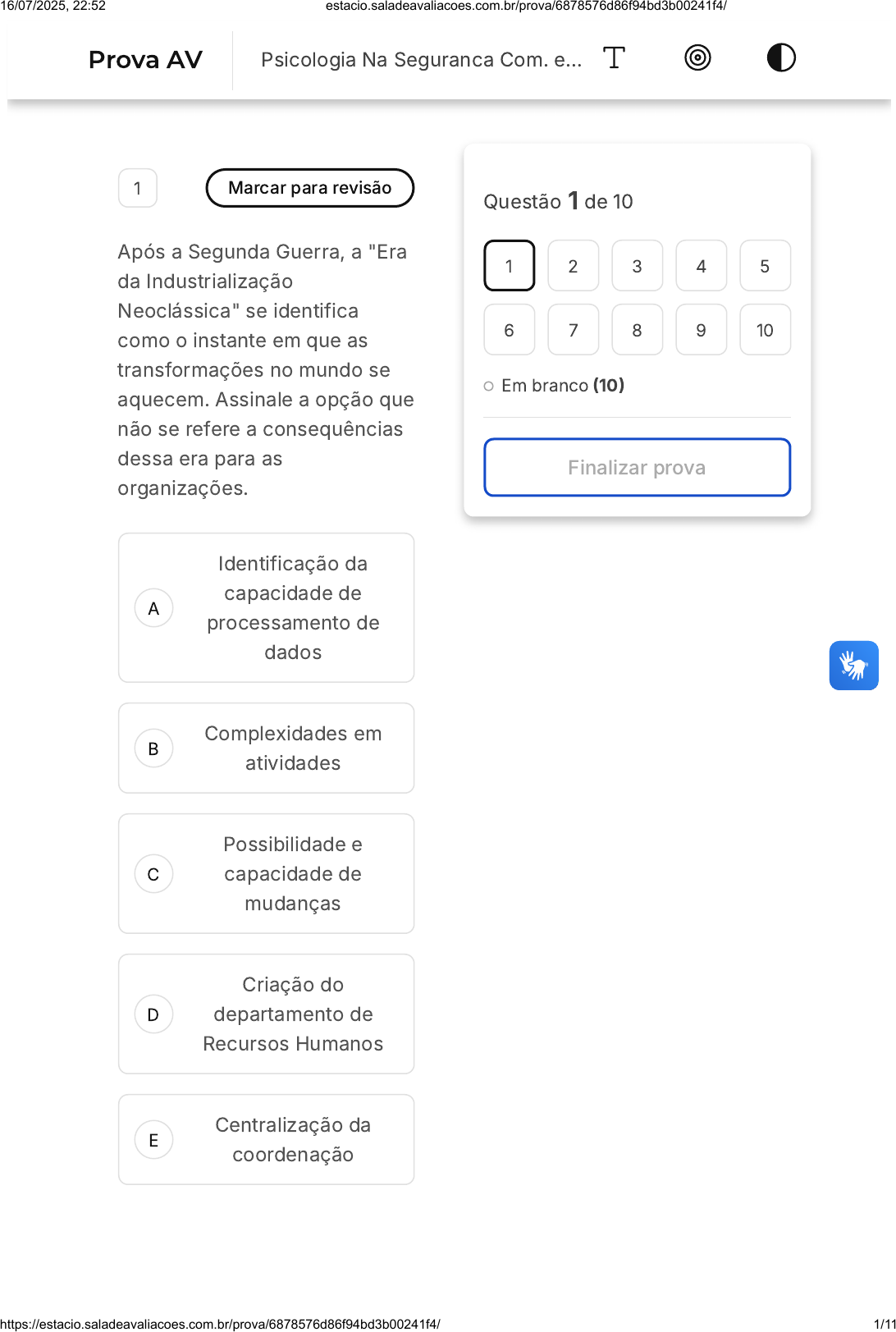 A B C D E 1 Marcar para revisão Após a Segunda Guerra, a "Era da Industrialização Neoclássica" se identifica como o instante em que as transformações no mundo se aquecem. Assinale a opção que não se refere a consequências dessa era para as organizações. Identificação da capacidade de processamento de dados Complexidades em atividades Possibilidade e capacidade de mudanças Criação do departamento de Recursos Humanos Centralização da coordenação Questão 1 de 10 Em branco (10) Finalizar prova 1 2 3 4 5 6 7 8 9 10 Prova AV Psicologia Na Seguranca Com. e… 16/07/2025, 22:52 estacio.saladeavaliacoes.com.br/prova/6878576d86f94bd3b00241f4/ https://estacio.saladeavaliacoes.com.br/prova/6878576d86f94bd3b00241f4/ 1/11 A B C D E 2 Marcar para revisão Quando duas ou mais pessoas são interdependentes e interagem entre si, no sentido de que as necessidades e objetivos dependem de um ou de outro, estamos falando sobre: Diagnóstico Metodologia Aconselhamento Avaliação Grupos sociais 3 Marcar para revisão De acordo com o condicionamento clássico, o estímulo neutro produz 16/07/2025, 22:52 estacio.saladeavaliacoes.com.br/prova/6878576d86f94bd3b00241f4/ https://estacio.saladeavaliacoes.com.br/prova/6878576d86f94bd3b00241f4/ 2/11 A B C D E Uma resposta de fuga e reforço operante Um comportamento que diminui ou aumenta de acordo com punições ou recompensas Um comportamento que anteriormente era iniciado a partir de um estímulo específico Nossa capacidade de transpor os procedimentos aprendidos em uma ação A nossa identificação com determinado modelo a ser seguido, desse modo, confere a ele o sentido que lhe atribuímos 4 Marcar para revisão A Psicologia é uma ciência que busca compreender o comportamento humano, procurando explicar, medir e, algumas vezes, modificá-lo. Em relação ao trabalho, no âmbito 16/07/2025, 22:52 estacio.saladeavaliacoes.com.br/prova/6878576d86f94bd3b00241f4/ https://estacio.saladeavaliacoes.com.br/prova/6878576d86f94bd3b00241f4/ 3/11 A B C D E organizacional, os psicólogos estudam: Fatores que buscam a igualdade nas relações Fatores que beneficiam os estudos do comportamento Fatores que possibilitam a indiferença nas relações no trabalho Fatores que ocasionam interesses comuns e relativos Fatores que possibilitam a generalização da vida 5 Marcar para revisão A Gestão de Pessoas surge com o objetivo de transformar: 16/07/2025, 22:52 estacio.saladeavaliacoes.com.br/prova/6878576d86f94bd3b00241f4/ https://estacio.saladeavaliacoes.com.br/prova/6878576d86f94bd3b00241f4/ 4/11 A B C D E A maneira como as empresas tratam seus compradores. A maneira como as empresas utilizam suas ferramentas. A maneira como as empresas realizam parcerias. A maneira como os gestores e empresas realizam seus contratos. A maneira como as empresas e seus gestores tratam seus empregados e colaboradores. 6 Marcar para revisão Embora o risco seja combatido por meio de medidas e regras de segurança, ainda assim este encontra-se passível do risco residual, ao passo que um acidente pode ter como causa a existência de um fator de risco que seja 16/07/2025, 22:52 estacio.saladeavaliacoes.com.br/prova/6878576d86f94bd3b00241f4/ https://estacio.saladeavaliacoes.com.br/prova/6878576d86f94bd3b00241f4/ 5/11 A B C D E A B conhecido desconhecido debatido extinto parcial 7 Marcar para revisão O Recrutamento Interno é o processo no qual os candidatos recrutados já estão presentes nos quadros funcionais da organização. Uma de suas principais vantagens consiste em: Aumentar o custo financeiro do que a realização do recrutamento externo. Aproveitar mais o potencial humano da organização. 16/07/2025, 22:52 estacio.saladeavaliacoes.com.br/prova/6878576d86f94bd3b00241f4/ https://estacio.saladeavaliacoes.com.br/prova/6878576d86f94bd3b00241f4/ 6/11 C D E A B C Desmotivar e desencorajar o desenvolvimento profissional de seus funcionários. Impedir uma carreira com diversas oportunidades para o empregado dentro da própria organização. Bloquear promoções ou transferências de posição. 8 Marcar para revisão Consiste em um incidente inesperado que pode ocasionar algum dano, perda, sofrimento ou óbito. Embora seja algo inesperado, grande parte dos acidentes podem ser evitados ou minimizados. Esse conceito refere-se a: Acidente Incapacidade Estresse 16/07/2025, 22:52 estacio.saladeavaliacoes.com.br/prova/6878576d86f94bd3b00241f4/ https://estacio.saladeavaliacoes.com.br/prova/6878576d86f94bd3b00241f4/ 7/11 D E Esgotamento Risco 9 Marcar para revisão Pedro é operário em uma empresa de construção civil e, durante uma jornada de trabalho, sofreu um acidente ao operar uma serra elétrica sem a devida proteção. O equipamento apresentou falha mecânica, e Pedro, ao tentar ajustá-lo sem desligá-lo previamente, acabou ferindo gravemente sua mão. Após a perícia, foram identificados vários fatores que contribuíram para o acidente, incluindo problemas na manutenção do equipamento, falta de treinamento adequado e a decisão de Pedro de ajustar a serra enquanto ela ainda estava ligada. Com base no caso apresentado e nos elementos característicos dos acidentes de trabalho, assinale a alternativa que corretamente relaciona os fatores do acidente com sua respectiva classificação. 16/07/2025, 22:52 estacio.saladeavaliacoes.com.br/prova/6878576d86f94bd3b00241f4/ https://estacio.saladeavaliacoes.com.br/prova/6878576d86f94bd3b00241f4/ 8/11 A B C A serra elétrica foi o agente do acidente, enquanto o ato de ajustá-la ligada caracteriza um ato inseguro. A decisão de Pedro de ajustar o equipamento sem desligá-lo caracteriza um fator pessoal de insegurança, e a falha mecânica do equipamento corresponde ao ato inseguro. A serra elétrica sem manutenção adequada corresponde à parte do agente, enquanto a falta de proteção individual configura um fator pessoal de insegurança. 16/07/2025, 22:52 estacio.saladeavaliacoes.com.br/prova/6878576d86f94bd3b00241f4/ https://e