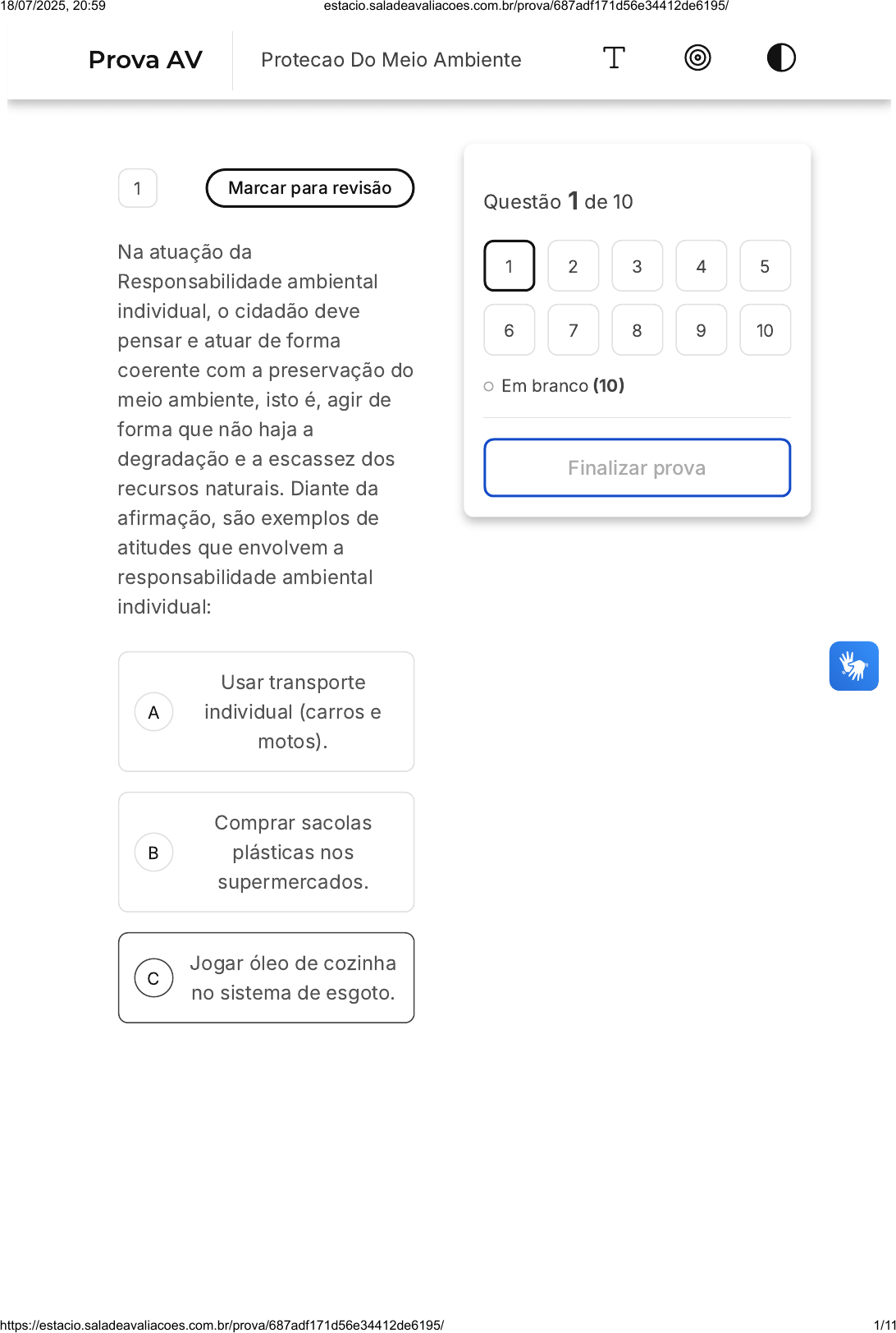 A B C 1 Marcar para revisão Na atuação da Responsabilidade ambiental individual, o cidadão deve pensar e atuar de forma coerente com a preservação do meio ambiente, isto é, agir de forma que não haja a degradação e a escassez dos recursos naturais. Diante da afirmação, são exemplos de atitudes que envolvem a responsabilidade ambiental individual: Usar transporte individual (carros e motos). Comprar sacolas plásticas nos supermercados. Jogar óleo de cozinha no sistema de esgoto. Questão 1 de 10 Em branco (10) Finalizar prova 1 2 3 4 5 6 7 8 9 10 Prova AV Protecao Do Meio Ambiente 18/07/2025, 20:59 estacio.saladeavaliacoes.com.br/prova/687adf171d56e34412de6195/ https://estacio.saladeavaliacoes.com.br/prova/687adf171d56e34412de6195/ 1/11 D E A B C Comprar eletrodomésticos com alto consumo de energia. Buscar consumir produtos com certificação ambiental e de empresas que respeitem o meio ambiente em seus processos produtivos. 2 Marcar para revisão A Constituição Federal de 1988 determinou em seu art. 225 que, para a instalação de obra ou atividade potencialmente causadora de significativa degradação do meio ambiente, o poder público pode, na forma da lei, exigir: Imposto sobre serviços. EIA/RIMA. Pagamento de taxas para liberação da obra. 18/07/2025, 20:59 estacio.saladeavaliacoes.com.br/prova/687adf171d56e34412de6195/ https://estacio.saladeavaliacoes.com.br/prova/687adf171d56e34412de6195/ 2/11 D E A B Prévia autorização do Ministério Público ambiental. Termo de Ajuste de Conduta - TAC. 3 Marcar para revisão No que diz respeito ao processo de licenciamento ambiental, analisar as afirmativas a seguir, identificando as corretas. I - É necessária a elaboração do EIA/RIMA para as atividades consideradas potencialmente causadoras de significativa degradação ambiental; II - O EIA/RIMA deve ser elaborado por profissionais legalmente habilitados; III - O custeio do EIA/RIMA deve ser efetuado pelo empreendedor; IV - O EIA/RIMA é um instrumento meramente compensatório ao dano causado por uma atividade. Apenas III e IV estão corretas. Apenas I, II e III estão corretas. 18/07/2025, 20:59 estacio.saladeavaliacoes.com.br/prova/687adf171d56e34412de6195/ https://estacio.saladeavaliacoes.com.br/prova/687adf171d56e34412de6195/ 3/11 C D E A B Apenas I, III e IV estão corretas. Somente a afirmativa I está correta. Todas as afirmativas estão corretas 4 Marcar para revisão Complete the text below: Na etapa inicial do processo de implantação do _____________________, é feito um mapeamento de todas as atividades da empresa e suas necessidades. Mas, uma vez que o SGA tenha sido implementado, outros desafios surgirão, sendo um deles a ___________________dos funcionários. Sistema de gerenciamento de resíduos - capacitação Sistema de gestão de negócios - especialização 18/07/2025, 20:59 estacio.saladeavaliacoes.com.br/prova/687adf171d56e34412de6195/ https://estacio.saladeavaliacoes.com.br/prova/687adf171d56e34412de6195/ 4/11 C D E Sistema de Gestão Ambiental - especialização Sistema de gestão ambiental - capacitação Sistema de Gestão Ambiental - tratamento 5 Marcar para revisão O Sistema de Gestão Ambiental (SGA) tem por finalidade maior eficácia dos processos produtivos com o mínimo de danos ao meio ambiente. Sobre a implantação do Sistema de Gestão Ambiental (SGA), julgue as seguintes afirmativas. I) Atualmente, as empresas precisam demonstrar um desempenho ambiental correto, em um contexto de uma legislação cada vez mais exigente e de preocupação em relação às questões ambientais e ao desenvolvimento sustentável. II) Há inúmeras vantagens e benefícios que as empresas poderão obter ao optarem por adotar políticas preventivas em relação à gestão ambiental, como por exemplo a melhoria da imagem da empresa. 18/07/2025, 20:59 estacio.saladeavaliacoes.com.br/prova/687adf171d56e34412de6195/ https://estacio.saladeavaliacoes.com.br/prova/687adf171d56e34412de6195/ 5/11 A B C D E III) A Norma ISO 14.001 especifica os principais requisitos de um Sistema de Gestão Ambiental, sendo que o sucesso desse sistema depende do comprometimento de todos os níveis e funções da organização. IV) A gestão ambiental é aplicável apenas para empresas de grande porte, tendo em vista que são poluidoras em grande potencial e que mais prejudicam o meio ambiente. Estão corretas as afirmativas: I e II. I, II e III. II, III e IV. II e III. I e III. 6 Marcar para revisão De acordo com a Política Nacional do Meio Ambiente - PNMA, _________________________ é/são o "conjunto de componentes físicos, químicos, 18/07/2025, 20:59 estacio.saladeavaliacoes.com.br/prova/687adf171d56e34412de6195/ https://estacio.saladeavaliacoes.com.br/prova/687adf171d56e34412de6195/ 6/11 A B C D E biológicos e sociais capazes de causar efeitos diretos ou indiretos, em um prazo curto ou longo, sobre os seres vivos e as atividades humanas". Natureza. Recursos Naturais. Recursos renováveis. Recursos não renováveis. Meio ambiente. 7 Marcar para revisão Analise as afirmações relacionadas a responsabilidades. I. O Código Civil Brasileiro impõe àquele que, por ação ou omissão, lesar direito de outrem, reparar o dano. II. A responsabilidade objetiva na responsabilidade ambiental está relacionada com o dever de indenizar. Tem como base a associação entre o dano, a relação de causalidade entre o sujeito e o dano e a culpa do agente. 18/07/2025, 20:59 estacio.saladeavaliacoes.com.br/prova/687adf171d56e34412de6195/ https://estacio.saladeavaliacoes.com.br/prova/687adf171d56e34412de6195/ 7/11 A B C D E III. O conceito de responsabilidade socioambiental se tornou o paradigma quase universal para a avaliação dos efeitos ambientais, provocados pela constante busca do crescimento econômico. Somente a I é verdadeira. São verdadeiras I e II. São verdadeiras I e III. São verdadeiras II e III. Somente a II é verdadeira. 8 Marcar para revisão Complete o texto abaixo: 