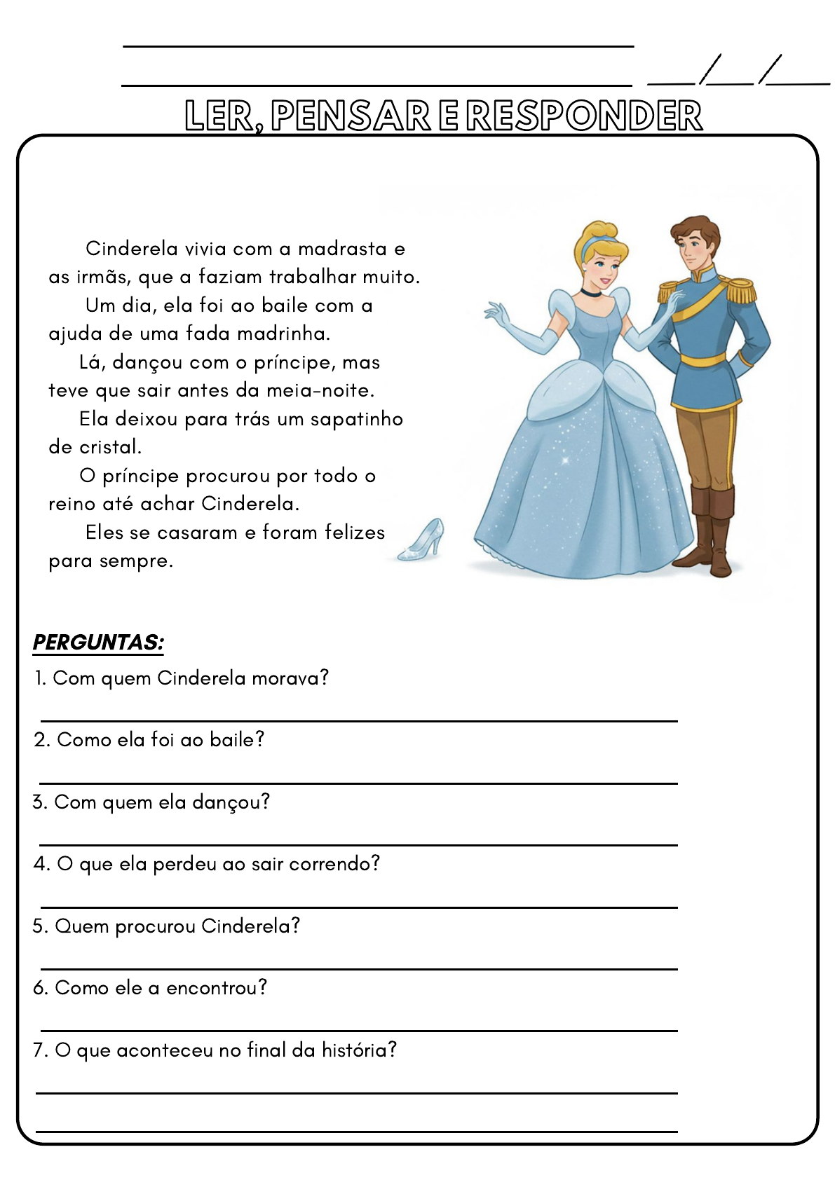 ESCOLA: MEU NOME: A CINDERELA LER, PENSAR E RESPONDER PERGUNTAS: 4. O que ela perdeu ao sair correndo? 1. Com quem Cinderela morava? Cinderela vivia com a madrasta e as irmãs, que a faziam trabalhar muito. Um dia, ela foi ao baile com a ajuda de uma fada madrinha. Lá, dançou com o príncipe, mas teve que sair antes da meia-noite. Ela deixou para trás um sapatinho de cristal. O príncipe procurou por todo o reino até achar Cinderela. Eles se casaram e foram felizes para sempre. 2. Como ela foi ao baile? 5. Quem procurou Cinderela? 3. Com quem ela dançou? 7. O que aconteceu no final da história? 6. Como ele a encontrou? ESCOLA: MEU NOME: A BRANCA DE NEVE E O SETE ANÕES LER, PENSAR E RESPONDER PERGUNTAS: 4. O que a Madrasta fez para enganar Branca de Neve? 1. Quem era Branca de Neve? Branca de Neve era uma princesa muito bondosa. Com inveja de sua beleza, a madrasta mandou-a para longe. Na floresta, ela encontrou uma casinha com sete anõezinhos. Eles viraram grandes amigos e cuidavam uns dos outros. Mas a madrasta disfarçada deu a ela uma maçã envenenada. Branca de Neve adormeceu até que um príncipe chegou e a salvou com um beijo de amor verdadeiro.Ela acordou e viveu feliz com seus amigos e o príncipe. 2. Por que a Madrasta ficou com inveja? 5. O que aconteceu quando ela comeu a maça? 3. Quem Branca de Neve conheceu na floresta? 7. Como termina a história? 6. Quem salvou Branca de Neve? ESCOLA: MEU NOME: A CHAPEUZINHO VERMELHO LER, PENSAR E RESPONDER PERGUNTAS: 4. O que o lobo fez para enganar? 1. Para onde Chapeuzinho estava indo? Chapeuzinho Vermelho foi visitar a vovó levando uma cesta de doces. No caminho, encontrou o lobo, que foi mais rápido até a casa da vovó. Ele se disfarçou e tentou enganar a menina. Mas Chapeuzinho percebeu algo estranho: — Que olhos grandes você tem! Ela correu para fora, chamou o caçador, e a vovó foi salva! Depois disso, o lobo nunca mais voltou. 2. O que ele levava na cesta? 5. Como Chapeuzinho percebeu o perigo? 3. Quem ela encontrou no caminho? 7. O que você faria nessa situação? 6. Quem ela chamou para ajudar? ESCOLA: MEU NOME: O PINÓQUIO LER, PENSAR E RESPONDER PERGUNTAS: 4. Quem era o pai dele? 1. Quem era Pinóquio? Pinóquio era um boneco de madeira que queria ser um menino de verdade. Seu nariz crescia toda vez que ele contava mentiras! Com a ajuda da Fada Azul e do Grilo Falante, ele aprendeu a ser bom e sincero. Depois de muitas aventuras e de ajudar seu pai, Gepeto, a fada realizou seu sonho: Pinóquio virou um menino de verdade! 2. O que acontecia quando ele mentia? 5. O que Pinóquio aprendeu? 3. Quem ajudava Pinóquio? 7. Por que é importante dizer a verdade? 6. O que aconteceu no final da história? ESCOLA: MEU NOME: A BELA E A FERA LER, PENSAR E RESPONDER PERGUNTAS: 4. O que Bela descobriu sobre a Fera? 1. Quem era Bela? Bela era uma moça gentil que foi morar num castelo para salvar seu pai. Lá, ela conheceu uma Fera que parecia assustadora. Com o tempo, Bela percebeu que a Fera tinha um coração bom. Eles se tornaram grandes amigos e depois se apaixonaram. O amor verdadeiro quebrou o feitiço, e a Fera virou um príncipe. Eles viveram felizes no castelo. 2. Por que ela foi morar no castelo? 5. O que aconteceu entre eles? 3. Como era a Fera no começo? 7. O que essa história ensina sobre o amor? 6. Qual feitiço foi quebrado? ESCOLA: MEU NOME: JOÃO E O PÉ DE FEIJÃO LER, PENSAR E RESPONDER PERGUNTAS: 4. O que João encontrou no topo? 1. O que João trocou por feijões mágicos? João trocou sua vaquinha por feijões mágicos. Sua mãe ficou brava e jogou os feijões pela janela. Na manhã seguinte, um pé de feijão enorme cresceu! João subiu e encontrou o castelo de um gigante. Lá, ele pegou uma harpa e uma galinha que botava ovos de ouro. O gigante o perseguiu, mas João cortou o pé de feijão e salvou sua família. 2. Como a mãe dele reagiu? 5. Quem vivia no castelo? 3. O que nasceu dos feijões? 7. Você teria coragem de subir num pé de feijão? Por quê? 6. O que João trouxe para casa? ESCOLA: MEU NOME: A RAPUNZEL LER, PENSAR E RESPONDER PERGUNTAS: 4. O que ele pediu para subir? 1. Onde Rapunzel vivia? Rapunzel era uma moça com cabelos muito longos, presa numa torre alta. Uma bruxa má a mantinha lá, sem portas nem escadas. Um dia, um príncipe ouviu Rapunzel cantar e descobriu como subir: — Rapunzel, jogue suas tranças! Eles ficaram amigos e fizeram planos para fugir. Com coragem e amor, eles escaparam e viveram livres. 2. Quem a prendia na torre? 5. O que eles fizeram juntos? 3. Como o príncipe descobriu Rapunzel? 7. O que você acha da coragem deles? 6. Como termina a história? ESCOLA: MEU NOME: O DRAGÃO E A MENINA VALENTE LER, PENSAR E RESPONDER PERGUNTAS: 4. O que Lia descobriu sobre o dragão? 1. Onde o dragão morava? No alto de uma montanha vivia um dragão que todos temiam. Mas Lia, uma menina curiosa, quis conhecê-lo de perto. Ela subiu a montanha e viu que o dragão chorava de solidão. Lia levou livros e conversas, e logo viraram amigos. Agora o dragão protege o vilarejo e não está mais sozinho. 2. Como as pessoas se sentiam em relação a ele? 5. Como ela ajudou o dragão? 3. Quem foi corajosa para subir a montanha? 7. O que você faria se conhecesse um dragão? 6. O que mudou no final da história? ESCOLA: MEU NOME: OS TRÊS PORQUINHOS E O LOBO LER, PENSAR E RESPONDER PERGUNTAS: 4. O que o lobo fez com as outras casas? 1. Quantos porquinhos havia na história? Era uma vez três porquinhos que construíram suas casas: um fez de palha, outro de madeira e o terceiro de tijolos. O lobo soprou forte e derrubou as duas primeiras casas. Mas a de tijolos era forte e segura! Os porquinhos se esconderam lá dentro, e o lobo foi embora cansado. Desde então, eles moram juntos na casa mais forte. 2. De que eram feitas as casas? 5. Onde os porquinhos se esconderam? 3. Qual casa o lobo não consegui derrubar? 7. Qual é a lição dessa história? 6. Como termina a história? ESCOLA:
