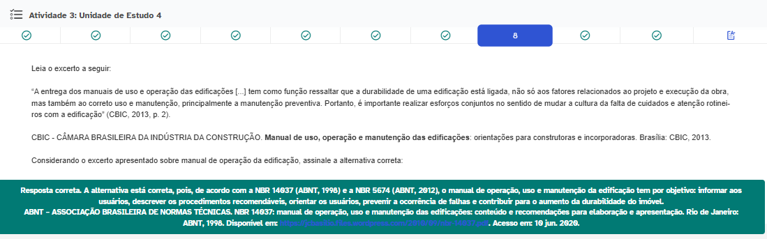 Atividade 3: Unidade de Estudo 4 8 Leia 0 excerto a seguir: "A entrega dos manuais de uso e operação das edificações [...] tem como função ressaltar que a durabilidade de uma edificação ligada, não so aos fatores relacionados ao projeto e execução da obra, mas tambem ao correto uso e manutenção, principalmente a manutenção preventiva. Portanto, é importante realizar esforços conjuntos no sentido de mudar a cultura da falta de cuidados e atenção rotinei- ros com a edificação" (CBIC, 2013, p. 2). CBIC - CÂMARA BRASILEIRA DA INDÚSTRIA DA CONSTRUÇÃO. Manual de uso, operação e manutenção das edificações: orientações para construtoras e Brasilia: CBIC, 2013. Considerando 0 excerto apresentado sobre manual de operação da edificação, assinale a alternativa correta: Resposta correta. A alternativa está correta, pois, de acordo com a NBR 14037 (ABNT, 1998) e a NBR 5674 (ABNT, 2012), manual de operação, uso e manutenção da edificação tem por objetivo: informar aos usuários, descrever os procedimentos recomendáveis, orientar os usuários, prevenir a ocorrência de falhas e contribuir para aumento da durabilidade do imóvel. ABNT ASSOCIAÇÃO BRASILEIRA DE NORMAS TÉCNICAS. NBR 14037: manual de operação, uso e manutenção das edificações: conteúdo e recomendações para elaboração e apresentação. Rio de Janeiro: ABNT, 1998. Disponível em: Acesso em: 10 jun. 2020.