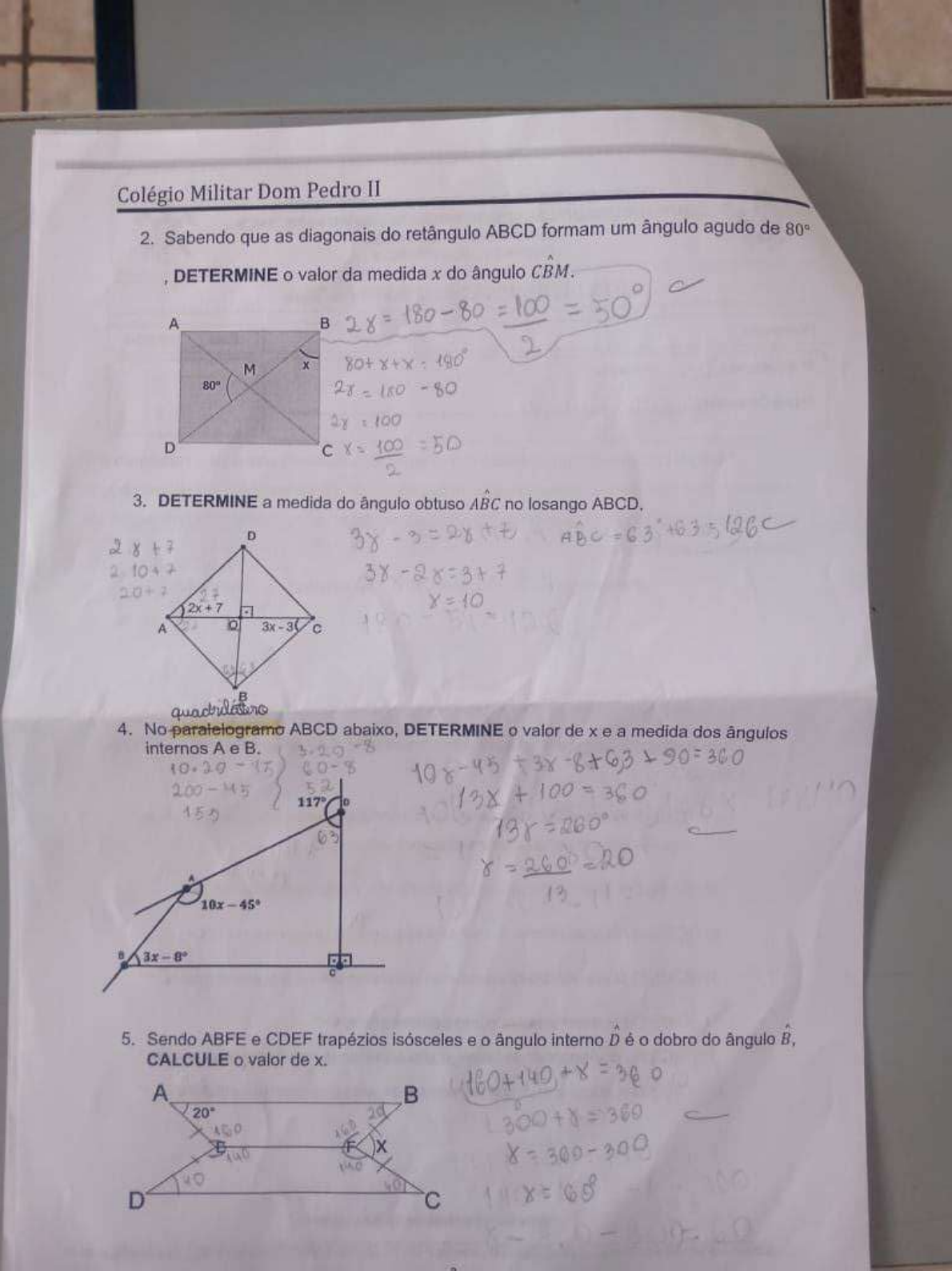 Colégio Militar Dom Pedro 2. Sabendo que as diagonais do retângulo ABCD formam um ângulo agudo de 80° DETERMINE valor da medida do ângulo A B 28 = 100 = 50° 2 M 80+ 180° 80° 80 D 100 : 2 3. DETERMINE a medida do ângulo obtuso ABC no losango ABCD, D 28+7 27 = 10 A B 4. No ABCD abaixo, DETERMINE valor de e a medida dos ângulos internos 90 200-45 45 52 D 138 63 260 13 5. Sendo ABFE e CDEF trapézios isósceles e 0 ângulo interno o dobro do ângulo CALCULE 0 valor de X. A +8 B X 40 D C