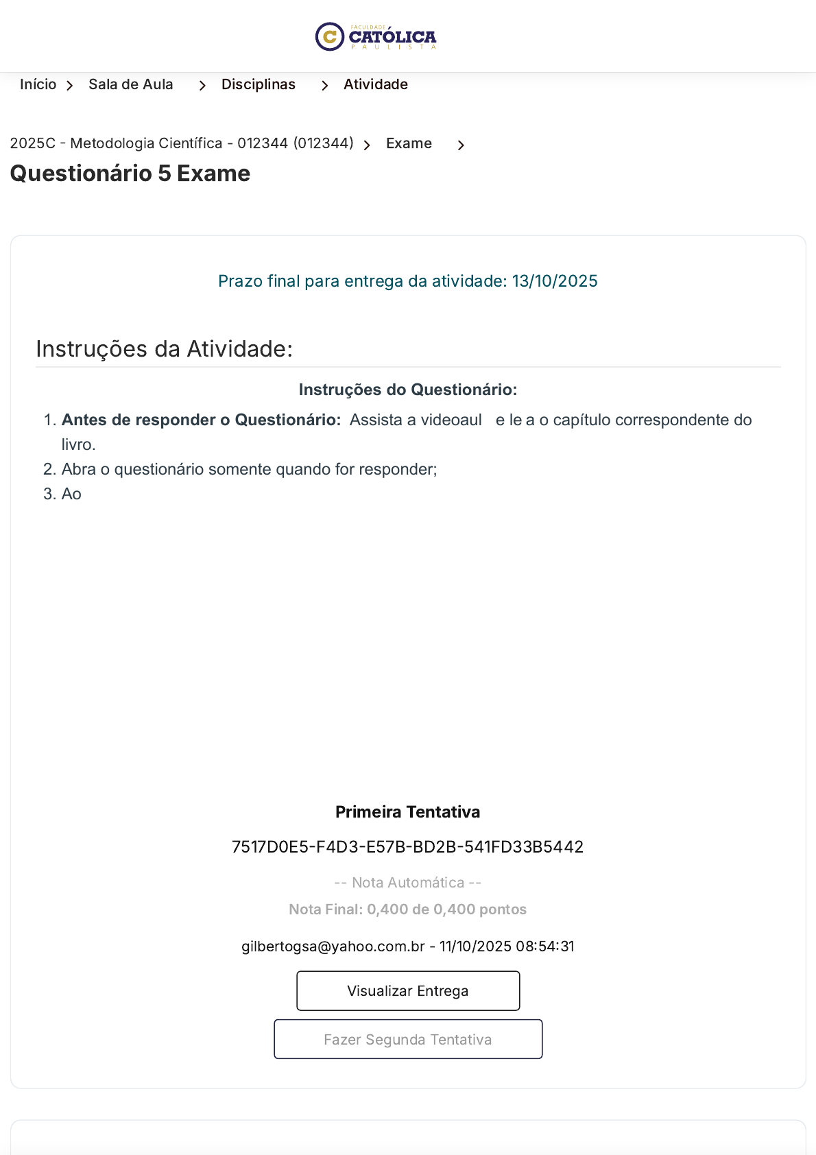 Início 〉 Sala de Aula 〉 Disciplinas 〉 Atividade 2025C - Metodologia Científica - 012344 (012344) 〉 Exame 〉 Questionário 5 Exame Instruções da Atividade: Prazo final para entrega da atividade: 13/10/2025 Instruções do Questionário: 1. Antes de responder o Questionário: Assista a videoaula e leia o capítulo correspondente do livro. 2. Abra o questionário somente quando for responder; 3. Ao abrir o questionário você terá 4 questões para responder; 4. Leia com calma todas as questões e entenda o que pede a questão: se pede a incorreta, a correta e qual o tema da questão; 5. Lembre-se de Clicar no botão "Enviar"; 6. Você tem duas tentativas para fazer o teste, a segunda tentativa é opcional; 7. Lembre-se que as respostas mudam de lugar em cada tentativa; 8. As respostas corretas só aparecem após o envio da segunda tentativa; 9. O sistema considera a maior nota entre as duas tentativas; 10. Lembre-se que na segunda tentativa zera TODAS as questões, inclusive as que você acertou na primeira tentativa. Bons estudos! Primeira Tentativa 7517D0E5-F4D3-E57B-BD2B-541FD33B5442 -- Nota Automática -- Nota Final: 0,400 de 0,400 pontos gilbertogsa@yahoo.com.br - 11/10/2025 08:54:31 Visualizar Entrega Fazer Segunda Tentativa https://ava.uca.edu.br/aluno/sala-de-aula/disciplina/modulo/atividade/487565 https://ava.uca.edu.br/aluno/sala-de-aula/disciplina/modulo/atividade/487565 https://ava.uca.edu.br/aluno/sala-de-aula/disciplina https://ava.uca.edu.br/aluno/sala-de-aula/disciplina/modulo/atividade/:id/:nome javascript:void(0); Perguntas Pergunta 1. Pergunta 2. Pergunta 3. Pergunta 4. pontos: 0,100Pergunta 1. Compreendemos que o planejamento e o plano de trabalho são etapas essenciais da pesquisa científica, mas não há dúvidas de que para realizar entrevistas também é de grande importância que o pesquisador realize planos de trabalho e um planejamento estratégico para que consiga alcançar seus resultados com sucesso. Sabemos que na entrevista, que também precisa de planejamento, podem ser utilizadas dois tipos: Múltipla Escolha: A. Aberta e fechada B. Estruturada ou não estruturada C. Padronizada e desestruturada D. Semi fechada e estruturada E. Semi aberta e estruturada Avaliação Nota Avaliada: 0 100 de 0 100 javascript:void(0); pontos: 0,100Pergunta 2. A pesquisa QUANTITATIVA é outra forma de pesquisa que também utiliza a metodologia estatística e que trabalha com variáveis expressas em forma de dados numéricos, que são analisados por ferramentas estatísticas e que podem ser classificados e comparados de formas rígidas, incluindo desvios permitidos e também correlações. Dessa forma, entendemos que a metodologia utilizada para essa pesquisa é: Múltipla Escolha: A. Dialética B. Estruturalista C. Dedutiva D. Estatística E. Tipológica 0,100 de 0,100 Avaliação Nota Avaliada: 0,100 de 0,100 javascript:void(0); pontos: 0,100Pergunta 3. A pesquisa que realiza um exame de documentos de naturezas diversas; públicos, privados ou com pessoas; inclui materiais escritos, filmes, fotos, mapas, gravações etc. é muito utilizada nos variados níveis de pesquisa científica e pode possuir diferentes métodos de análise e também utilização de fontes. Essa pesquisa é a: Múltipla Escolha: A. Padronizada e desestruturada B. Aberta e fechada C. Documental D. Semi aberta e estruturada E. Semi fechada e estruturada Avaliação Nota Avaliada: 0,100 de 0,100 javascript:void(0); pontos: 0,100Pergunta 4. Fazer uma entrevista é um momento muito importante também delicado na pesquisa científica. Sabemos que esse é o momento em que eu encontro entre duas pessoas e é realizada muitas vezes utilizando um gravador ou então um papel e uma caneta. A entrevista é muito utilizada enquanto o procedimento científico para auxiliar a coleta de dados ou então para que seja levantado reformulado a resposta ou também o questionamento sobre algum problema que possa se tornar uma questão de pesquisa científica. A entrevista tem como objetivo principal a obtenção de informações do entrevistado. Para isso, assinale a alternativa que representa dois dos objetivos principais da entrevista: Múltipla Escolha: A. Compreensão da linguagem corporal e fala B. Compreensão dos fatos e da linguagem falada C. Averiguação de dados e linguagem corporal D. Entender a vida humana e a linguagem E. Averiguação de fatos e determinação de sentimentos Fechar Visualização Avaliação Nota Avaliada: 0,100 de 0,100 javascript:void(0); 〈 Voltar aos Módulos 〈 Anterior Próxima 〉 Faculdade Católica Paulista Contato Endereço Avenida Cristo Rei, 305 – Banzato Marília, São Paulo – CEP: 17515-200 Horário De Funcionamento Segunda a quinta, das 8:00 às 20:00 horas As sextas, das 8:00 às 18:00 horas. WhatsApp : (14) 9.8826-3000 Telefone Sede: (14) 3422-1815 Central de Atendimento: 0800 664 5583 E-mail : secretaria@uca.edu.br https://www.instagram.com/faculdadecatolicaead/ https://facebook.com/ucaead https://www.youtube.com/@UcaEduBr https://www.linkedin.com/school/faculdade-catolica-paulista/?originalSubdomain=br https://maps.app.goo.gl/wWsD9QX5fVPa3h6PA https://api.whatsapp.com/send?phone=5514988263000&text=Suporte tel:14-3422-1815 tel:14-3422-1815 tel:0800-664-5583 tel:0800-664-5583 mailto:secretaria@uca.edu.br javascript:void(0);