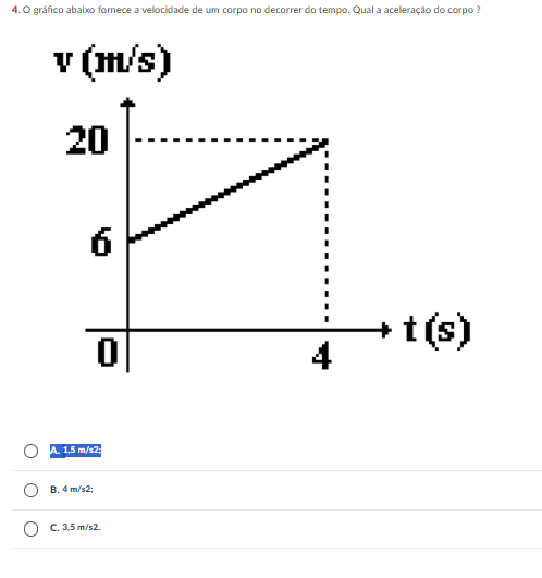 4.0 abaixo fornece a velocidade de um corpo no decorrer do tempo. Qual a aceleração do corpo ? (m/s) 20 6 t (s) 0 4 A. 1,5 m/s2; C. m/s2.