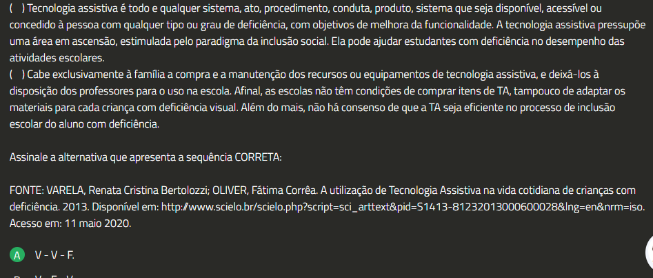Tecnologia assistiva é todo e qualquer sistema, ato, procedimento, conduta, produto, sistema que seja disponível, acessível ou concedido à pessoa com qualquer tipo ou grau de deficiência, com objetivos de melhora da funcionalidade. A tecnologia assistiva pressupõe uma área em ascensão, estimulada pelo paradigma da inclusão social. Ela pode ajudar estudantes com deficiência no desempenho das atividades escolares. Cabe exclusivamente à família a compra e a manutenção dos recursos ou equipamentos de tecnologia assistiva, e deixá-los à disposição dos professores para 0 uso na escola. Afinal, as escolas não têm condições de comprar itens de tampouco de adaptar materiais para cada criança com deficiência visual. Além do mais, não há consenso de que a TA seja eficiente no processo de inclusão escolar do aluno com deficiência. Assinale a alternativa que apresenta a sequência CORRETA: FONTE: VARELA, Renata Cristina Bertolozzi; OLIVER, Fátima Corrêa. A utilização de Tecnologia Assistiva na vida cotidiana de crianças com deficiência. 2013. Disponível em: Acesso em: 11 maio 2020. A