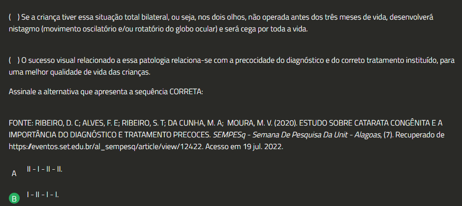 Se a criança tiver essa situação total bilateral, ou seja, nos dois olhos, não operada antes dos três meses de vida, desenvolverá nistagmo (movimento oscilatório e/ou rotatório do globo ocular) e será cega por toda a vida. sucesso visual relacionado a essa patologia relaciona-se com a precocidade do diagnóstico e do correto tratamento instituído, para uma melhor qualidade de vida das crianças. Assinale a alternativa que apresenta a sequência CORRETA: FONTE: RIBEIRO, D. C; ALVES, F. E; RIBEIRO, S. T; DA CUNHA, M. A; MOURA, M. V. (2020). ESTUDO SOBRE CATARATA CONGÊNITA E A IMPORTÂNCIA DO DIAGNÓSTICO E TRATAMENTO PRECOCES. SEMPESq Semana De Pesquisa Da Unit Alagoas, (7). Recuperado de https://eventos.set.edu.br/al_sempesq/article/view/12422. Acesso em 19 jul. 2022. I II. A I I I. B