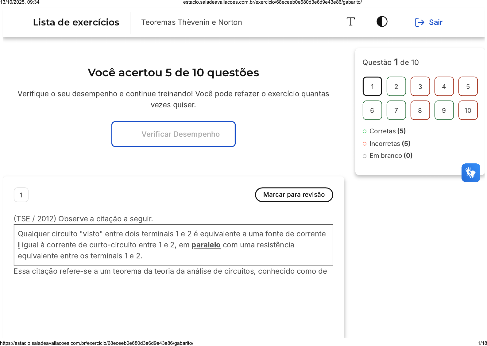 Você acertou 5 de 10 questões Verifique o seu desempenho e continue treinando! Você pode refazer o exercício quantas vezes quiser. Verificar Desempenho 1 Marcar para revisão (TSE / 2012) Observe a citação a seguir. Qualquer circuito "visto" entre dois terminais 1 e 2 é equivalente a uma fonte de corrente I igual à corrente de curto-circuito entre 1 e 2, em paralelo com uma resistência equivalente entre os terminais 1 e 2. Essa citação refere-se a um teorema da teoria da análise de circuitos, conhecido como de Questão 1 de 10 Corretas (5) Incorretas (5) Em branco (0) 1 2 3 4 5 6 7 8 9 10 Lista de exercícios Teoremas Thèvenin e Norton Sair 13/10/2025, 09:34 estacio.saladeavaliacoes.com.br/exercicio/68eceeb0e680d3e6d9e43e86/gabarito/ https://estacio.saladeavaliacoes.com.br/exercicio/68eceeb0e680d3e6d9e43e86/gabarito/ 1/18 A B C D E Thévenin Kirchoff Fourier Norton Superposição Resposta correta Parabéns, você selecionou a alternativa correta. Confira o gabarito comentado! Gabarito Comentado 13/10/2025, 09:34 estacio.saladeavaliacoes.com.br/exercicio/68eceeb0e680d3e6d9e43e86/gabarito/ https://estacio.saladeavaliacoes.com.br/exercicio/68eceeb0e680d3e6d9e43e86/gabarito/ 2/18 A B A citação apresentada no enunciado refere-se ao Teorema de Norton. Este teorema estabelece que qualquer circuito linear pode ser substituído por um circuito equivalente composto por uma fonte de corrente em paralelo com uma resistência. A corrente da fonte é igual à corrente de curto-circuito entre os terminais observados e a resistência é a resistência equivalente vista desses terminais. As demais alternativas, Thévenin, Kirchoff, Fourier e Superposição, são outros teoremas ou princípios da análise de circuitos, mas não se encaixam na descrição apresentada no enunciado. 2 Marcar para revisão (Concurso DPE - RJ / 2019) A figura abaixo apresenta um circuito composto de uma fonte e cinco resistores. Sabe-se que a ddp da fonte é igual a U e que os resistores são todos iguais a R. O equivalente de Norton visto dos pontos A e B é composto por: uma fonte de corrente U/3R e um resistor R em série. uma fonte de tensão U/8R e um resistor 8R/3 em série. 13/10/2025, 09:34 estacio.saladeavaliacoes.com.br/exercicio/68eceeb0e680d3e6d9e43e86/gabarito/ https://estacio.saladeavaliacoes.com.br/exercicio/68eceeb0e680d3e6d9e43e86/gabarito/ 3/18 C D E uma fonte de tensão U/8R e um resistor 8R/3 em paralelo. uma fonte de tensão 5U/9 e um resistor R em série. uma fonte de tensão 7U/9 e um resistor 3R em paralelo. Resposta correta Parabéns, você selecionou a alternativa correta. Confira o gabarito comentado! Gabarito Comentado Gabarito: uma fonte de tensão U/8R e um resistor 8R/3 em paralelo. Justificativa: Aplicando o curto-circuito na fonte de tensão, faz-se posteriormente o cálculo do equivalente entre os resistores. Assim: Para o cálculo da tensão de Thévenin: Assim: Req1 = R + R = 2R Req2 = = R 2RxR 3R 2 3 Req3 = R + R + R 2 3 RN = R 8 3 i = U 3R Vth = R =U 3R U 3 13/10/2025, 09:34 estacio.saladeavaliacoes.com.br/exercicio/68eceeb0e680d3e6d9e43e86/gabarito/ https://estacio.saladeavaliacoes.com.br/exercicio/68eceeb0e680d3e6d9e43e86/gabarito/ 4/18 A B C Transformando as fontes: V = Ri IN = U 3 8R/3 IN = U 8R 3 Marcar para revisão (TSE / 2012) Observe a citação a seguir. Qualquer circuito "visto" entre dois terminais 1 e 2 é equivalente a uma fonte de tensão V igual à tensão em aberto V12 entre 1 e 2, em série com uma resistência equivalente entre os terminais 1 e 2. Essa citação refere-se a um teorema da teoria da análise de circuitos, conhecido como de Thévenin Kirchoff Fourier 13/10/2025, 09:34 estacio.saladeavaliacoes.com.br/exercicio/68eceeb0e680d3e6d9e43e86/gabarito/ https://estacio.saladeavaliacoes.com.br/exercicio/68eceeb0e680d3e6d9e43e86/gabarito/ 5/18 D E Norton Superposição Resposta incorreta Opa! A alternativa correta é a letra A. Confira o gabarito comentado! Gabarito Comentado O teorema de Thévenin, mencionado na alternativa A, é o que melhor se aplica à descrição dada no enunciado. Este teorema afirma que qualquer circuito linear, ativo e bilateral, pode ser substituído por um circuito equivalente composto por uma fonte de tensão (V) em série com uma resistência (R), quando observado de dois terminais. A fonte de tensão é igual à tensão em aberto entre os terminais e a resistência é a resistência equivalente vista desses terminais. Portanto, a alternativa correta é a A: Thévenin. 4 Marcar para revisão (TELEBRAS / 2013) Considerando os circuitos elétricos representados nas figuras abaixo e que o potencial no nó A do circuito representado na figura I é de 0 volt, calcule a resistência de Norton vista dos terminais A-B. 13/10/2025, 09:34 estacio.saladeavaliacoes.com.br/exercicio/68eceeb0e680d3e6d9e43e86/gabarito/ https://estacio.saladeavaliacoes.com.br/exercicio/68eceeb0e680d3e6d9e43e86/gabarito/ 6/18 A B C D E 5Ω 10Ω 15Ω 25Ω 20Ω Resposta incorreta Opa! A alternativa correta é a letra A. Confira o gabarito comentado! 13/10/2025, 09:34 estacio.saladeavaliacoes.com.br/exercicio/68eceeb0e680d3e6d9e43e86/gabarito/ https://estacio.saladeavaliacoes.com.br/exercicio/68eceeb0e680d3e6d9e43e86/gabarito/ 7/18 Gabarito Comentado Gabarito: 5Ω Justificativa: RN = = 5Ω10x10 20 5 Marcar para revisão (Fundação Getulio Vargas - FGV - 2013 - MPE/MS) A figura a seguir apresenta um circuito de corrente contínua, composto de uma fonte e três resistores. O circuito equivalente de Norton, visto pelo resistor R, entre os pontos A e B, é composto por: 13/10/2025, 09:34 estacio.saladeavaliacoes.com.br/exercicio/68eceeb0e680d3e6d9e43e86/gabarito/ https://estacio.saladeavaliacoes.com.br/exercicio/68eceeb0e680d3e6d9e43e86/gabarito/ 8/18 A B C D E uma fonte de 3A e um resistor em série de 50Ω. uma fonte de 3A e um resistor em série de 12Ω. uma fonte de 3A e um resistor em paralelo de 12Ω. uma fonte de 6A e um resistor em paralelo de 30Ω. uma fon