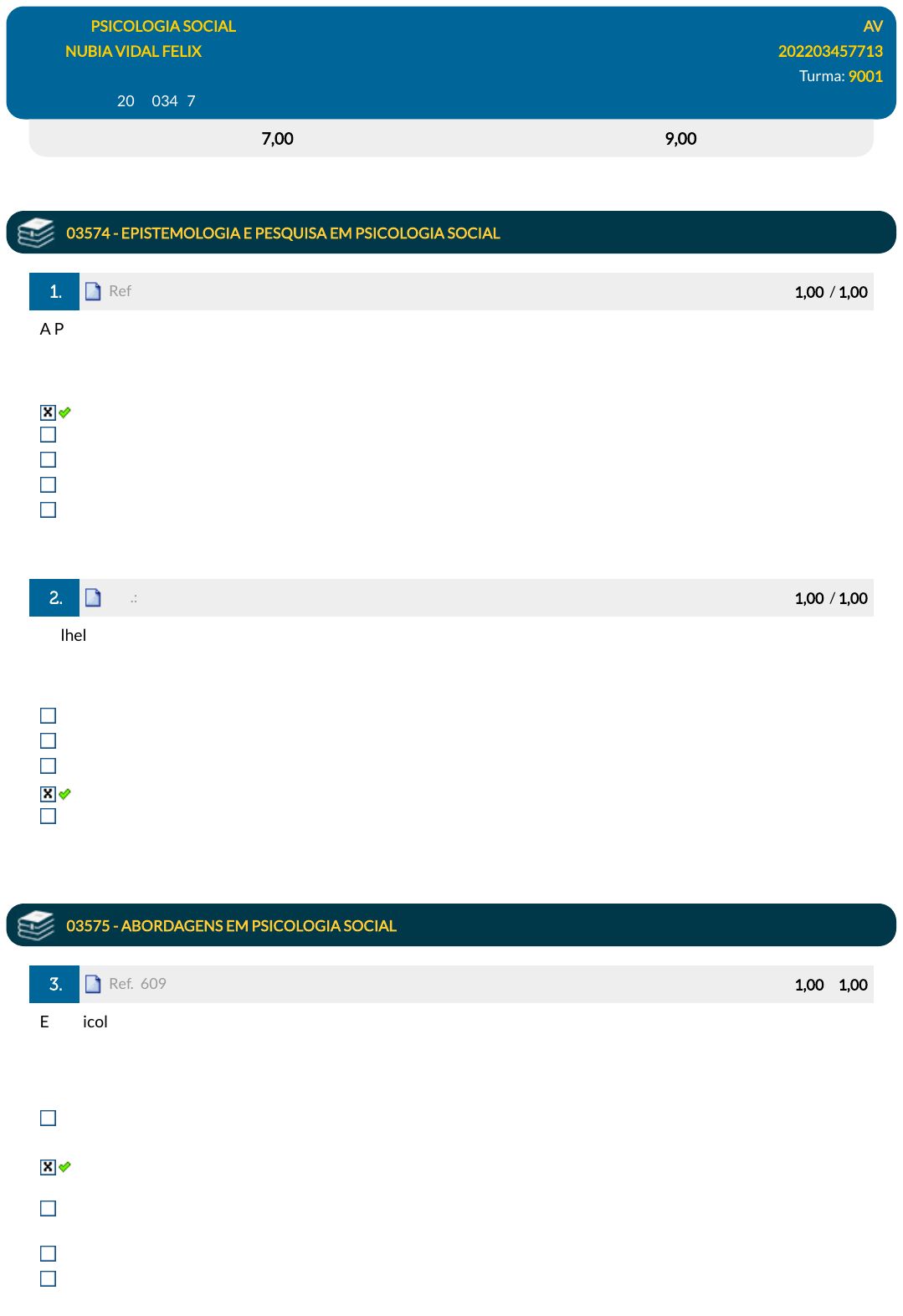 Disciplina: PSICOLOGIA SOCIAL AV Aluno: NUBIA VIDAL FELIX 202203457713 Turma: 9001 DGT0347_AV_202203457713 (AG) 19/04/2023 15:12:33 (F) Avaliação: 7,00 pts Nota SIA: 9,00 pts 03574 - EPISTEMOLOGIA E PESQUISA EM PSICOLOGIA SOCIAL 1. Ref.: 7663062 Pontos: 1,00 / 1,00 A Psicologia Social durante as primeiras décadas do século XX seguia as diretrizes de uma psicologia social com foco mais no indivíduo. As abordagens críticas a este modelo dominante de Psicologia Social no Brasil até a década de 70 tinham a seguinte premissa: Consideravam que a ciência não é isenta ao estudar a realidade social. Entendiam que a pesquisa experimental era essencial para o estudo das relações entre indivíduo e sociedade. Consideravam que o empírico é o lugar de legitimação e produção de conhecimento. A base de um modelo cientí�co das ciências naturais. Privilegiavam o olhar especialista na leitura dos fenômenos humanos. 2. Ref.: 7663063 Pontos: 1,00 / 1,00 Wilhelm Wundt (1832-1920) foi �lósofo, médico e psicólogo alemão, mas seu papel dentro da Psicologia o destacou como o pai da disciplina, devido a seus estudos laboratorias. Portanto, Wundt ao trabalhar na construção de uma ciência psicológica, preconizava a existência de duas psicologias: Uma behaviorista e outra clínica. Uma experimental e outra cognitiva. Uma fenomenológica e outra social. Uma experimental e outra social. Uma aplicada e outra social. 03575 - ABORDAGENS EM PSICOLOGIA SOCIAL 3. Ref.: 6098042 Pontos: 1,00 / 1,00 Em Psicologia Social, atitude é o conceito que engloba os sentimentos positivos, negativos ou neutros que desenvolvemos em relação a pessoas e objetos sociais em geral. Assinale a alternativa correta sobre o conceito de atitude. O componente comportamental da atitude é a combinação entre a cognição e inconsciente, combinação esta que é instigadora de comportamentos frente a certas situações. O componente cognitivo da atitude se refere à representação cognitiva que uma pessoa tem em relação a um objeto, como as crenças, os conhecimentos e as formas de encarar o objeto social. Valores são categorias gerais mas não são dotados de componentes cognitivos, afetivos e predisponentes de comportamento. O componente afetivo da atitude se refere a um sentimento somente a favor de determinado objeto social. Atitudes e opiniões são sinônimos, pois ambas possuem componentes cognitivos e afetivos. javascript:alert('C%C3%B3digo da quest%C3%A3o: 7663062.'); javascript:alert('C%C3%B3digo da quest%C3%A3o: 7663062.'); javascript:alert('C%C3%B3digo da quest%C3%A3o: 7663063.'); javascript:alert('C%C3%B3digo da quest%C3%A3o: 7663063.'); javascript:alert('C%C3%B3digo da quest%C3%A3o: 6098042.'); javascript:alert('C%C3%B3digo da quest%C3%A3o: 6098042.'); 4. Ref.: 6098044 Pontos: 0,00 / 1,00 Em junho de 2003, o Conselho Federal de Psicologia-CFP editou a Resolução Nº 5/2003 que reconhece a Psicologia Social como especialidade da Psicologia. Sobre a Psicologia Social e seus conceitos, analise as a�rmativas abaixo. I - É um ramo da psicologia que estuda como as pessoas pensam, in�uenciam e se relacionam umas com as outras. II - Como área de conhecimento, passa a estudar o psiquismo humano, objeto da psicologia, buscando compreender como se dá a construção deste mundo interno a partir das relações sociais vividas pelo homem. III - O mundo objetivo passa a ser visto, não como fator de in�uência para o desenvolvimento da subjetividade, mas como fator constitutivo. Marque a alternativa que apresenta a(s) a�rmativa(s) correta(s). Apenas I e III. Apenas II. Apenas I, II e III. Apenas I. Apenas I e II. 03576 - COGNIÇÃO SOCIAL 5. Ref.: 6097583 Pontos: 0,00 / 1,00 Quando um prognóstico é validado inicia-se um processo de ação mental como se essa hipótese já fosse entendida como realidade, contribuindo mesmo de forma involuntária para que ele se concretize, esse processo é chamado de profecia Auto-realizadora. estereótipo. heurísticas. profecia concretizável. atitudes. 6. Ref.: 6097651 Pontos: 1,00 / 1,00 Para Vitor Frankl o sentido da vida se revela também por valores que não sejam especialmente fecundos de criatividade ou de riquezas vivenciais. Frankl os chama de valores de atitude, e cita como exemplo, indivíduos, que vivendo sob grandes limitações impostas por doença e sofrimento, ainda assim, adotam diante desta infeliz situação uma atitude corajosa diante da dor. Marque a alternativa que apresenta o fator que difere o Valor de Atitude. Sua generalização. Seu componente emocional. Seu componente afetivo. Seu componente comportamental. Seu componente cognitivo. javascript:alert('C%C3%B3digo da quest%C3%A3o: 6098044.'); javascript:alert('C%C3%B3digo da quest%C3%A3o: 6098044.'); javascript:alert('C%C3%B3digo da quest%C3%A3o: 6097583.'); javascript:alert('C%C3%B3digo da quest%C3%A3o: 6097583.'); javascript:alert('C%C3%B3digo da quest%C3%A3o: 6097651.'); javascript:alert('C%C3%B3digo da quest%C3%A3o: 6097651.'); 03577 - IDENTIDADE E RELAÇÕES SOCIAIS 7. Ref.: 7650243 Pontos: 1,00 / 1,00 Todos nós passamos por processos de masculinização ou feminilização quando aprendemos o que é ser homem ou mulher comportamentalmente falando. Sobre essa a�rmação, assinale a alternativa correta. Os aspectos formadores da identidade humana não derivam de um combinado de neuro suscetibilidade geneticamente predisposta, porque não há qualquer relação entre a formação da identidade e os genes. A construção social dos papéis, gostos, interesses, valores, modos de falar e vestir atribuíveis ao masculino e ao feminino, com os quais nos identi�camos durante a convivência com pessoas detentoras de tais características, de�ne o sexo biológico de cada indivíduo. São aspectos formadores da identidade humana a maneira como os indivíduos vivenciam suas experiências subjetivas e desenvolvem um conjunto de características que compõem suas personalidades. A partir de