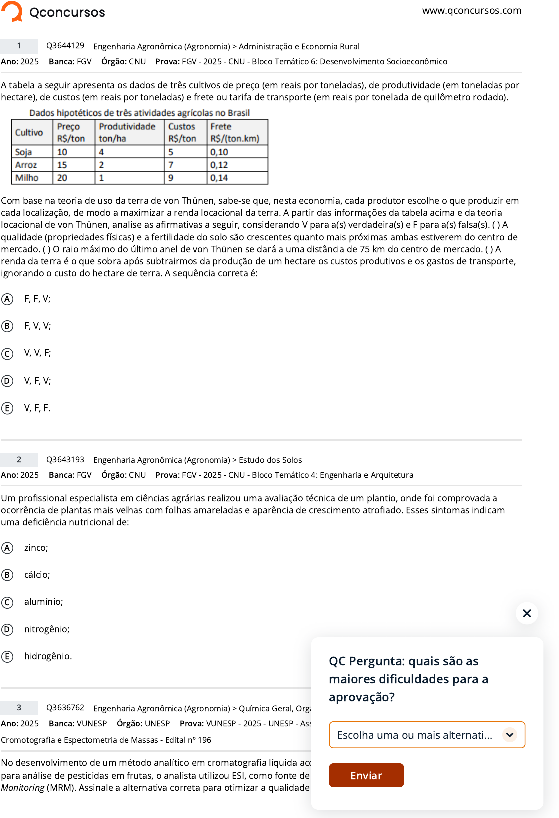 www.qconcursos.com Ano: 2025 Banca: FGV Órgão: CNU A tabela a seguir apresenta os dados de três cultivos de preço (em reais por toneladas), de produtividade (em toneladas por hectare), de custos (em reais por toneladas) e frete ou tarifa de transporte (em reais por tonelada de quilômetro rodado). Com base na teoria de uso da terra de von Thünen, sabe-se que, nesta economia, cada produtor escolhe o que produzir em cada localização, de modo a maximizar a renda locacional da terra. A partir das informações da tabela acima e da teoria locacional de von Thünen, analise as afirmativas a seguir, considerando V para a(s) verdadeira(s) e F para a(s) falsa(s). ( ) A qualidade (propriedades físicas) e a fertilidade do solo são crescentes quanto mais próximas ambas estiverem do centro de mercado. ( ) O raio máximo do último anel de von Thünen se dará a uma distância de 75 km do centro de mercado. ( ) A renda da terra é o que sobra após subtrairmos da produção de um hectare os custos produtivos e os gastos de transporte, ignorando o custo do hectare de terra. A sequência correta é: A F, F, V; B F, V, V; C V, V, F; D V, F, V; E V, F, F. Ano: 2025 Banca: FGV Órgão: CNU Um profissional especialista em ciências agrárias realizou uma avaliação técnica de um plantio, onde foi comprovada a ocorrência de plantas mais velhas com folhas amareladas e aparência de crescimento atrofiado. Esses sintomas indicam uma deficiência nutricional de: A zinco; B cálcio; C alumínio; D nitrogênio; E hidrogênio. Ano: 2025 Banca: VUNESP Órgão: UNESP No desenvolvimento de um método analítico em cromatografia líquida acoplada à espectrometria de massas (LC-MS/MS) para análise de pesticidas em frutas, o analista utilizou ESI, como fonte de ionização e operando no modo Multiple Reaction Monitoring (MRM). Assinale a alternativa correta para otimizar a qualidade analítica dos dados. 1 Q3644129 >Engenharia Agronômica (Agronomia) Administração e Economia Rural Prova: FGV - 2025 - CNU - Bloco Temático 6: Desenvolvimento Socioeconômico 2 Q3643193 >Engenharia Agronômica (Agronomia) Estudo dos Solos Prova: FGV - 2025 - CNU - Bloco Temático 4: Engenharia e Arquitetura 3 Q3636762 >Engenharia Agronômica (Agronomia) Química Geral, Orgânica e Analítica Prova: VUNESP - 2025 - UNESP - Assistente de Suporte Acadêmico IV - Área de Atuação: Cromotografia e Espectometria de Massas - Edital nº 196 QC Pergunta: quais são as maiores dificuldades para a aprovação? Enviar Escolha uma ou mais alternati… https://www.qconcursos.com/ https://www.qconcursos.com/questoes-de-concursos/bancas/fgv https://www.qconcursos.com/questoes-de-concursos/institutos/cnu https://www.qconcursos.com/questoes-de-concursos/bancas/fgv https://www.qconcursos.com/questoes-de-concursos/institutos/cnu https://www.qconcursos.com/questoes-de-concursos/bancas/vunesp https://www.qconcursos.com/questoes-de-concursos/institutos/unesp https://www.qconcursos.com/questoes-de-concursos/questoes/6e603119-a3 https://www.qconcursos.com/questoes-de-concursos/disciplinas/engenharia-agronomica-agronomia-engenharia-agronomica-agronomia https://www.qconcursos.com/questoes-de-concursos/disciplinas/engenharia-agronomica-agronomia-engenharia-agronomica-agronomia/administracao-e-economia-rural https://www.qconcursos.com/questoes-de-concursos/provas/fgv-2025-cnu-bloco-tematico-6-desenvolvimento-socioeconomico https://www.qconcursos.com/questoes-de-concursos/questoes/e927f7bb-a3 https://www.qconcursos.com/questoes-de-concursos/disciplinas/engenharia-agronomica-agronomia-engenharia-agronomica-agronomia https://www.qconcursos.com/questoes-de-concursos/disciplinas/engenharia-agronomica-agronomia-engenharia-agronomica-agronomia/estudo-dos-solos https://www.qconcursos.com/questoes-de-concursos/provas/fgv-2025-cnu-bloco-tematico-4-engenharia-e-arquitetura https://www.qconcursos.com/questoes-de-concursos/questoes/c9144f55-a0 https://www.qconcursos.com/questoes-de-concursos/disciplinas/engenharia-agronomica-agronomia-engenharia-agronomica-agronomia https://www.qconcursos.com/questoes-de-concursos/disciplinas/engenharia-agronomica-agronomia-engenharia-agronomica-agronomia/quimica-geral-organica-e-analitica https://www.qconcursos.com/questoes-de-concursos/provas/vunesp-2025-unesp-assistente-de-suporte-academico-iv-area-de-atuacao-cromotografia-e-espectometria-de-massas-edital-n-196 https://www.qconcursos.com/questoes-de-concursos/provas/vunesp-2025-unesp-assistente-de-suporte-academico-iv-area-de-atuacao-cromotografia-e-espectometria-de-massas-edital-n-196 A A utilização do modo MRM limita a sensibilidade do sistema, sendo recomendada apenas para triagem qualitativa. B O uso de um solvente altamente salino na fase móvel melhora a ionização por ESI, aumentando o sinal do analito. C A escolha de uma transição m/z 300 -> m/z 300 no modo MRM indica que não ocorreu fragmentação do íon precursor, invalidando a análise quantitativa. D A aplicação de curvas de calibração utilizando áreas de transições MRM específicas permite a quantificação seletiva, mesmo em matrizes complexas, desde que o método esteja validado. E O uso do modo full scan (varredura total) em LC-MS/MS é preferível no modo MRM para quantificação de traços, pois oferece maior seletividade e menor ruído de fundo. Ano: 2025 Banca: VUNESP Órgão: UNESP A cultura da cana-de-açúcar é suscetível a diversas pragas, que comprometem o rendimento agrícola e industrial. Entre essas pragas, há uma que predomina nos canaviais do Brasil e que causa prejuízo direto devido à abertura de galerias pelas lagartas, ocasionando perda de peso da planta e podendo levá-la à morte, especialmente em canas novas. A praga de que trata o texto apresentado é: A broca-da-cana-de-açúcar (Diatraea saccharalis). B cigarrinha-da-raiz (Mahanarva fimbriolata). C broca-dos-rizomas (Migdolus fryanus). D bicudo-da-cana-de-açúcar (Sphenophorus levis). E cumpim-da-cana (Heterotermes ten