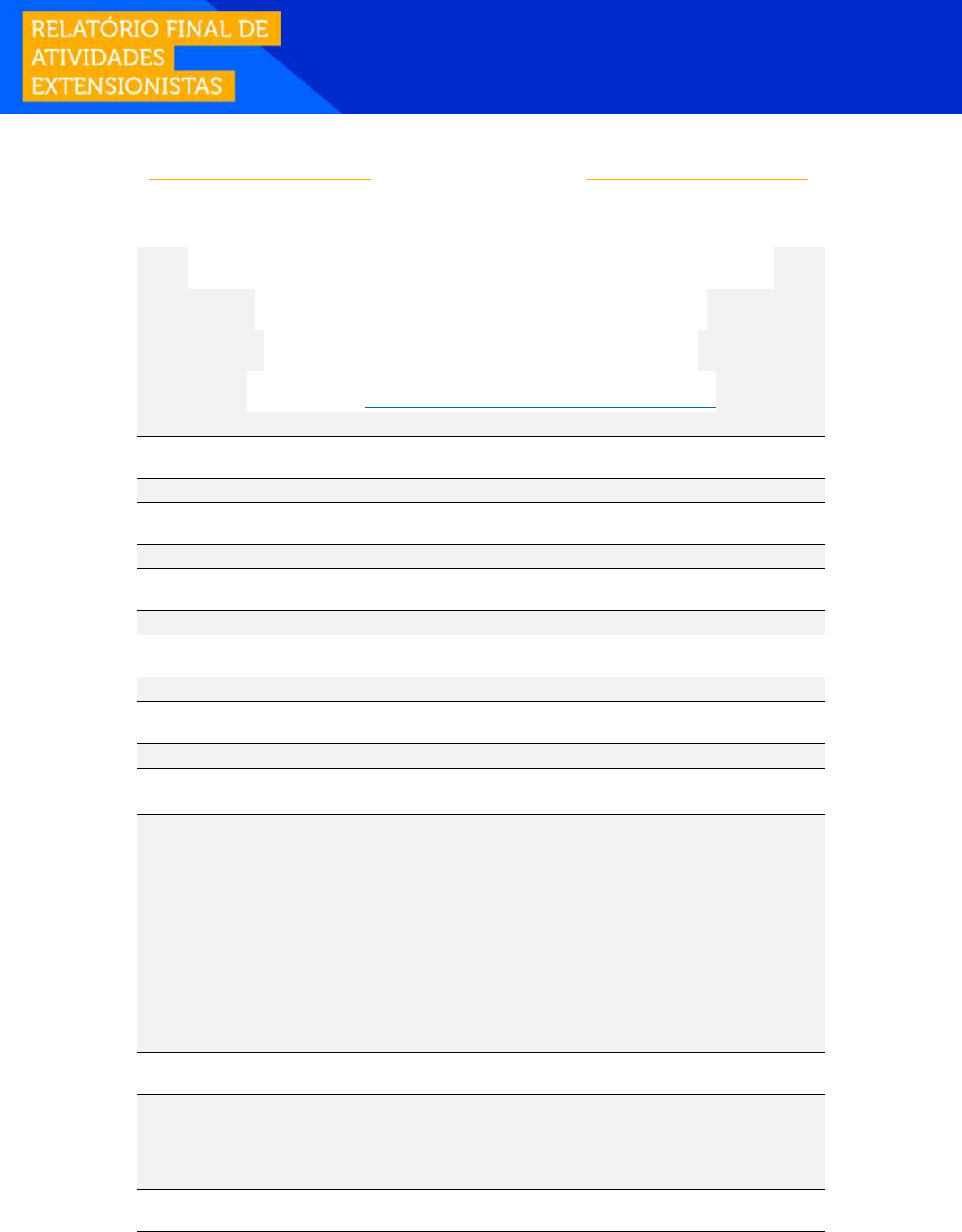 1 DADOS DO ALUNO: Aluno: [Nome completo] Tenho Pronto para envio, caso tenha interesse, entre em contato: WhatsApp: (73) 99900 0037 E-mail: aleksbraw@gmail.com RA: [Número do RA do aluno] POLO / UNIDADE: CURSO: CST EM GESTÃO DA PRODUÇÃO INDUSTRIAL COMPONENTE CURRICULAR: PROJETO DE EXTENSÃO III - GESTÃO DA PRODUÇÃO INDUSTRIAL PROGRAMA DE EXTENSÃO: PROGRAMA DE INOVAÇÃO E EMPREENDEDORISMO. FINALIDADE E MOTIVAÇÃO: A finalidade da extensão no Programa de Inovação e Empreendedorismo do Curso Superior de Tecnologia em Gestão da Produção Industrial está relacionada ao desenvolvimento e implementação de iniciativas para o atendimento de problemas da sociedade, gerando oportunidade para elaborar, analisar e/ou implementar soluções que atendam questões locorregionais, como gerenciamento de cadeia de suprimentos, processos de fabricação, planejamento e controle da produção, automação de processos industriais, entre outros. São diversos os locais que poderão contemplar esse projeto extensionista, como: prefeituras; associações de bairros; escolas municipais e estaduais; instituições religiosas; organizações não governamentais (ONGs). COMPETÊNCIAS: I - Racionalizar os processos da produção industrial; II - Viabilizar os custos dos processos industriais; III - Gerenciar o processo de manutenção industrial aplicando suas técnicas, métodos e procedimentos. PERFIL DO EGRESSO: mailto:aleksbraw@gmail.com 2 A IES busca que o egresso do Curso Superior de Tecnologia em Gestão da Produção Industrial seja um profissional ético, crítico, reflexivo, propositivo, humanístico, dinâmico, sendo que pelas atividades extensionistas vinculadas ao Programa de Inovação e Empreendedorismo, o egresso possa desenvolver habilidades e competências que permita analisar, apoiar e implantar sistemas de produção, processos de fabricação, gestão da cadeia de suprimentos, automação de processos industriais, bem como interagir com as novas situações e demandas da sociedade, com isenção e responsabilidade social, comprometido com legislação, primando pela busca do conhecimento e da aprendizagem autônoma, investigativa, empreendedora e cooperativa com o emprego de perspectivas multidisciplinares. SOFT SKILLS (COMPETÊNCIAS SOCIOEMOCIONAIS): Análise e resolução de problemas Tomada de Decisão Aprendizado Ativo OBJETIVOS DE APRENDIZAGEM: Os objetivos da extensão vinculados ao Programa de Inovação e Empreendedorismo do Curso Superior de Tecnologia em Gestão da Produção Industrial estão relacionados a disseminação e aplicação de conteúdos, técnicas e metodologias das áreas de análise e estudos operacionais, planejamento de produção e gestão. CONTEÚDOS: I - Gestão de Projetos; II - Gestão da Produção e Operações; III - Planejamento Estratégico. INDICAÇÕES BIBLIOGRÁFICAS: WYOCKI, Robert K. Gestão eficaz de projetos. São Paulo: Saraiva, 2020. ALVES FILHO, Alceu Gomes ...[et al.]. Gestão da produção e operações: abordagem integrada. São Paulo: Atlas, 2019. ANDRADE, Arnaldo Rosa de. Planejamento estratégico: formulação, implementação e controle. 2. ed. São Paulo: Atlas, 2016. RELATÓRIO FINAL: Aluno e Aluna, após realizar suas atividades de extensão, é necessário que você o formalize, enviando esse Relatório Final para ser avaliado junto ao seu Ambiente Virtual (AVA) e também para você poder comprovar sua atuação. Para o preenchimento, busque as anotações junto ao TEMPLATE PCDA para auxiliar na apresentação das atividades desenvolvidas. Todos os campos são de preenchimento obrigatório! DESCRIÇÃO DA AÇÃO COM RESULTADOS ALCANÇADOS 3 Metas dos Objetivos de Desenvolvimento Sustentável (ODS) aderentes a este projeto: CAMPO OBRIGATÓRIO – busque no seu Template PDCA quais Metas você selecionou como aderentes ao seu projeto, conforme cada Objetivo de Desenvolvimento Sustentável (ODS) da Organização das Nações Unidas (ONU) que você explorou no seu planejamento. Liste as Metas selecionadas (pelo menos uma opção): Local de realização da atividade extensionista: Durante a ação: Caso necessário, houve mudança de estratégia para alcançar o resultado: Resultado da ação: Conclusão: Depoimentos (se houver): RELATE SUA PERCEPÇÃO DAS AÇÕES EXTENSIONISTAS REALIZADAS NO PROGRAMA DESENVOLVIDO: CAMPO OBRIGATÓRIO – relate em no mínimo 15 (quinze) linhas sua experiência com as ações extensionistas. O texto deve ser de sua autoria e inédito, evite plágio. Questões norteadoras: (1) Você notou que suas habilidades profissionais foram aprimoradas, com a atuação nas ações extensionistas? (2) Você identificou melhoria/resolução do problema identificado? (3) Você conseguiu articular os conhecimentos adquiridos no curso com as ações extensionistas? Ao escrever seu texto evite deixá-lo em forma de respostas as questões norteadoras, relate sua experiência em forma de texto dissertativo com justificativas. DEPOIMENTO DA INSTITUIÇÃO PARTICIPANTE CAMPO OBRIGATÓRIO - insira depoimento(s) do(s) gestor(es) da instituição/órgão/associação participante que contribuam como um feedback da ação realizada por você. 4 REFERÊNCIAS BIBLIOGRÁFICAS CAMPO OBRIGATÓRIO – Siga a normas ABNT, para isso consulte sua Biblioteca Virtual; Utilize como referências bibliográficas as indicações do Campo: Indicações Bibliográficas e as demais referências utilizadas no desenvolvimento do seu projeto. AUTOAVALIAÇÃO DA ATIVIDADE: Realize a sua avaliação em relação à atividade desenvolvida considerando uma escala de 0 a 10 para cada pergunta, assinalando com um X: 1. A atividade permitiu o desenvolvimento do projeto de extensão articulando as competências e conteúdos propostos junto ao Curso? 0 1 2 3 4 5 6 7 8 9 10 () () () () () () () () () () () 2. A atividade possui carga horária suficiente para a sua realização? 0 1 2 3 4 5 6 7 8 9 10 () () () () () () () () () () () 3. A atividade é 
