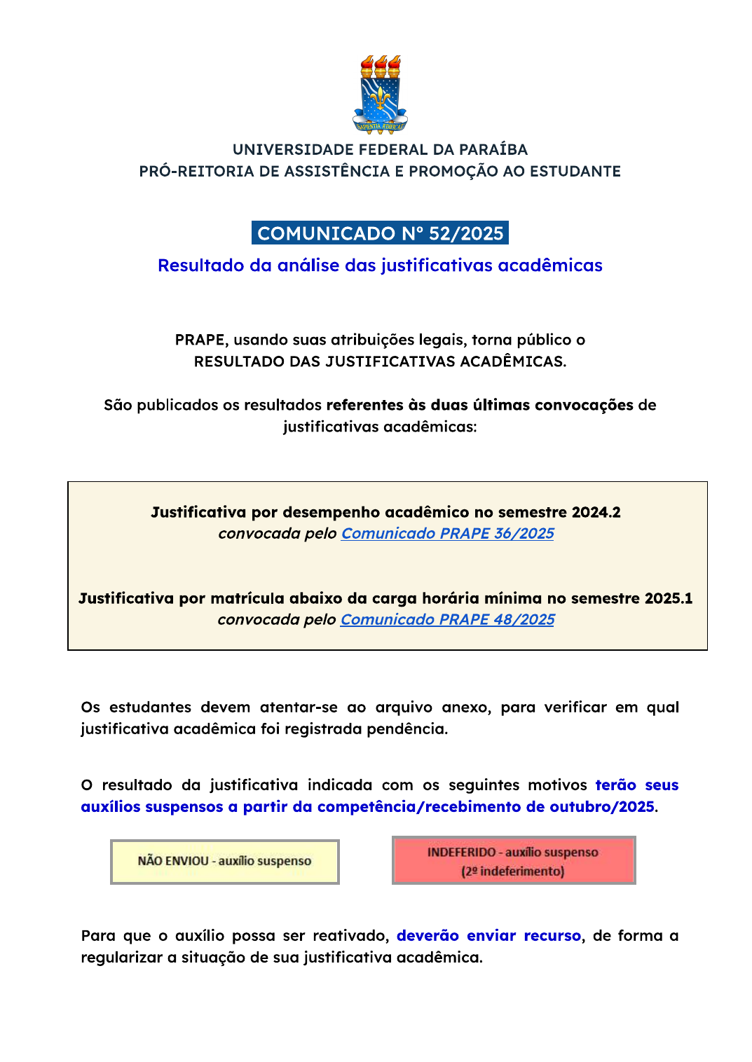 UNIVERSIDADE FEDERAL DA PARAÍBA PRÓ-REITORIA DE ASSISTÊNCIA E PROMOÇÃO ESTUDANTE COMUNICADO N° 52/2025 Resultado da análise das justificativas acadêmicas PRAPE, usando suas atribuições legais, torna público RESULTADO DAS JUSTIFICATIVAS ACADÊMICAS. São publicados os resultados referentes às duas últimas convocações de justificativas acadêmicas: Justificativa por desempenho acadêmico no semestre 2024.2 convocada pelo Comunicado PRAPE 36/2025 Justificativa por matrícula abaixo da carga horária mínima no semestre 2025.1 convocada pelo Comunicado PRAPE 48/2025 Os estudantes devem atentar-se ao arquivo anexo, para verificar em qual justificativa acadêmica foi registrada pendência. resultado da justificativa indicada com os seguintes motivos terão seus auxílios suspensos a partir da competência/recebimento de outubro/2025. INDEFERIDO auxílio suspenso NÃO ENVIOU - auxílio suspenso indeferimento) Para que auxílio possa ser reativado, deverão enviar recurso, de forma a regularizar a situação de sua justificativa acadêmica.Orientações para envio de recursos Conforme Portaria PRAPE n° 02/2022 (alterada pela Portaria PRAPE 07/2023), o(a) discente que NÃO ENVIOU ou que obteve SEGUNDO INDEFERIMENTO, terão os auxílios suspensos a partir da competência/recebimento de outubro/2025. Ressaltamos que esses discentes, indicados na planilha anexa, poderão enviar recurso via SIGAA - Solicitação Eletrônica, até dia 10/10/2025 (sexta-feira). COMO ENVIAR A JUSTIFICATIVA ? Para enviar recurso da justificativa, estudante deve acessar SIGAA, com seu login e senha, e seguir passo a passo: Deve ir no menu Bolsas > Solicitações Eletrônicas. Clicar em >Enviar Nova SolicitaçãoJustificativa Motivo da convocação necessária Atestado ou laudo médico Não obteve aprovação mínima em comprovando doença 50% dos componentes curriculares impeditiva. matriculados - Comprovação de grave problema pessoal/familiar que tenha interferido Reprovou por falta diretamente no desempenho Justificativa de desempenho acadêmico. acadêmico no semestre 2024.2 Parecer emitido pela coordenação de curso que justifique o baixo rendimento Ultrapassou prazo máximo de acadêmico ou as reprovações conclusão do curso (tempo mínimo + 2 por falta, os quais afetaram o semestres, conforme e-MEC) processo ensino aprendizagem. Apresentação de declaração da Coordenação do curso atestando a não oferta Justificativa de matrícula abaixo da carga horária no semestre 2025.1 suficiente de componentes curriculares para matrícula no semestre 2024.2 João Pessoa, 23 de setembro de 2025. GEÓRGIA DANTAS MACEDO Pró-Reitora Pró-reitoria de Assistência e Promoção Estudantis (PRAPE)