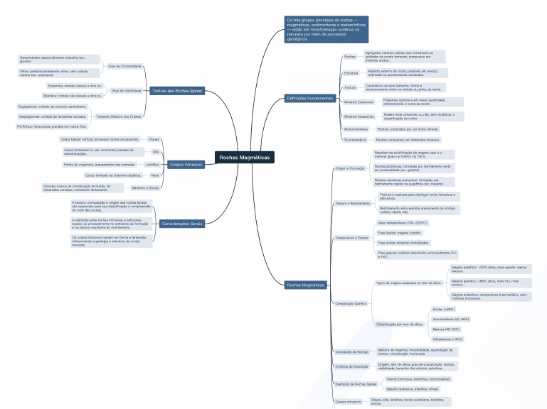 Os três grupos principais de rochas magmáticas, sedimentares e metamórficas estão em transformação continua na natureza por meio de processos geológicos. Agregados naturais sólidos que constituem as Holocristalina: essencialmente cristalina (ex.: Rochas unidades da crosta terrestre, compostos por granito). minerais Grau de Cristalinidade Vitrea: predominantemente vitrea, sem cristais Aspecto externo da rocha, podendo ser maciço, Estrutura visiveis (ex.: obsidiana). orientado ou apresentando cavidades. cristais visiveis a olho nu. Caracteriza-s pelo tamanho, forma e Textura Grau de Visibilidade Textura das Rochas igneas relacionamento entre cristais ou grãos da rocha. cristais não visiveis a olho Definições Fundamentais Minerais Essenciais Presentes sempre e em maior quantidade, determinando nome da rocha. Equigranular: cristais de tamanho semelhante Podem estar presentes ou não, sem modificar a cristais de tamanhos variados Tamanho Relativo dos Cristais Minerais Acessórios classificação da fenocristais grandes em matriz Monomineralica Rochas compostas por um único mineral. Corpo tabular vertical, atravessa rochas Diques Pluriminerálica Rochas compostas por diferentes minerais. Corpo horizontal ou sub-horizontal, paralelo às Sills Resultam da solidificação do magma, que Rochas Magmáticas material igneo no interior da Terra. Forma de cogumelo, arqueamento das camadas Lacólitos Corpos Intrusivos Rochas formadas por resfriamento lento Origem Formação em profundidade (ex.: granito) Corpo formado na chamine Neck Rochas extrusivas: formadas por resfriamento rápido na superficie (ex.: basalto). Grandes corpos de cristalização profunda, de Batólitos Stocks dimensões variadas, cristalizam Textura é avaliada para distinguir entre intrusivas e extrusivas. A textura, composição origem das rochas igneas Textura Resfriamento são para sua classificação e compreensão do ciclo das Resfriamento lento permite crescimento de cristais visiveis, rápido não. A distinção entre rochas intrusivas extrusivas principalmente no ambiente de formação Considerações Gerais Altas temperaturas (700-1200°C) e na textura resultante do Fase líquida: magma Os corpos intrusivos variam em forma dimensão, Temperatura Estado influenciando a geologia estrutura da crosta Fase sólida: minerais cristalizados. Fase gasosa: dissolvidos, principalmente CO2 e Magma basáltico: 66% mais frio, mais Rochas Magmáticas Magma andesitico: temperatura com minerais hidratados Composição Ácidas (>66%) (52-66%) Classificação por teor de Básicas (45-52%) (