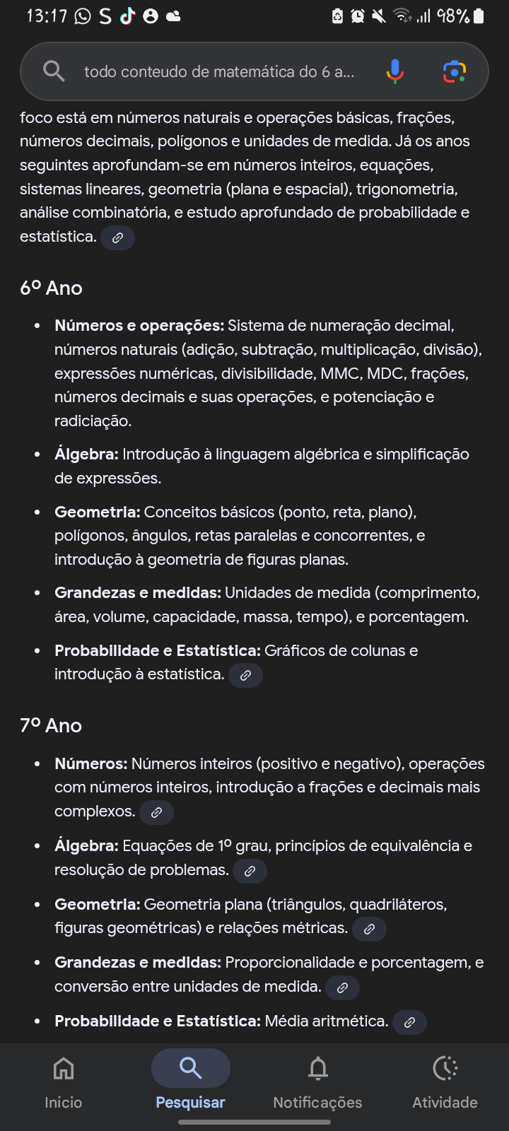 13:17 S 98% todo conteudo de matemática do 6 a... foco está em números naturais e operações básicas, frações, números decimais, polígonos e unidades de medida. Já os anos seguintes aprofundam-se em números inteiros, equações, sistemas lineares, geometria (plana e espacial), trigonometria, análise combinatória, e estudo aprofundado de probabilidade e estatística. 6° Ano Números e operações: Sistema de numeração decimal, números naturais (adição, subtração, multiplicação, divisão), expressões numéricas, divisibilidade, MMC, MDC, frações, números decimais e suas operações, e potenciação e radiciação. Álgebra: Introdução à linguagem algébrica e simplificação de expressões. Geometria: Conceitos básicos (ponto, reta, plano), polígonos, ângulos, retas paralelas e concorrentes, e introdução à geometria de figuras planas. Grandezas e medidas: Unidades de medida (comprimento, área, volume, capacidade, massa, tempo), e porcentagem. Probabilidade e Estatística: Gráficos de colunas e introdução à estatística. 7° Ano Números: Números inteiros (positivo e negativo), operações com números inteiros, introdução a frações e decimais mais complexos. Álgebra: Equações de grau, princípios de equivalência e resolução de problemas. Geometria: Geometria plana (triângulos, quadriláteros, figuras geométricas) e relações métricas. Grandezas e medidas: Proporcionalidade e porcentagem, e conversão entre unidades de medida. Probabilidade e Estatística: Média aritmética. Início Pesquisar Notificações Atividade