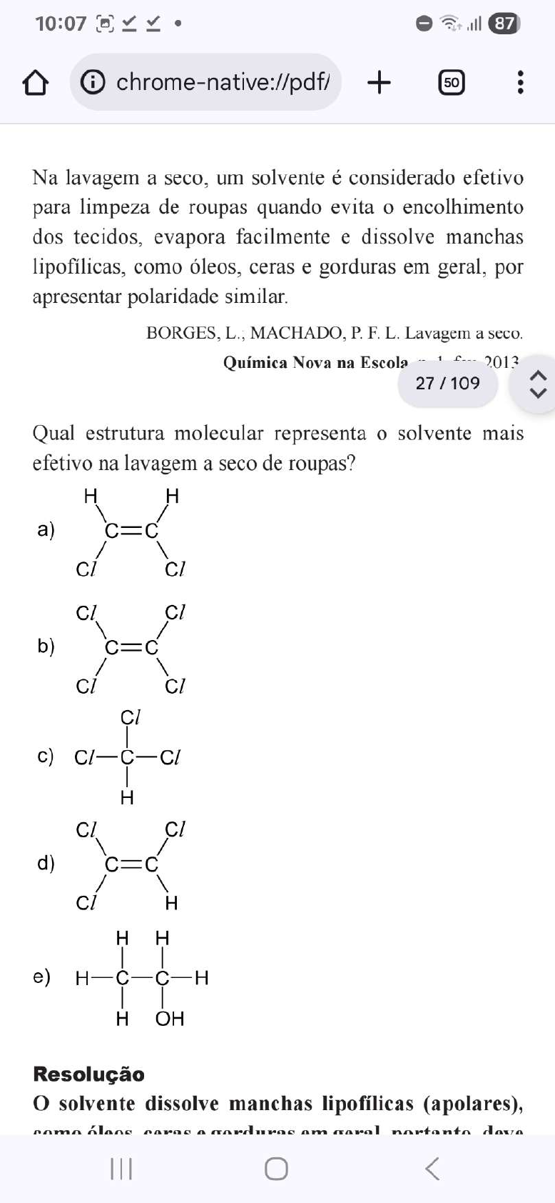 10:07 87 i chrome-native://pdf/ + 50 Na lavagem a seco, um solvente é considerado efetivo para limpeza de roupas quando evita o encolhimento dos tecidos, evapora facilmente e dissolve manchas lipofílicas, como óleos, ceras e gorduras em geral, por apresentar polaridade similar. BORGES, L.; MACHADO, P.F.L. Lavagem a seco. Química Nova na Escola 1 2013 27 / 109 Qual estrutura molecular representa o solvente mais efetivo na lavagem a seco de roupas? H H a) Cl Cl b) Cl Cl c) c H Cl d) C c Cl H H H e) H H H Resolução O solvente dissolve manchas lipofílicas (apolares), como am10:07 87 i chrome-native://pdf/ + 50 113 Após realizar uma inspeção veicular, um cidadão descobre que seu automóvel a gasolina 3000 kg de CO₂ (massa molar 44 g em compensar esse impacto, resolveu plantar árvores nativas do Brasil eficientes na fixação de carbono (massa molar 12 g mol⁻¹). Ao pesquisar espécies nativas para esse fim, encontrou os seguintes dados para a espécie angico-branco: i) cada 1000 m² de plantação dessa árvore correspondem a uma massa arbórea de 3520 kg; ii) sua massa arbórea contém 50% de carbono; e iii) apresenta boa adaptação à região. Disponível em: www.cnpf.embrapa.br. Acesso em: 12 out. 2015 (adaptado). A menor área que o cidadão deve utilizar para a plantação de angico-branco, visando compensar as emissões de é mais próxima de a) 230 m². b) 465 m². c) 850 m². d) 1700 m². e) 2000 m². Resolução Cálculo da massa de C que corresponde a 3000kg de C 44g 12g 3000kg X10:07 87 i chrome-native://pdf/ + 50 Um grupo de pesquisadores realizou um experimento para identificar condições ideais para o crescimento de ervilhas. Utilizaram um solo rico em nutrientes e minerais (nitrogênio orgânico, fosfato, cálcio, potássio). Em um lote, o solo foi esterilizado por calor; em outro, não. Após o cultivo, em co eai de luminosidade e umidade, as plantas cultiv sole esterilizado tiveram um desenvolvimento inferior. A esterilização reduziu, para as ervilhas, a disponibilidade de a) água. b) cálcio. c) fosfato. d) potássio. e) nitrogênio. Resolução A esterilização matou os micro-organismos respon- sáveis pelo ciclo do nitrogênio, reduzindo a disponi- bilidade desse composto no solo. Resposta: E10:07 87 i chrome-native://pdf/ + 50 A evolução das populações envolve processos de variação e adaptação ao longo do tempo, podendo desencadear o surgimento de novas raças ou espécies a partir de uma preexistente. A grande diversidade de organismos presentes em nosso planeta pode ser explicada pela moderna teoria evolucionista, que associa o darwinismo aos conceitos de genética Com base nesses conhecimentos, é possível 22/109 diferencial de genótipos e a formação de raças com diferentes fenótipos, como representado na figura. Lobo cinza Ancestral comum Europa América China Índia do Norte CAIN, M. et al. Discover Biology. Nova York: W.W. Norton & Company, 2002 (adaptado). A formação dessas raças deve-se ao processo de a) deriva genética. b) seleção artificial. c) formação de híbridos.10:07 87 i chrome-native://pdf/ + 50 A transferência de calor por radiação pode ser observada realizando-se a experiência de colocar a mesma quantidade de água quente em dois copos metálicos com as mesmas características, sendo que a superfície externa de um deles é pintada de preto (copo 1), e a do outro é espelhada (copo 2). Sabe-se que todo m mit e absorve energia radiante e que bons também bons absorvedores dessa energia. 1 2 Ao se colocar um termômetro dentro de cada copo observa-se, após alguns minutos, que a temperatura da água a) dos dois copos diminui igualmente. b) do copo 1 diminui, e a do copo 2 permanece a mesma. c) do copo 2 diminui, e a do copo 1 permanece a mesma. d) do copo 1 diminui mais rapidamente do que a do copo 2. e) do copo 2 diminui mais rapidamente do que a do copo 1. Resolução Superfícies de coloração escura são boas absorvedoras e, portanto, boas emissoras de energia térmica radiante. Por sua vez, superfícies espelhadas são más10:07 87 i chrome-native://pdf/ + 50 É comum o álcool ser mencionado como combustível ecologicamente correto, pois, durante sua queima, o ciclo biogeoquímico do carbono apresenta balanço de massa igual a zero. No entanto, o processo de produção da cana-de-açúcar, matéria-prima empregada na indústria sucroalcooleira, faz uso de adubação para melhorar a fertilidade do solo e aumentar a produção. Dentre os principais nutrientes (nitrogênio, fósforo e potássio) que possuem balanço positivo no ciclo biogeoquímico, o nitrogênio é um que merece mais atenção ambiental. Sabe-se que boa parte do nitrogênio ativo desses fertilizantes encontra-se na forma dos íons NH₄⁺ e Por intemperismo e percolação, esses compostos lixiviam para o solo, contaminando rios e lagos. CARDOSO, A. A.; MACHADO, C. M. D.; PEREIRA, E.A. Biocombustível, o mito do combustível limpo. Química Nova na Escola, n. 28, maio 2008 (adaptado). O método de adubação mencionado tem como uma de suas consequências a a) elevação da alcalinidade das águas naturais. b) redução de nutrientes disponíveis, que afeta a vida aquática. c) proliferação de grandes quantidades de algas nos cursos d'água. d) retenção de íons nitrato e amônio nos solos, que diminui suas solubilidades. e) multiplicação de espécies nativas, que mantém o equilíbrio trófico do ecossistema natural. Resolução