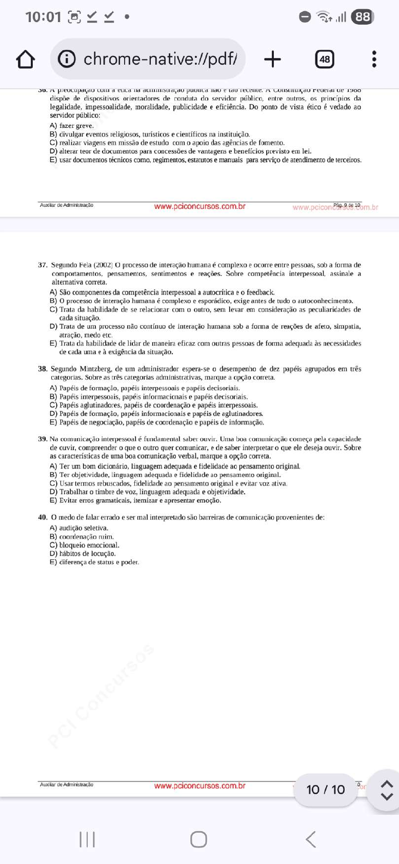 10:01 88 chrome-native://pdf/ + 48 M preocupação com e A 1900 dispõe de dispositivos orientadores de conduta do servidor público, entre outros, princípios da legalidade, impessoalidade, moralidade, publicidade e eficiência. Do ponto de vista ético é vedado ao servidor público: A) fazer greve. B) divulgar eventos religiosos, turísticos e científicos na instituição. C) realizar viagens em missão de estudo com apoio das agências de fomento. D) alterar teor de documentos para concessões de vantagens e benefícios previsto em lei. E) usar documentos técnicos como, regimentos, estatutos e manuais para serviço de atendimento de terceiros. Auxiliar de Administração www.pciconcursos.com.br 37. Segundo Fela (2002) processo de interação humana é complexo e ocorre entre pessoas, sob a forma de comportamentos, pensamentos, sentimentos e reações. Sobre competência interpessoal, assinale a alternativa correta. A) São componentes da competência interpessoal a autocrítica e feedback. B) processo de interação humana é complexo e esporádico, exige antes de tudo autoconhecimento. C) Trata da habilidade de se relacionar com outro, sem levar em consideração as peculiaridades de cada situação. D) Trata de um processo não contínuo de interação humana sob a forma de reações de afeto, simpatia, atração, medo etc. E) Trata da habilidade de lidar de maneira eficaz com outras pessoas de forma adequada às necessidades de cada uma e à exigência da situação. 38. Segundo Mintzberg, de um administrador espera-se desempenho de dez papéis agrupados em três categorias. Sobre as três categorias administrativas, marque a opção correta. A) Papéis de formação, papéis interpessoais e papéis decisoriais. B) Papéis interpessoais, papéis informacionais e papéis decisoriais. C) Papéis aglutinadores, papéis de coordenação e papéis interpessoais. D) Papéis de formação, papéis informacionais e papéis de aglutinadores. E) Papéis de negociação, papéis de coordenação e papéis de informação. 39. Na comunicação interpessoal é fundamental saber ouvir. Uma boa comunicação começa pela capacidade de ouvir, compreender que outro quer comunicar, e de saber interpretar que ele deseja ouvir. Sobre as características de uma boa comunicação verbal, marque a opção correta. A) Ter um bom dicionário, linguagem adequada e fidelidade ao pensamento original. B) Ter objetividade, linguagem adequada e fidelidade ao pensamento original. C) Usar termos rebuscados, fidelidade ao pensamento original e evitar ativa. D) Trabalhar timbre de voz, linguagem adequada e objetividade. E) Evitar erros itemizar e apresentar emoção. 40. medo de falar errado e ser mal interpretado são barreiras de comunicação provenientes de: A) audição seletiva. B) coordenação ruim. C) bloqueio emocional. D) hábitos de locução. E) diferença de status e poder. Auxiliar de Administração www.pciconcursos.com.br10:01 88 i chrome-native://pdf/ + 48 B) secretos. C) reservados. D) confidenciais. E) ultra secretos. Auxiliar de Administração www.pciconcursos.com.br 31. conjunto de medidas e estratégias de ordem administrativa política e operacional que contribue direta ou indiretamente para a preservação da integridade dos materiais, se refere ao conceito de: A) restauração. B) diagnóstico. C) conservação. D) preservação. E) avaliação de documentos. 32. Um dos principais instrumentos de trabalho que tem como objetivo demonstrar para os profissionais envolvidos na gestão de documentos registro do ciclo de vida dos documentos, prazo de guarda, transparência, recolhimento, eliminação e reprodução de documentos refere-se a: A) Guia de classificação. B) Tabela de equivalência. C) Tabela de temporalidade. D) Guia de avaliação de documentos. E) Tabela de classificação de documentos. 33. Órgão vinculado ao Arquivo Nacional que define a política nacional de arquivos, criado pela lei 8.159/91. A) SINAR Sistema Nacional de Arquivos. B) CONARQ Conselho Nacional de Arquivos. C) CPAD Comissão Permanente de Avaliação de documento. D) SIGAD Sistema Informatizado de Gestão Arquivista de Documentos. E) SIGA Sistema de Gestão de Documentos de Arquivo da Administração Pública Federal. 34. Refletindo pensamento de Hely Lopes Meireles, "o agente administrativo como ser humano dotado de capacidade de atuar deve, necessariamente, distinguir bem do mal, honesto do desonesto". Dentre as alternativas assinale a opção em que a tomada de decisão ética está relacionada a uma abordagem da justiça: A) falsificar assinatura ou autenticação de documento público ou privado para proveito próprio. B) facilitar recebimento de benefícios a que tem direito utilizando famoso "jeitinho brasileiro". C) acessar sites de relacionamentos durante horário de trabalho. D) contestar normas e valores institucionais. E) falar mal do companheiro de trabalho. 35. As éticas normativas usam várias abordagens nas descrições dos valores para direcionar a tomada de decisão ética. As quatro abordagens que são relevantes para os gerentes são: a utilitária, a individualista, a moral e a da justiça. Sobre a abordagem da moral, assinale a alternativa correta. A) o direito à privacidade significa direito de viver sem ameaças violação de saúde e segurança. B) Os indivíduos não poderão abster-se de realizar qualquer ordem simplesmente porque não concordam. C) direito à privacidade é limitado, indivíduo não pode fazer que quiser só porque está longe do trabalho. D) direito à privacidade permite ao indivíduo ser tratado apenas da maneira que ele consciente e livremente consente. E) Os indivíduos têm direito à privacidade, ou seja, escolhem fazer que quiserem longe do trabalho e têm controle das informações sobre suas vidas particulares. 36. A preocupação com a ética na administração pública não é tão recente. A Constituição Federal de 1988 dispõe de dispositivos o