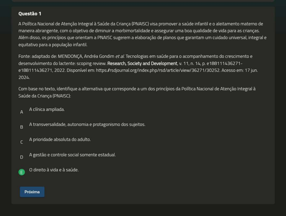 Questão 1 A Política Nacional de Atenção Integral à Saúde da Criança (PNAISC) visa promover a saúde infantil e aleitamento materno de maneira abrangente, com objetivo de diminuir a morbimortalidade e assegurar uma boa qualidade de vida para as crianças. Além disso, os princípios que orientam a PNAISC sugerem a elaboração de planos que garantam um cuidado universal, integral e equitativo para a população infantil. Fonte: adaptado de: MENDONÇA, Andréa Gondim et al. Tecnologias em saúde para 0 acompanhamento do crescimento e desenvolvimento do lactente: scoping review. Research, Society and Development, V. 11, n. 14, e 188111436271- e188111436271, 2022. Disponível em: https:/rsdjournal.org/index.php/rsd/article/view/36271/30252 Acesso em: 17 jun. 2024. Com base no texto, identifique a alternativa que corresponde a um dos princípios da Política Nacional de Atenção Integral à Saúde da Criança (PNAISC): A A clínica ampliada. A transversalidade, autonomia e protagonismo dos sujeitos. A prioridade absoluta do adulto. D A gestão e controle social somente estadual. 0 direito à vida e à saúde. E PróximaQuestão 2 No primeiro minuto após nascimento, a equipe médica avaliou recém-nascido utilizando os critérios do índice de Apgar. A criança apresentou frequência cardíaca abaixo de 100 batimentos por minuto, esforço respiratório irregular, tônus muscular com alguma flexão dos membros, irritabilidade reflexa com alguma reação a estímulos e pele predominantemente rósea, mas com extremidades cianóticas. Com base no relato de caso, assinale a alternativa que corresponde ao escore de Apgar do paciente apresentado: Escore de 6. A Escore de 10. B Escore de 5. Escore de 3. D Escore de 7. E Anterior PróximaQuestão 3 "As situações de violência podem ser bastante deletérias à saúde das pessoas ao longo dos anos, que aumenta a importância de orientar ações e pactuar estratégias para atenção integral à saúde de crianças, adolescentes e suas famílias, articuladas com as políticas sociais e de direitos humanos. [...] No âmbito da saúde, a questão necessita ser abordada focalizando olhar sobre as pessoas que sofrem violência, com vistas a prestar tanto atendimento adequado e alívio do sofrimento quanto a pensar nos modos de prevenir as ocorrências e no sentido de construir uma forma ampliada de fazer a saúde e promover uma sociedade saudável". Fonte: EGRY, Emiko Yoshikawa et al. Enfrentar a violência infantil na Atenção Básica: como os profissionais percebem? Revista Brasileira de Enfermagem, V. 70, 119-125, 2017. Disponível em: em: 18 jun. 2024. Com base nas informações apresentadas sobre políticas de saúde e a abordagem integral à saúde de crianças em situações de violência, analise as afirmativas a seguir: I. A criança vítima de violência recebe apoio psicossocial e proteção judicial contra os agressores. II. profissional de saúde deve notificar as autoridades competentes ao detectar um caso de violência. III. conceito de cuidar na saúde da criança envolve a coordenação entre diferentes esferas de governo. IV. A criança exposta à violência desenvolve mecanismos eficazes que a protege de problemas psicológicos futuros. É correto 0 que se afirma em: A III e IV, apenas. I, II e III, apenas. II, III e IV, apenas. D II e III, apenas. E I e IV, apenas. Anterior PróximaQuestão 4 No hospital central da cidade, uma equipe médica acompanhou nascimento de um bebê. Às 16h05min, a criança nasceu, e os profissionais de saúde começaram a avaliar suas condições de saúde. No quinto minuto de vida, eles registraram as seguintes observações: a frequência cardíaca do bebê estava acima de 100 bpm, esforço respiratório era irregular, tônus muscular demonstrou boa movimentação, a irritabilidade reflexa apresentava alguma reação, e 0 corpo era róseo, embora as extremidades estivessem cianóticas. Com base no relato de caso, assinale a alternativa que corresponde ao escore de Apgar do paciente apresentado: Escore de 3. A Escore de 9. B Escore de 11. Escore de 7. D Escore de 1. E Anterior PróximaQuestão 5 Jenner, um médico e naturalista britânico, possuía uma ampla gama de interesses e conduziu pesquisas em diversos campos. No entanto, ele é mais famoso por seu papel crucial no desenvolvimento, sistematização e validação da primeira vacina cientificamente registrada na história da medicina ocidental. Suas experimentações foram de enorme importância para a medicina, introduzindo e aprimorando método experimental. Essas contribuições também lançaram as bases para desenvolvimento da microbiologia e imunologia. Fonte: adaptado de: DOS ANJOS DURÃES, F. A.; DE OLIVEIRA, A. D.; MONTEIRO, P.H.N. Edward Jenner e a Primeira Vacina: estudo do discurso expositivo adotado num Museu de Ciência: estudo do discurso expositivo adotado num Museu de Ciência. Khronos, n. 7, p. 15-15, 2019. Disponível em: Acesso em: 19 jun. 2024. Com base no texto, assinale a alternativa que corresponde à vacina criada por Jenner: Vacina da Varicela. A B Vacina da Dengue. Vacina da Covid- 19. Vacina da Varíola. D Vacina da Febre amarela. E Anterior PróximaQuestão 6 Em 1878, Tarnier convocou um funcionário do Zoológico de Paris para projetar uma incubadora similar à utilizada no zoológico para chocar ovos de galinha. Em 1880, Tarnier revelou sua própria incubadora, que passou a ser conhecida pelo seu nome. A incubadora de Tarnier era composta por uma caixa de madeira com dois compartimentos: um superior, onde recém-nascido era colocado, e um inferior, que abrigava botijas com água quente. Posteriormente, médico Auvard realizou modificações no design original. No modelo de Auvard, a água aquecida era armazenada em um depósito, ao invés das botijas utilizadas no modelo de Tarnier. Fonte: adaptado de: DOS SANTOS OLIVEIRA, I. C. advento das incubadoras e os cuidados de enfermagem aos prematuros na primeira metade 